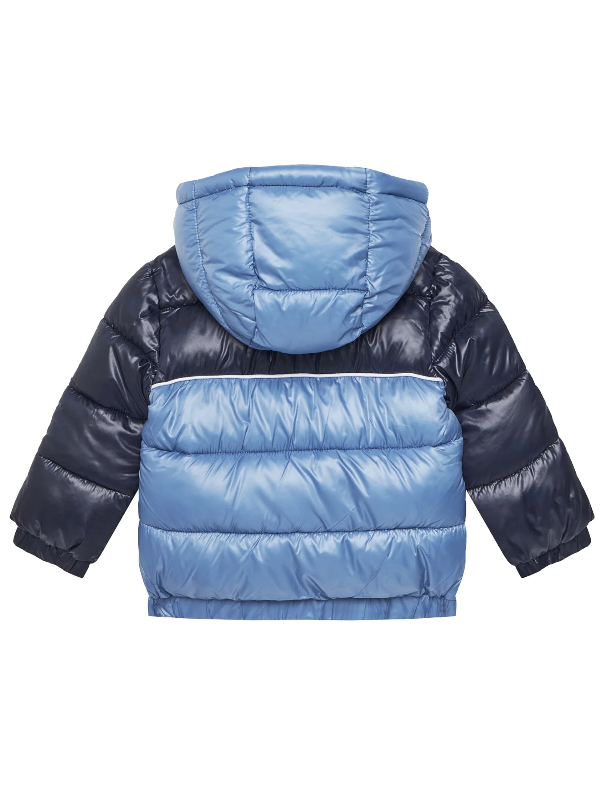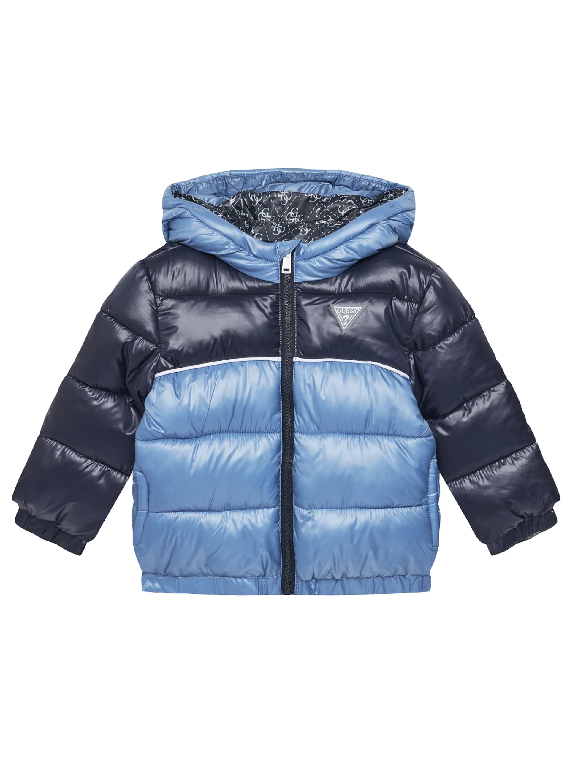 Piumino Guess blu e celeste da bambino full zip con cappuccio N5YL00WEGY0, realizzato con imbottitura eco-friendly. Questa giacca Guess blu ha il cappuccio fisso, la chiusura full zip centrale, il patch Guess applicato lato cuore, polsini e fondo elasticizzati.