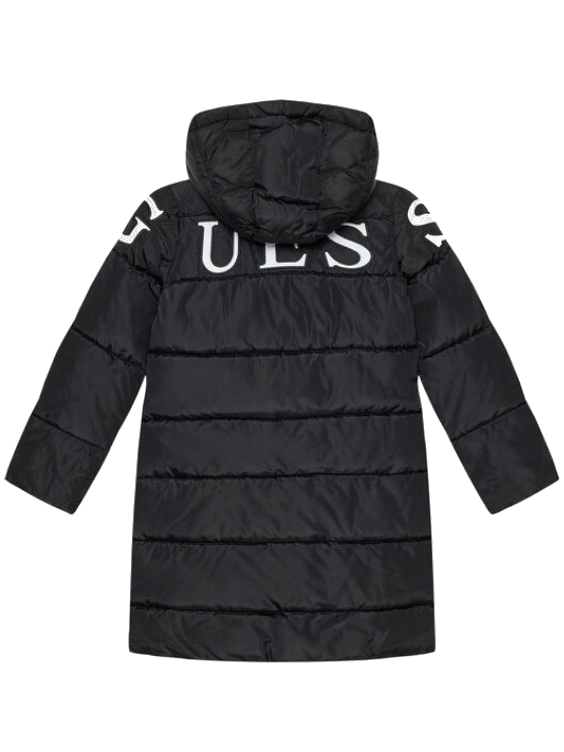 Piumino Guess lungo nero da bambina con cappuccio removibile Padded Long Puffer. Questo giubbino Guess realizzato da un tessuto trapuntato caldo, morbido ed avvolgente perfetto per i primi freddi invernali. Questo piumino da bambina nero Guess è caratterizzato dalla chiusura centrale full zip con doppio cursore, due tasche laterali con zip, cappuccio removibile, maxi scritta in bianco Guess sul retro, polsini e fondo regolari