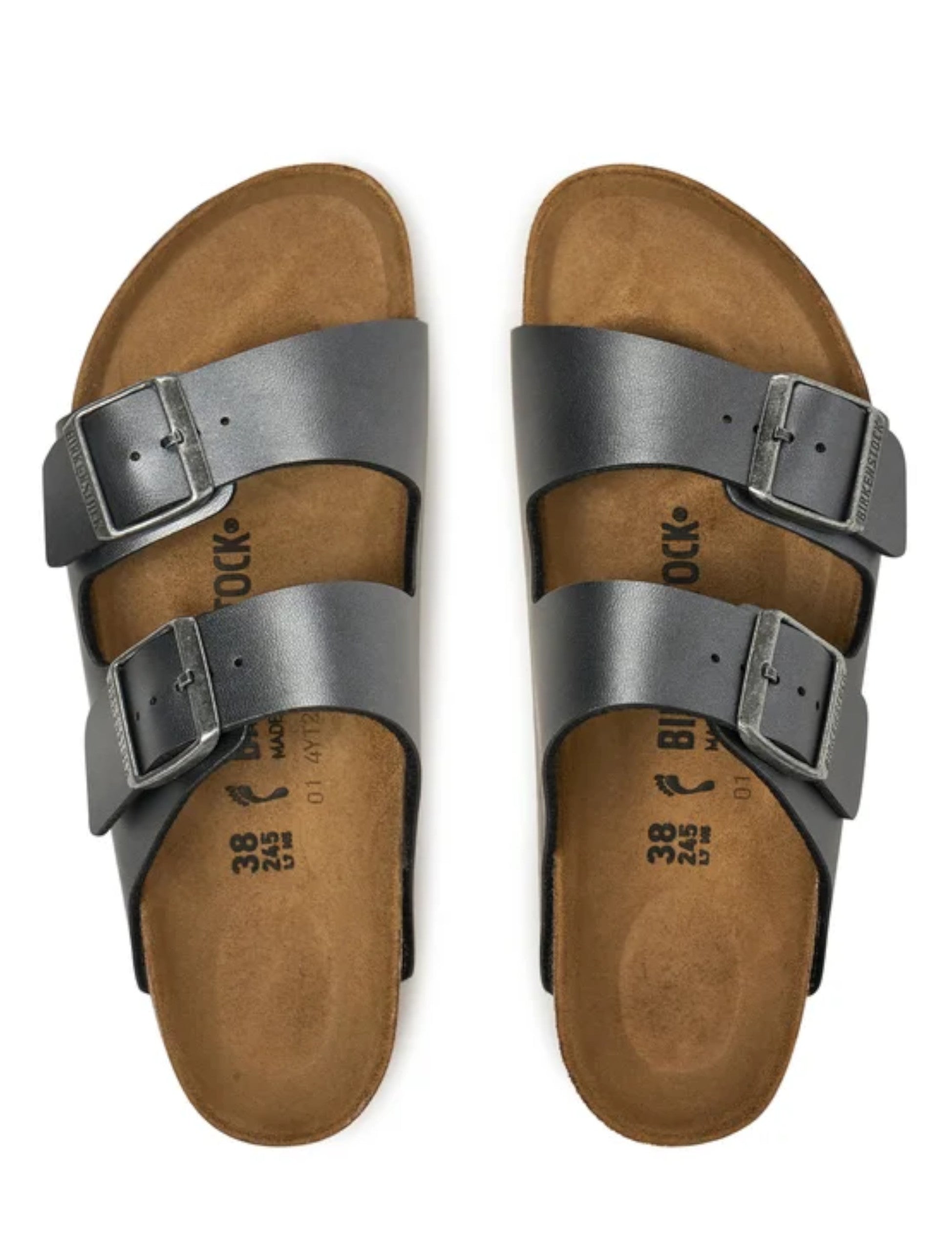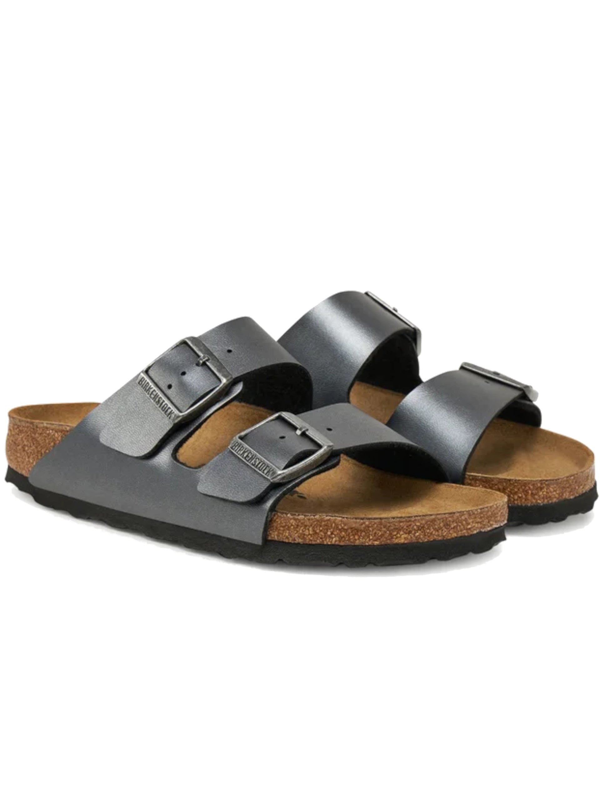 Questi sandali Birkenstock nero metallico hanno la tomaia in pelle con doppio cinturino regolabile con fibbia metallica, la soletta ergonomica in sughero per il miglior alloggio del piede e la suola in EVA per la più elevata sensazione di comfort.