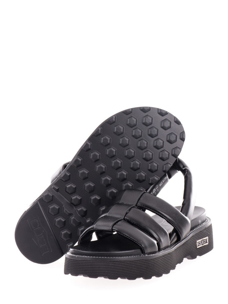 Sandali Cult neri da donna, modello Ziggy CLW389. Questi sandali Cult neri hanno la tomaia in vera pelle, la suola in EVA e il battistrada con texture esagonale. Sul davanti di questi Cult donna troviamo una catenina decorativa sotto la soletta, tre fasce imbottite e la suola in EVA arricchita dal logo metallico a contrasto colore.