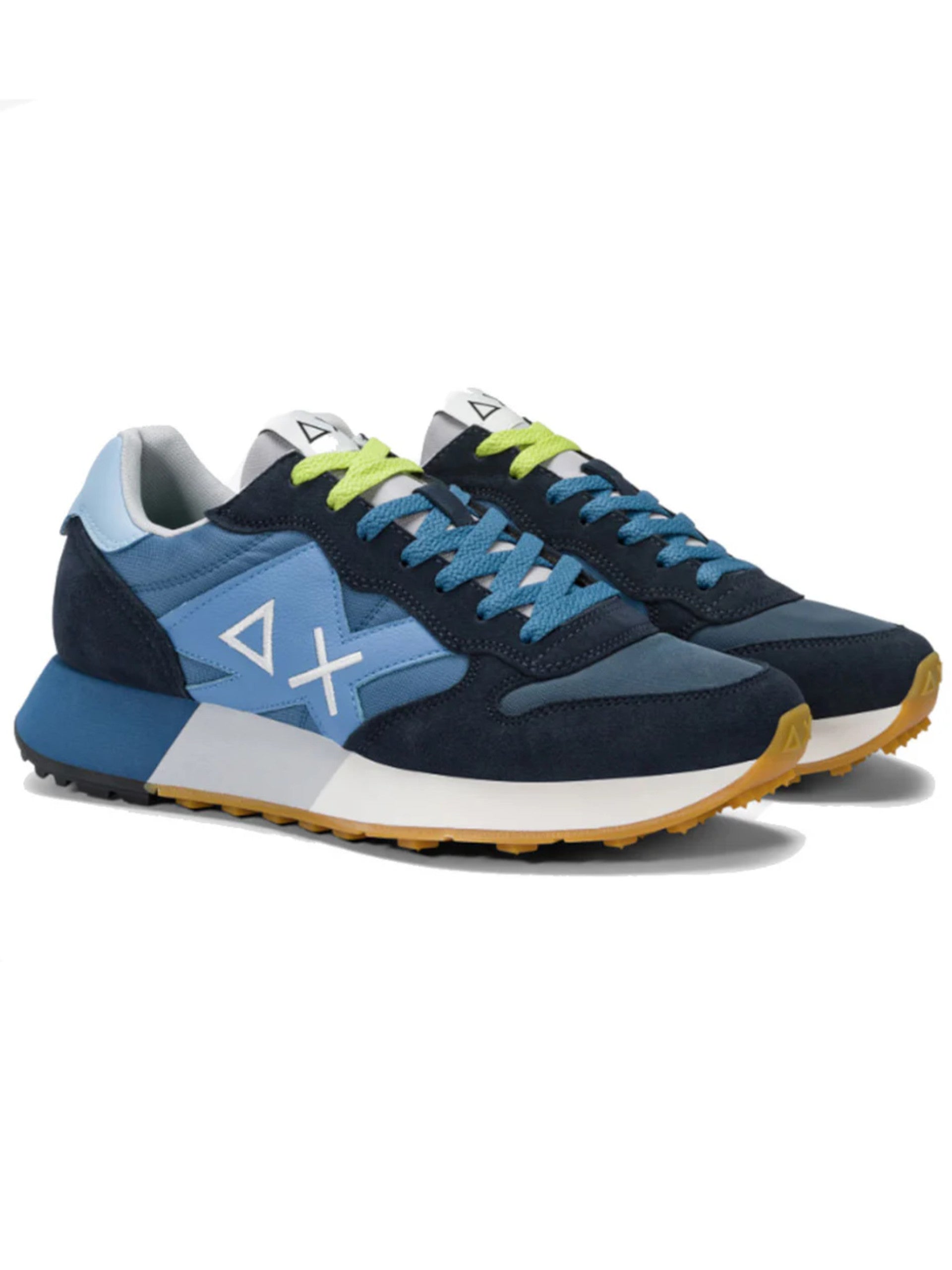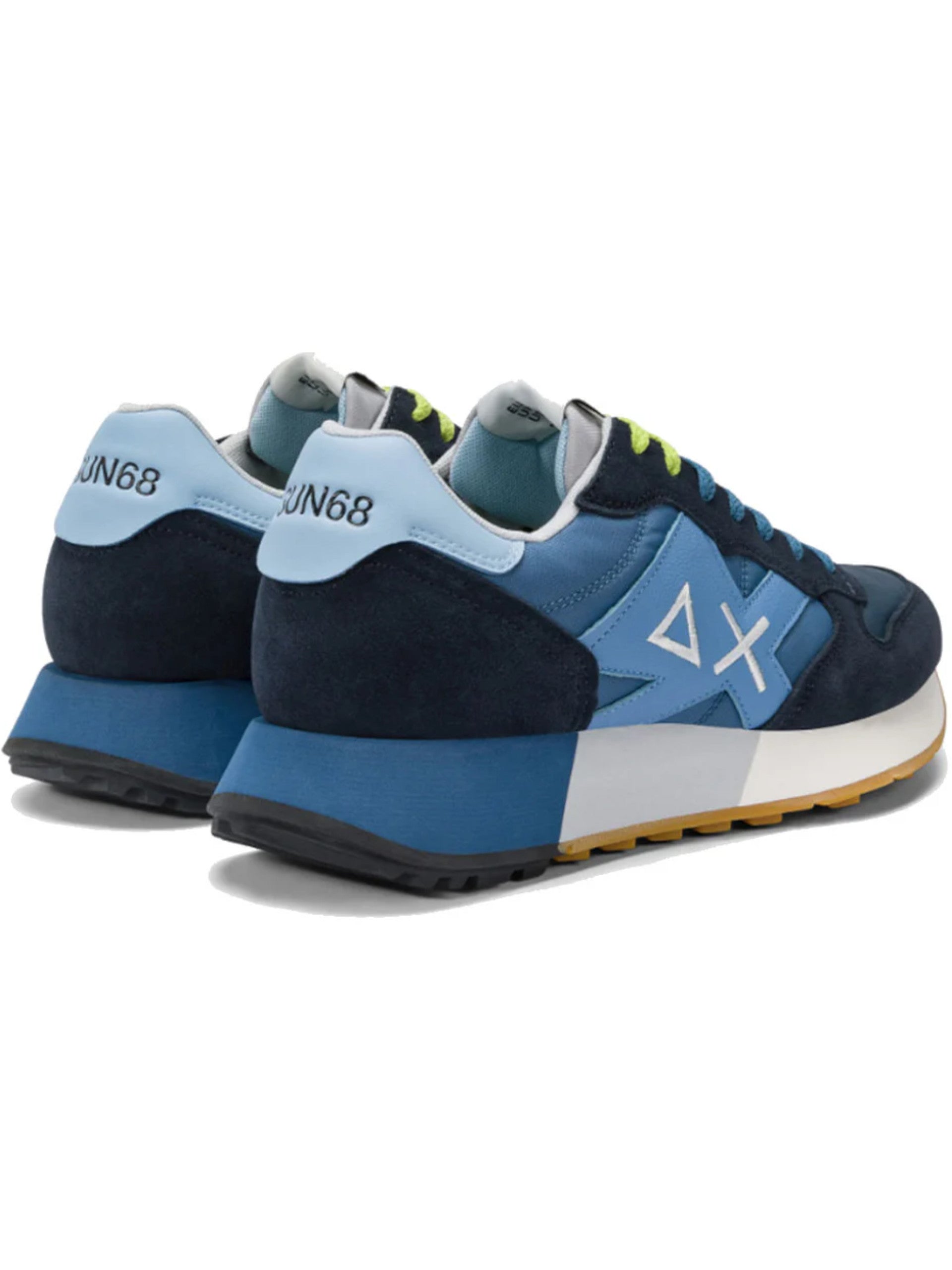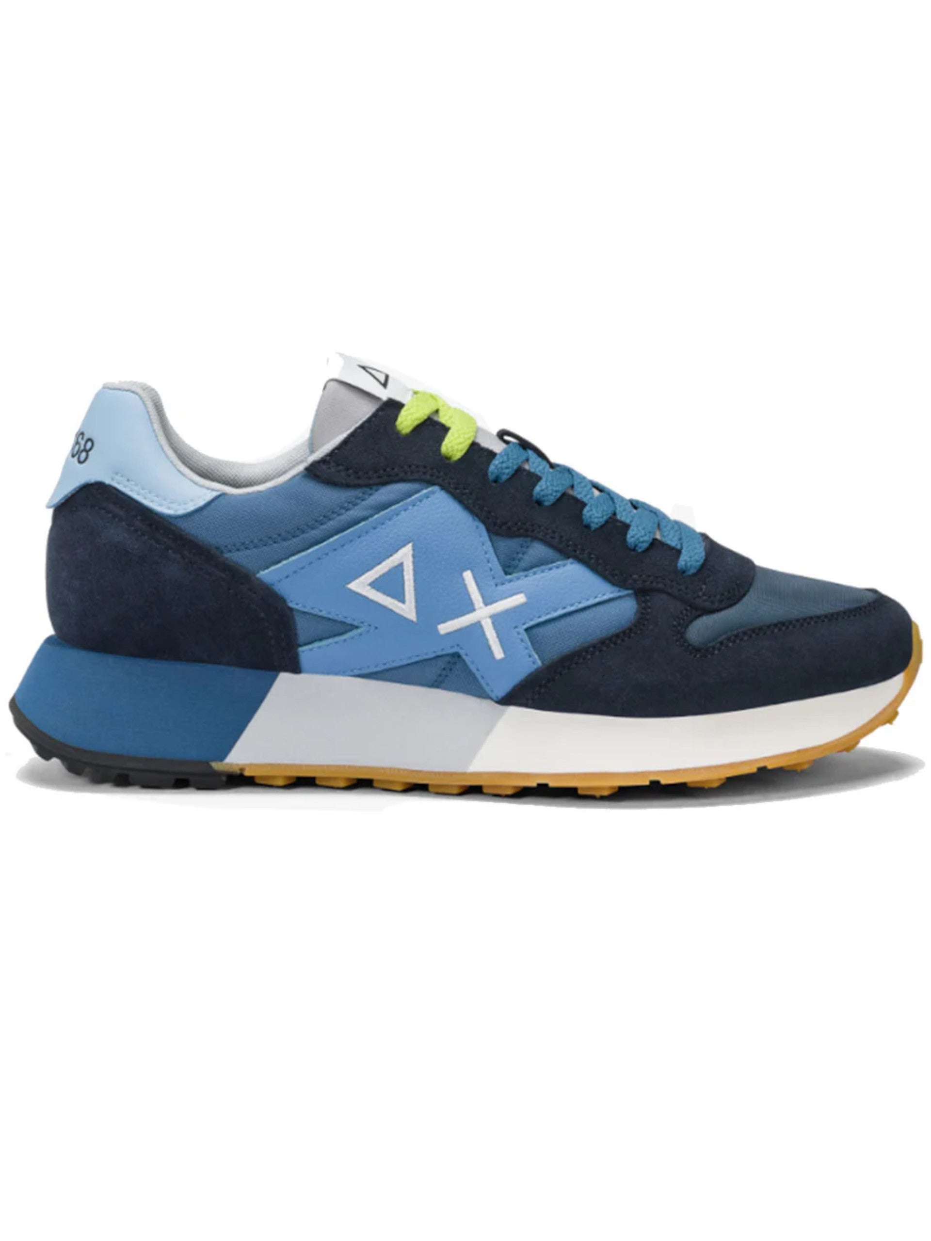 Scarpe SUN68 blu Jaki 2.0 Bicolor da uomo Z35112. Queste sneakers Sun68 blu hanno la tomaia in mesh con inserti in suede e la suola rinforzata in gomma con battistrada geometrico. Sul davanti di queste scarpe Sun68 troviamo la classica chiusura a lacci, l'iconico logo del brand con triangolo e croce a contrasto colore e il lettering 'SUN68' sul tallone.