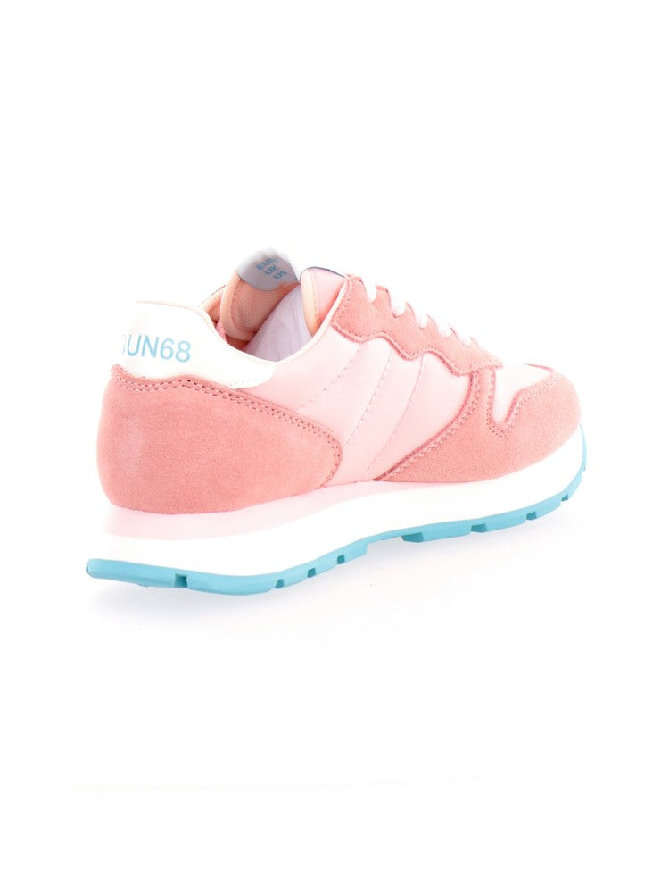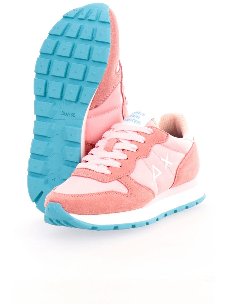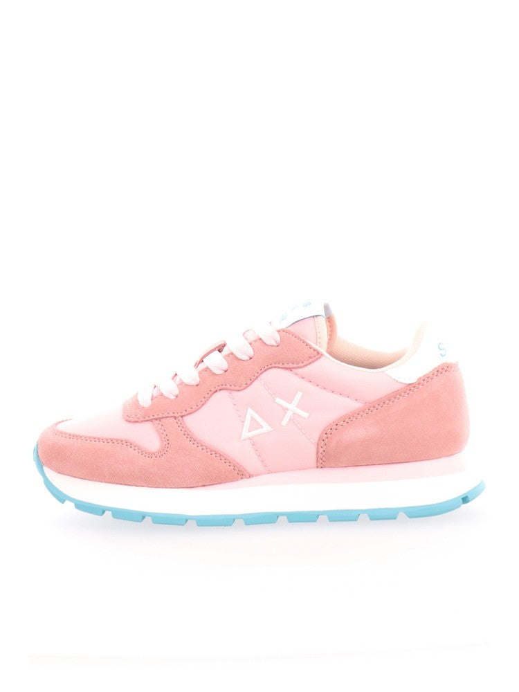 Scarpe Sun68 rosa da donna Ally Solid Nylon Z34201. Queste sneakers Sun68 rosa hanno la tomaia in mesh con inserti in tessuto e la suola rinforzata in gomma con battistrada geometrico. Sul davanti diqueste scarpe Sun68 troviamo la classica chiusura a lacci, l'iconico logo del brand con triangolo e croce a contrasto colore e il lettering 'SUN68' sul tallone.