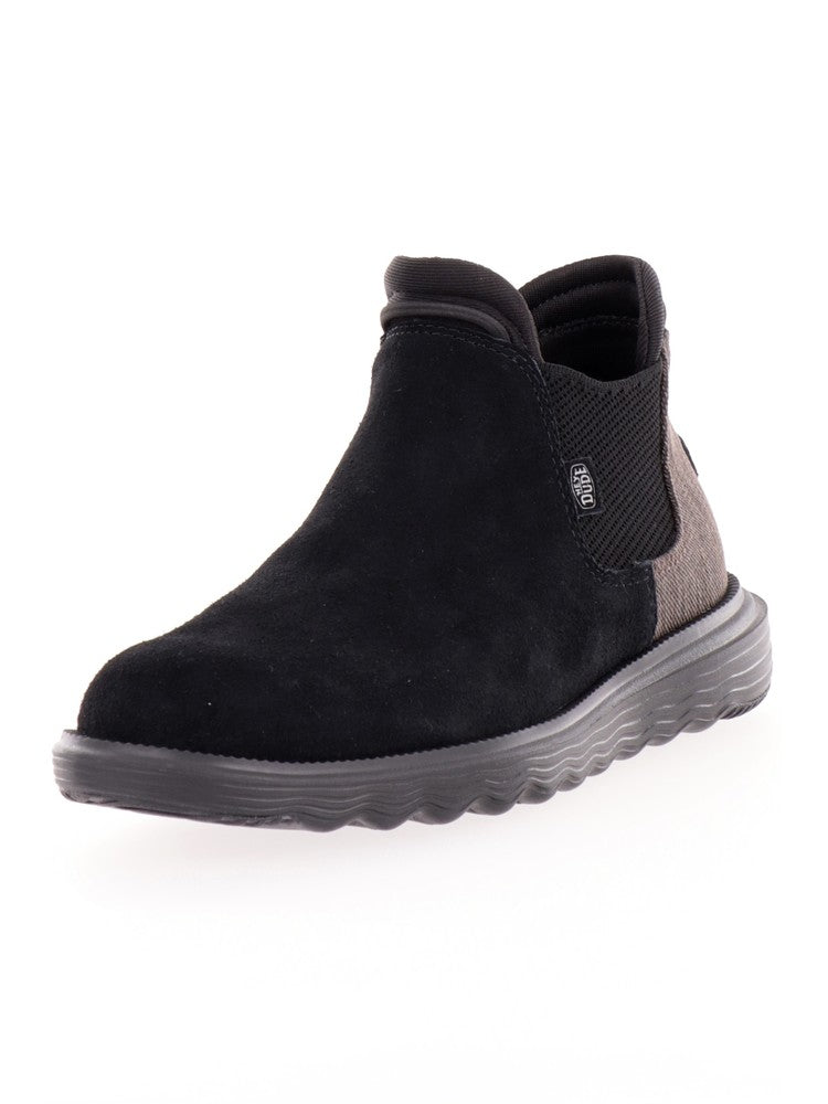 Stivali Hey Dude neri da donna Branson Boot Suede 40389. Questi stivaletti Hey Dude neri hanno la tomaia in pelle scamosciata, la suola in EVA per il massimo comfort e la soletta rimovibile in memoryfoam. Sul davanti di queste scarpe Hey Dude troviamo la 'chiusura' slip on e il patch del brand applicato sulla zona tallonare a contrasto colore.