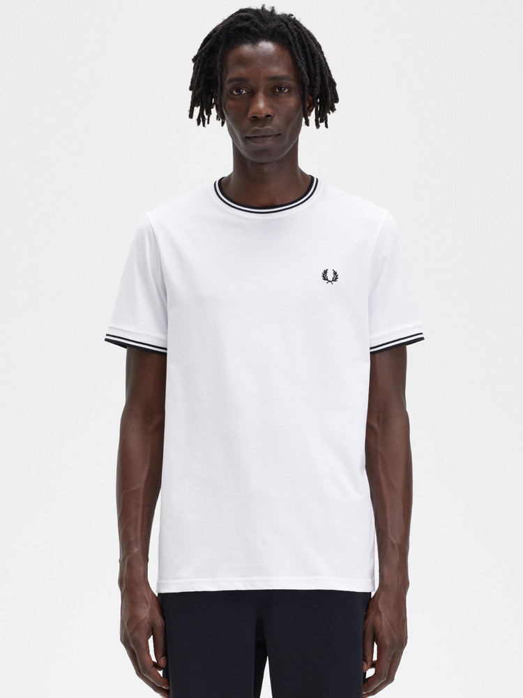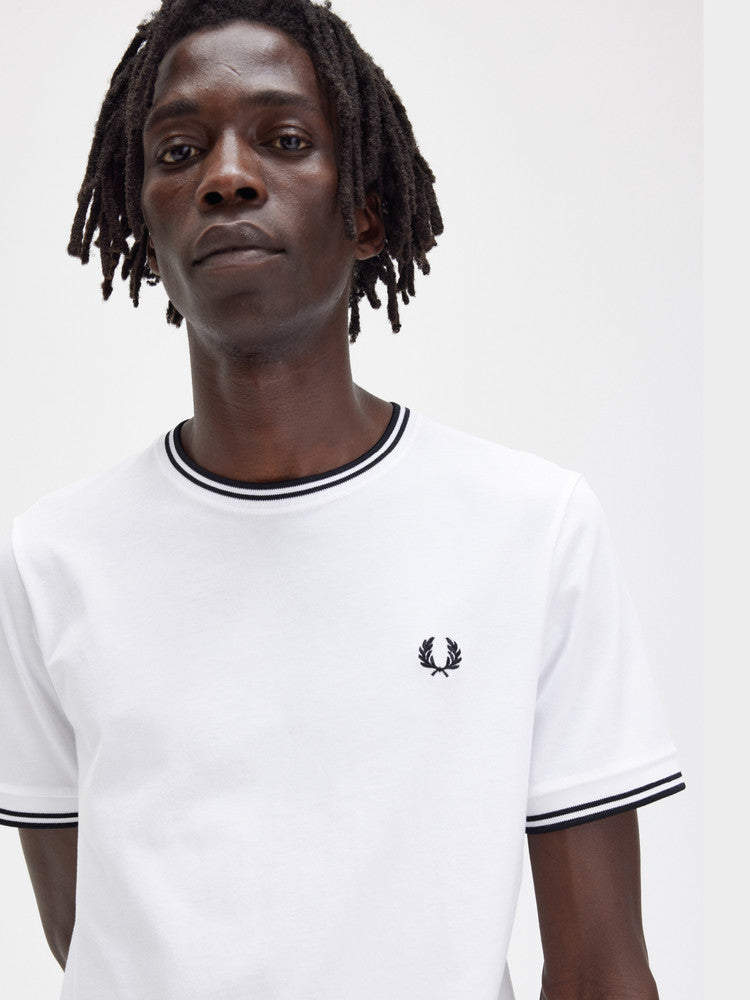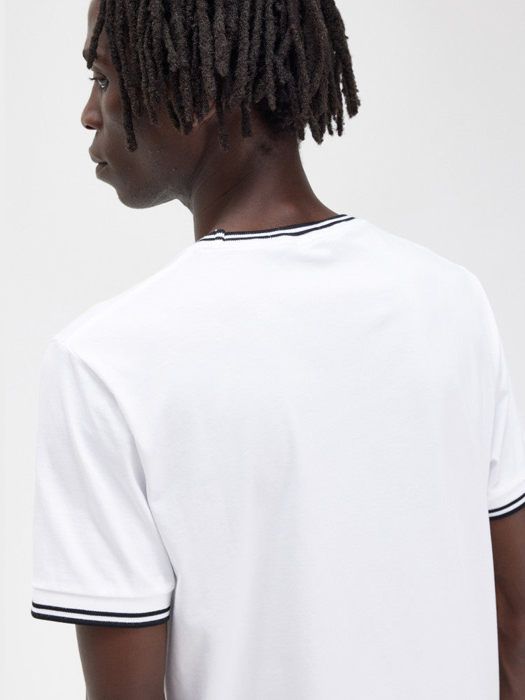 T-shirt Fred Perry, Twin Tipped bianca da uomo, girocollo con doppia banda su colletto e bordo manica M1588