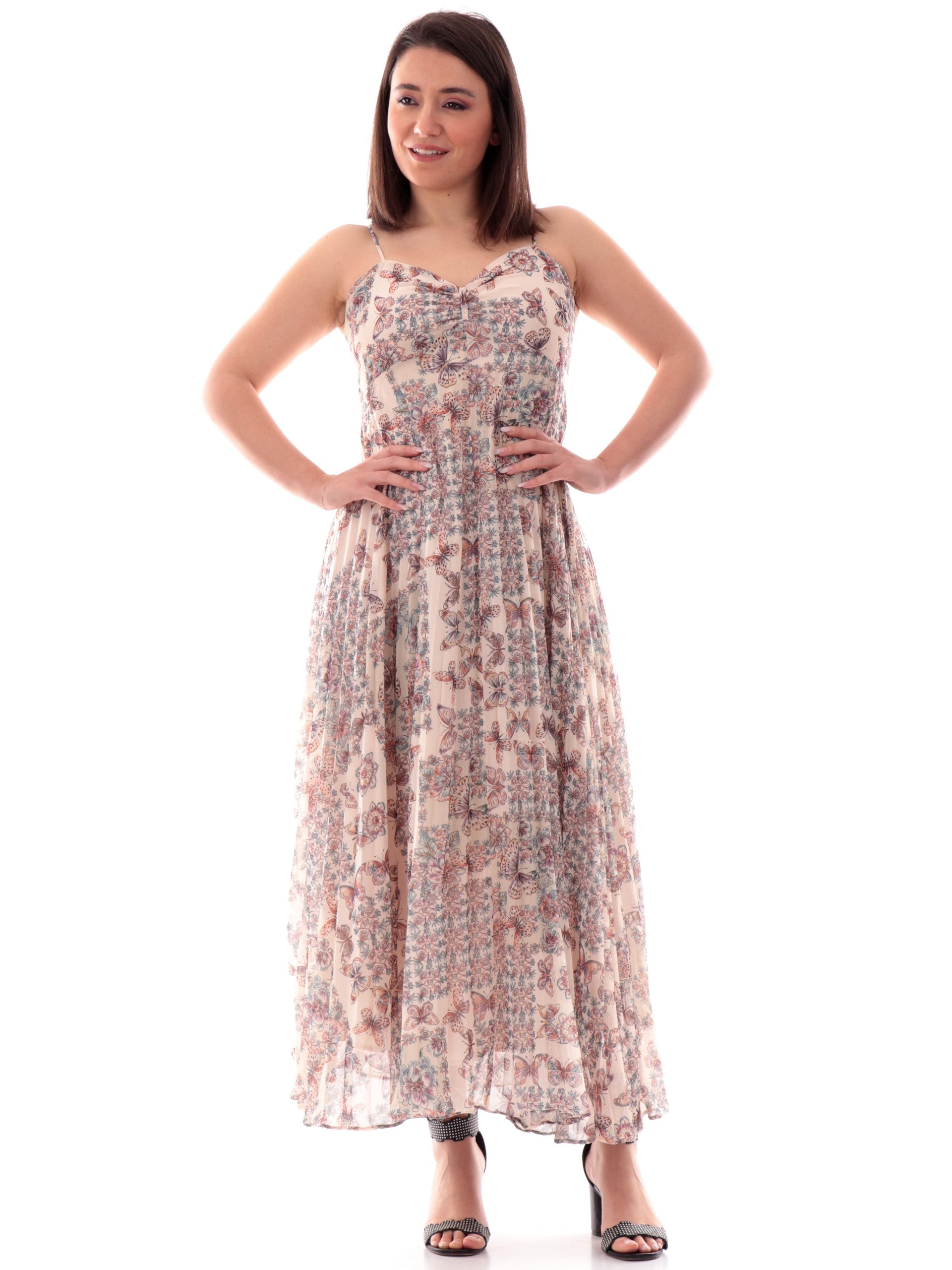 Vestito floreale Molly Bracken beige da donna spalle scoperte P1787DE. Questo abito Molly spalle scoperte ha le bretelle regolabili, la chiusura full zip sul lato posteriore, la fantasia floreale allover e il fondo svasato.