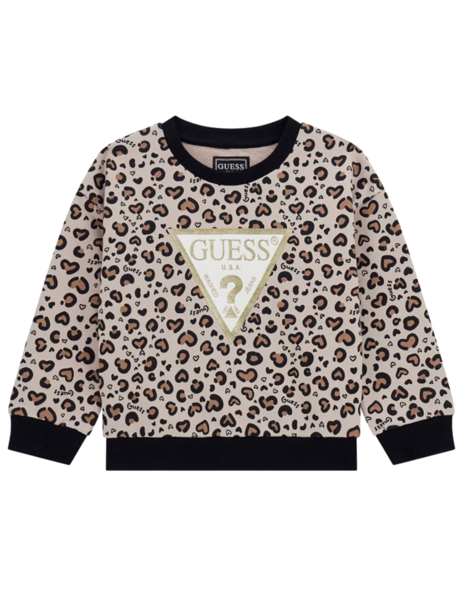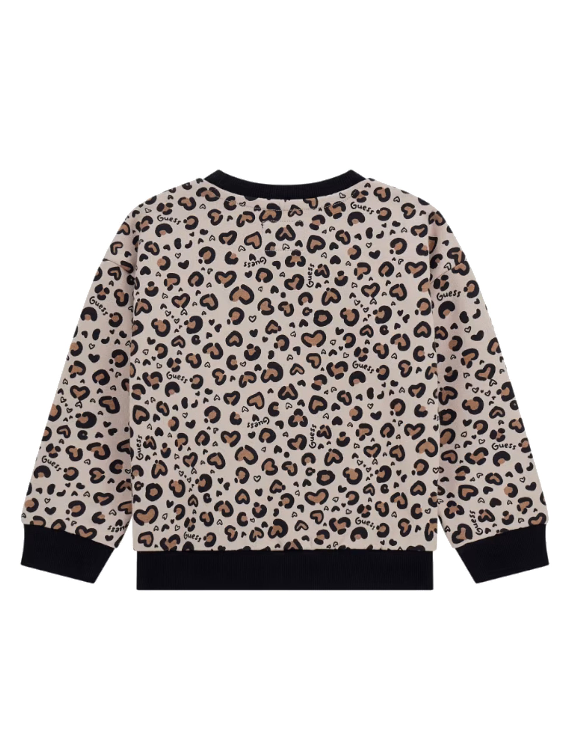 Felpa Guess leopardata da bambina. Questa felpa Guess da Bambina 100% cotone è caratterizzata dalla fantasia animalier con il maxi logo centrale con i glitter, girocollo e le maniche lunghe con polsini elasticizzati