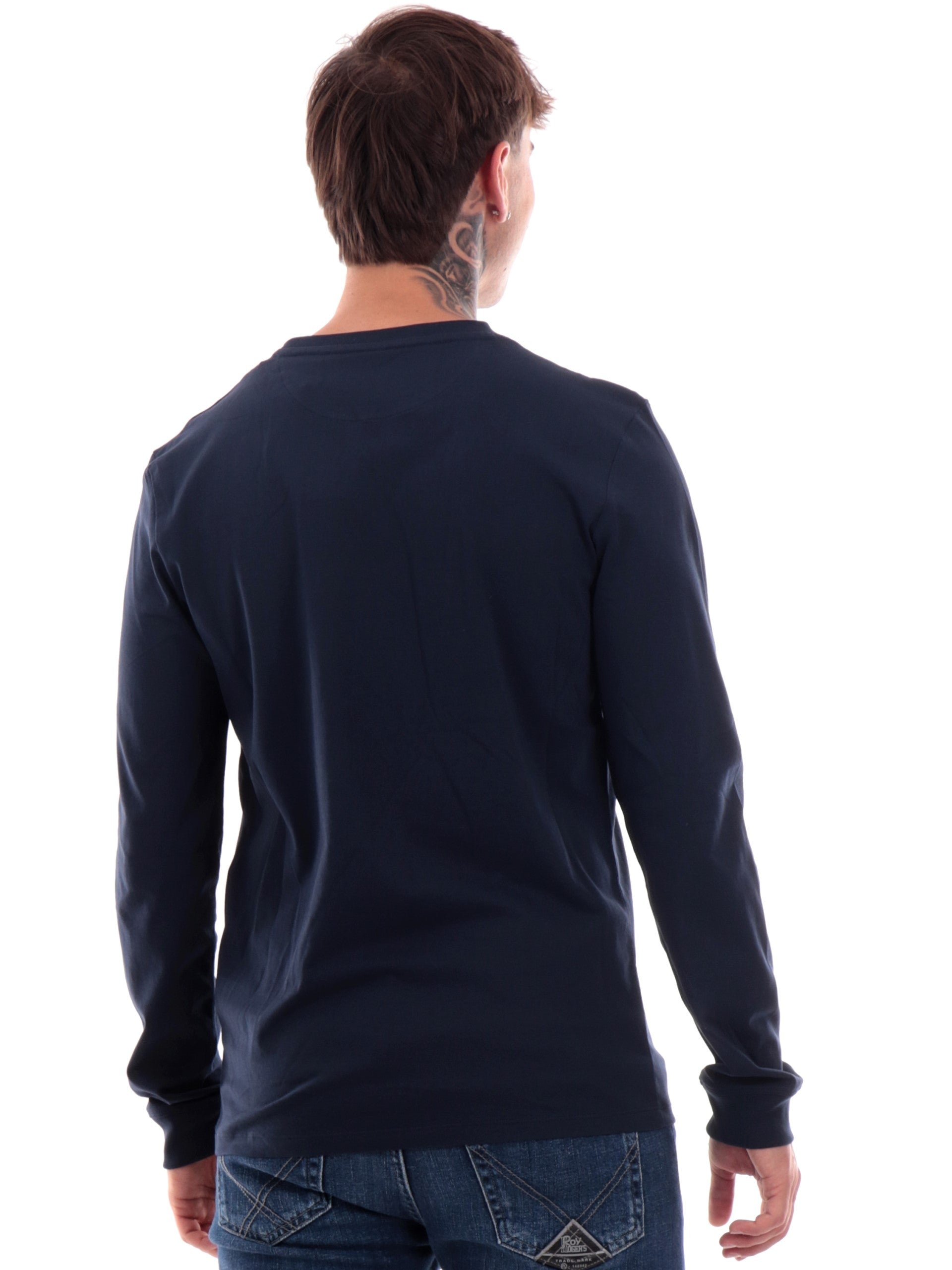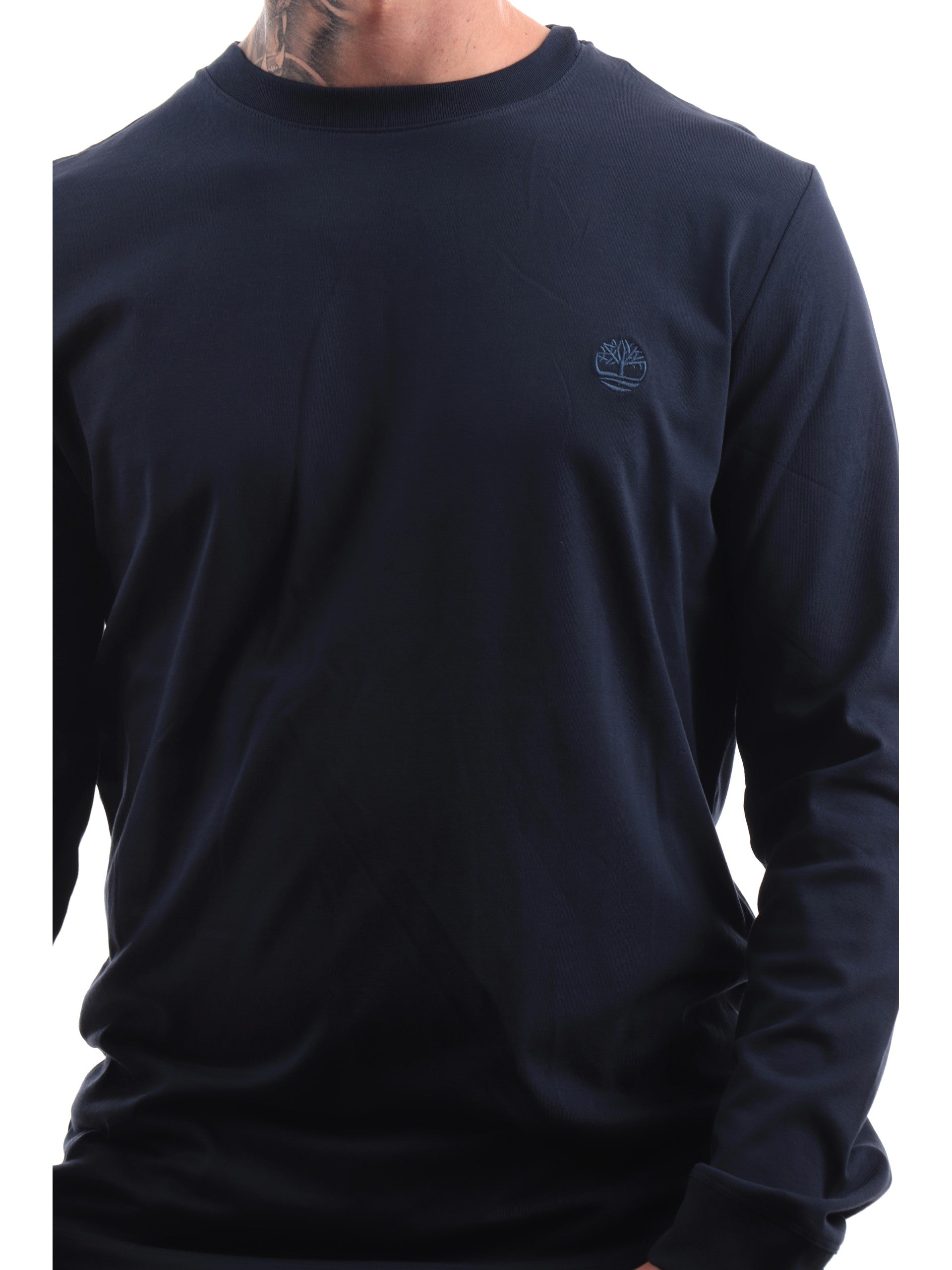 Maglia Timberland blu da uomo Dunstan River TB0A2BQ3, realizzata in 100% puro cotone. Questa t-shirt Timberland blu ha il girocollo realizzato in tessuto a costine, le maniche lunghe, il fondo regolare e il logo del brand ricamato sul cuore a contrasto colore.