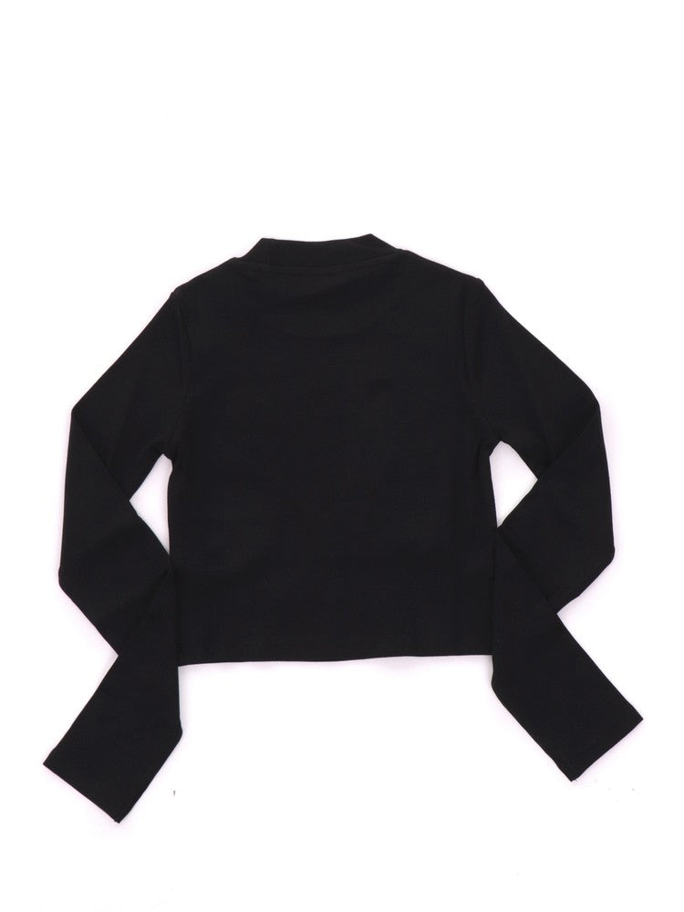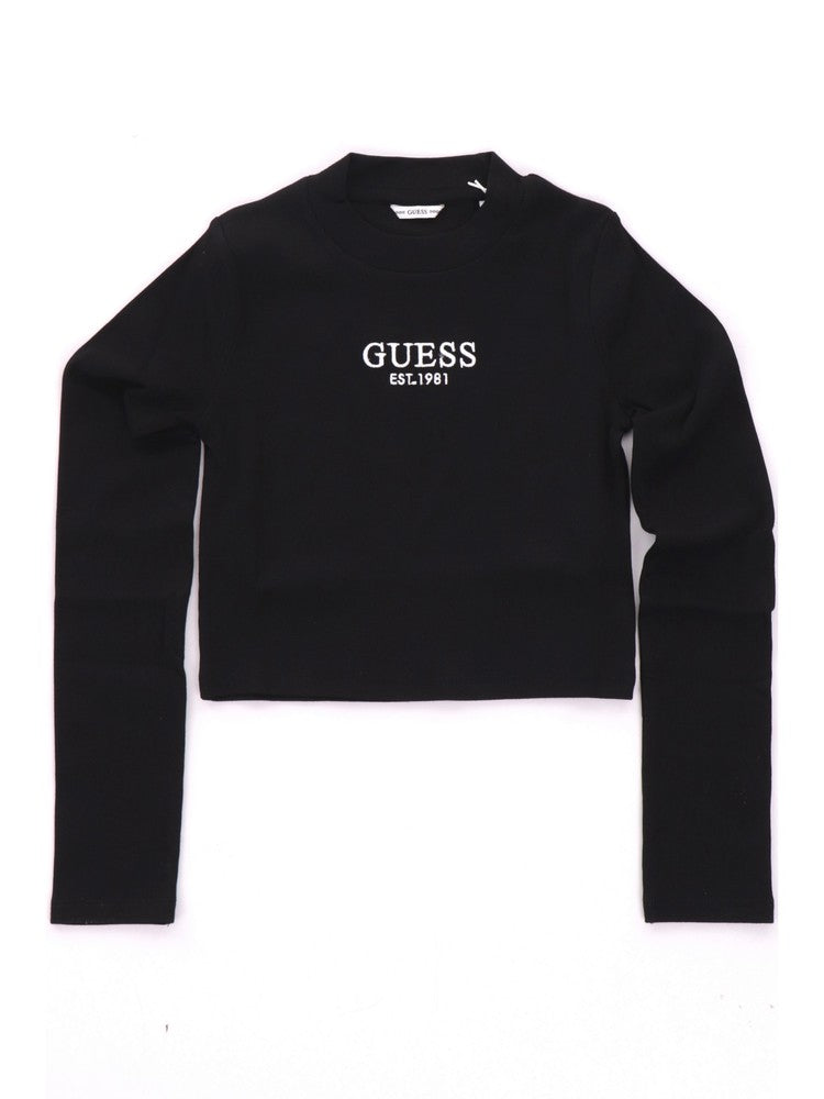 Maglia Guess nera da bambina J4YI49KBZP4, realizzato in tessuto a costine. Questo maglia Guess nera girocollo ha le maniche lunghe, la vestibilità crop e il logo del brand ricamato sul davanti a contrasto colore.