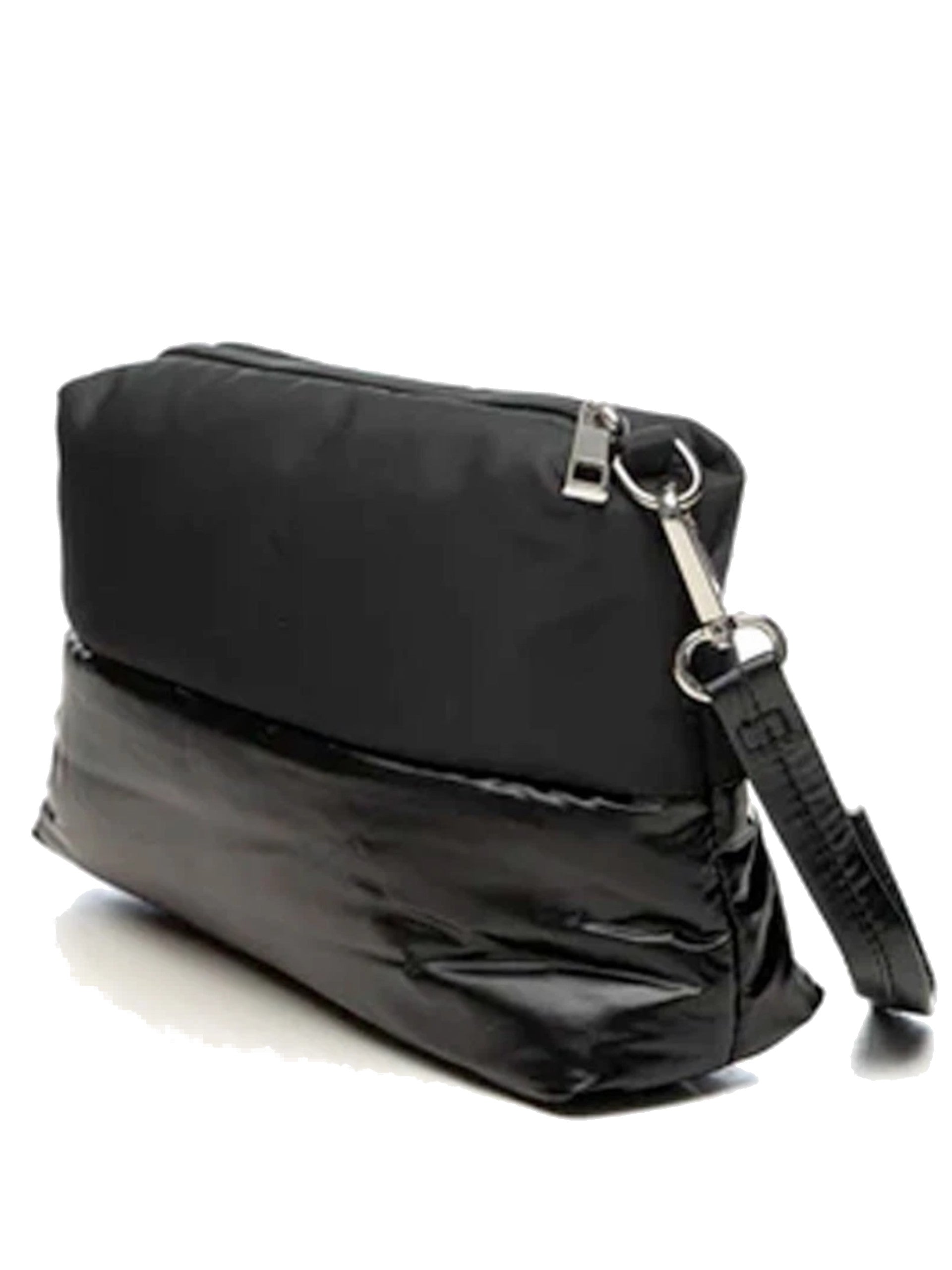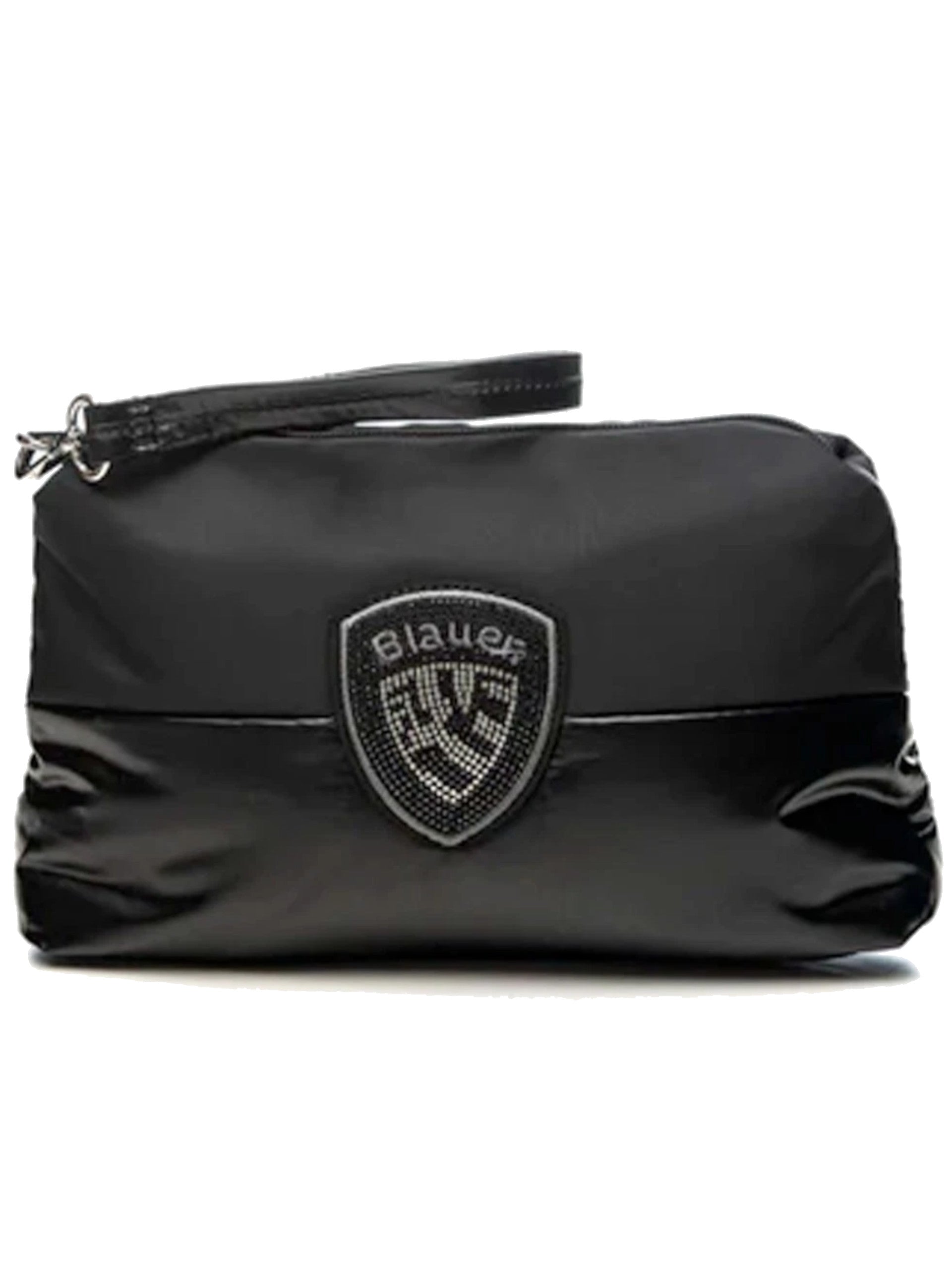 Pochette Blauer donna nera Mira01. Questa pochette Blauer è realizzata in tessuto piumino, sul davanti troviamo il logo del brand con strass e con laccetto removibile per portarla comodamente a mano. Questa borsa Blauer è caratterizzata da un unico scomparto con chiusura zip e una tasca con cerniera.
