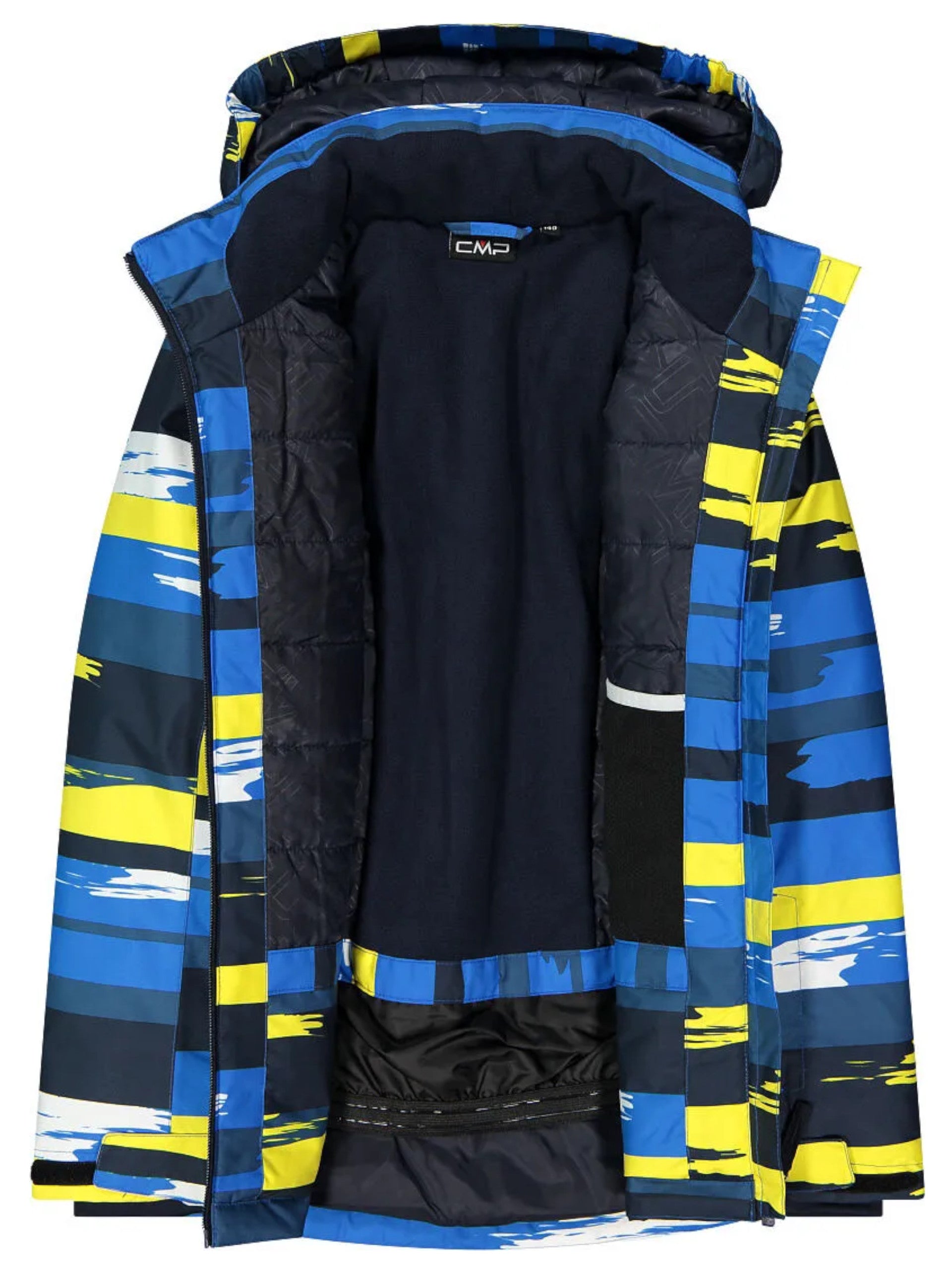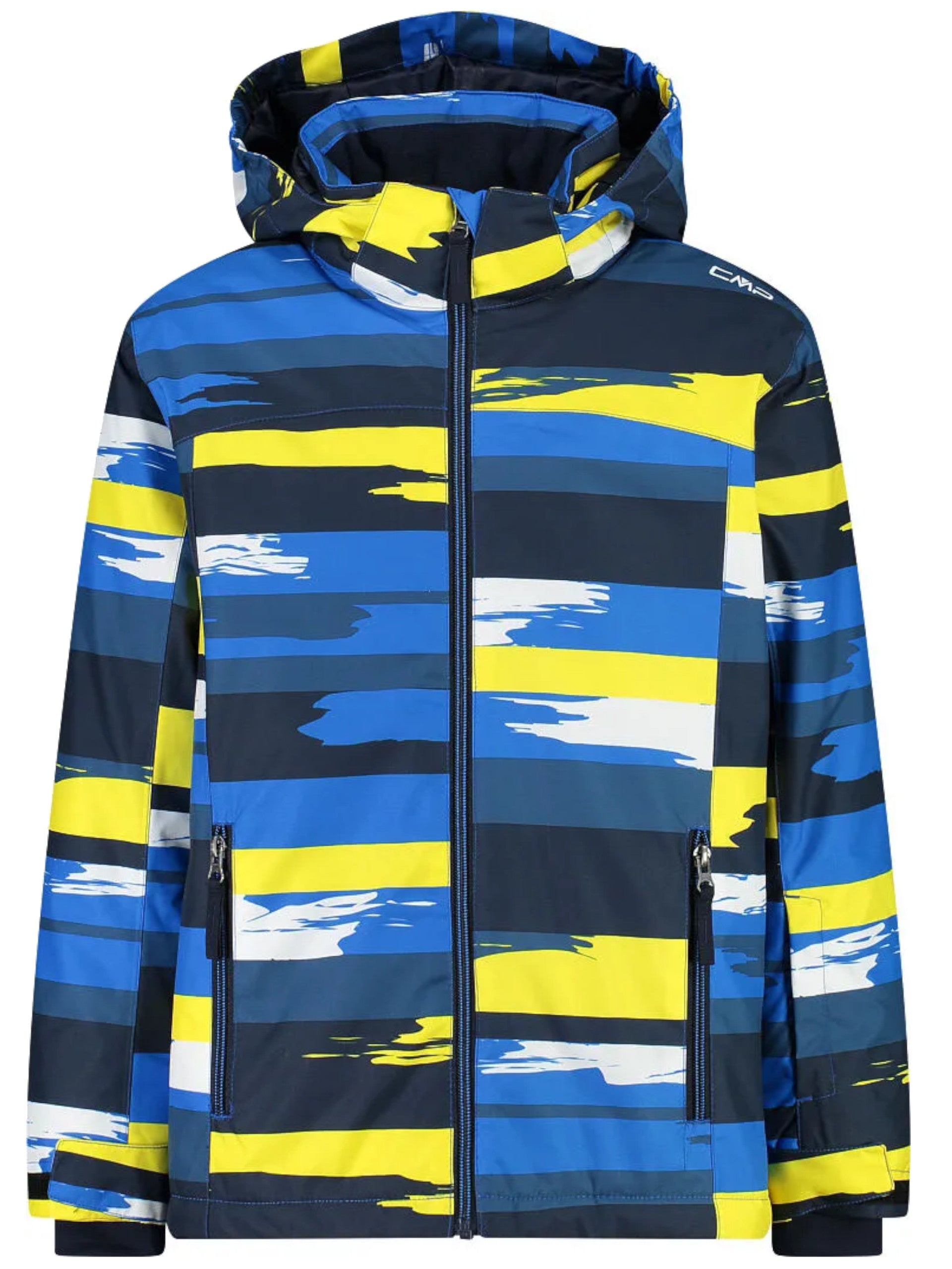 Giacca da sci blu da bambino CMP Snaps Hood. Questa giacca da neve da bambino è realizzata dall'imbottitura Feel Warm Flat che garantisce prestazioni al top anche in condizioni di bagnato. Questa giacca è caratterizzata dal cappuccio removibile e regolabile con coulisse, chiusura full zip centrale, due tasche laterali con zip, tasca porta skipass, polsini regolabili con velcro, ghetta antineve elasticizzata con stampa antiscivolo in silicone, fondo regolabile con coulisse, tascha interna aperta