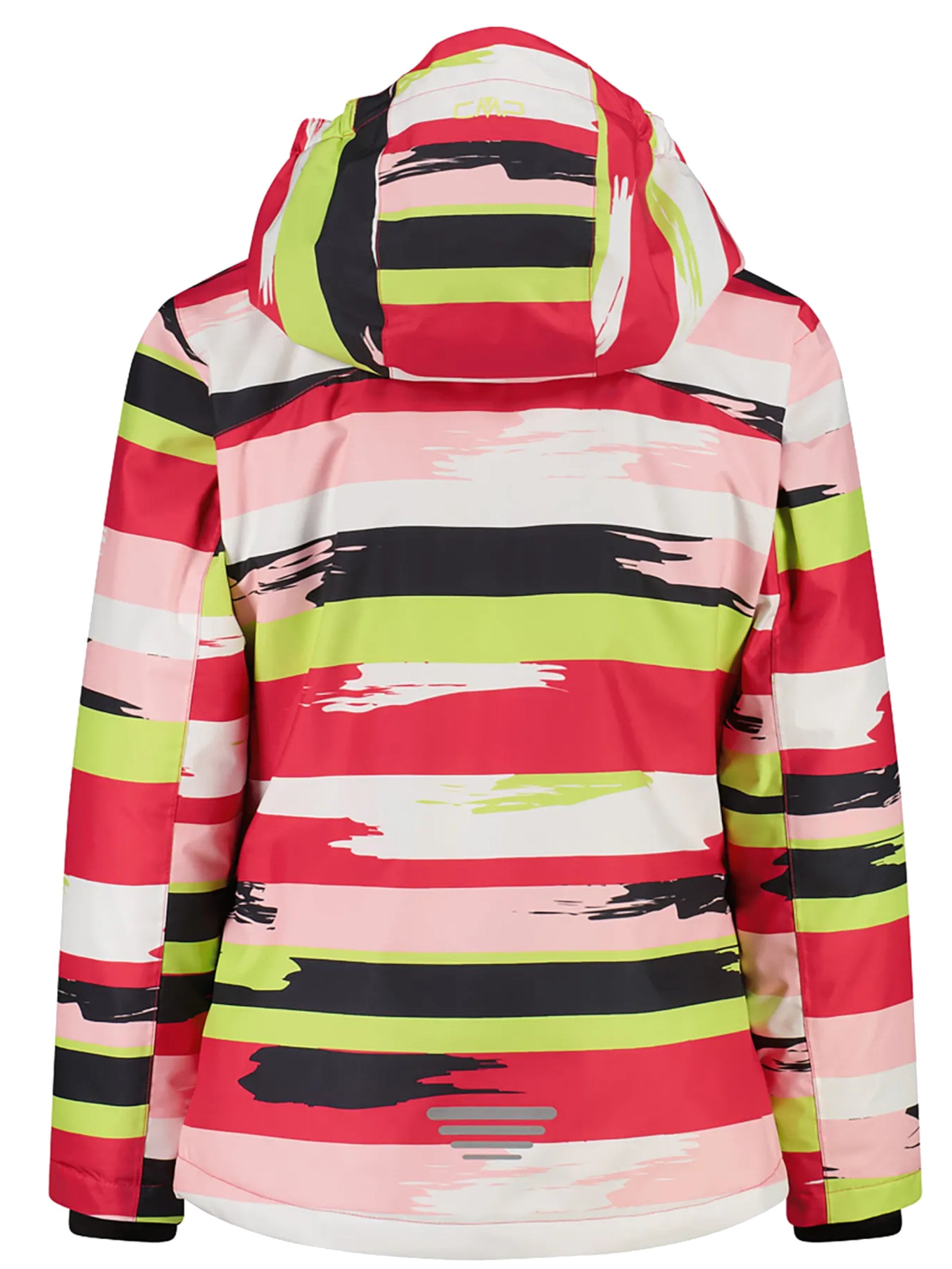 Giacca da sci da bambina rosa CMP Snaps Hood. Questa giacca da sci bambina realizzata dalla fantasia all overed è caratterizzata dalle cuciture totalmente nastrate e membrana impermeabile Clima Protec, che assicurano impermeabilità e traspirabilità anche nelle sciate più intense. Questa giacca da neve CMP da bambina è caratterizzata dal cappuccio staccabile regolabile con coulisse, due tasche laterali con zip e cerniera frontale con patta antivento interna, tasca porta skipass, polsini regolabili con velcro ed elasticizzati, fondo regolabile con coulisse, al suo interno troviamo una ghetta antineve elasticizzata con stampa antiscivolo in silicone e una tasca aperta.