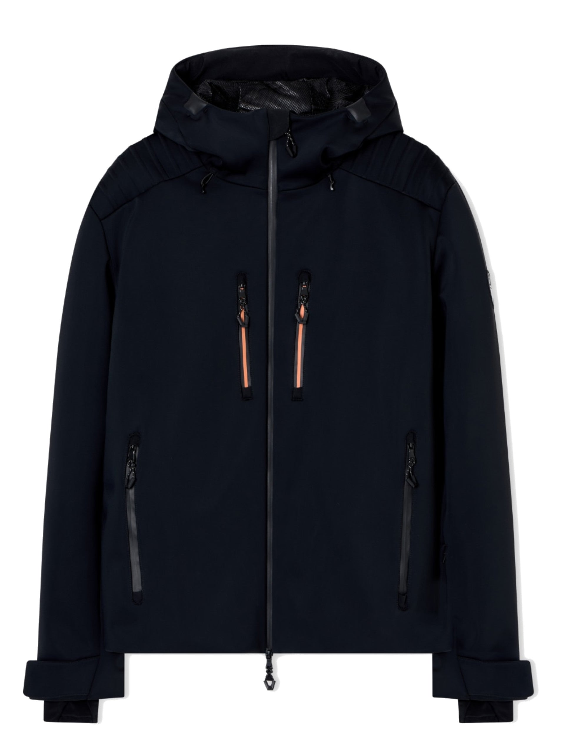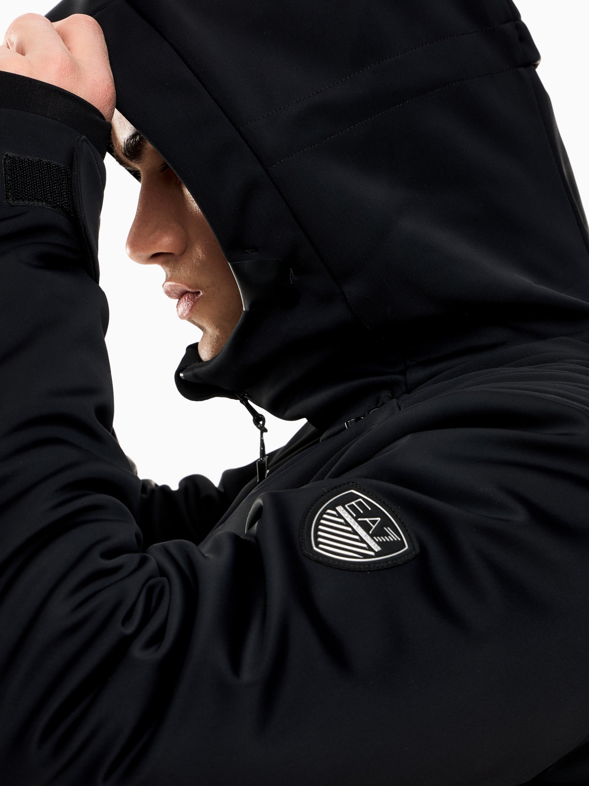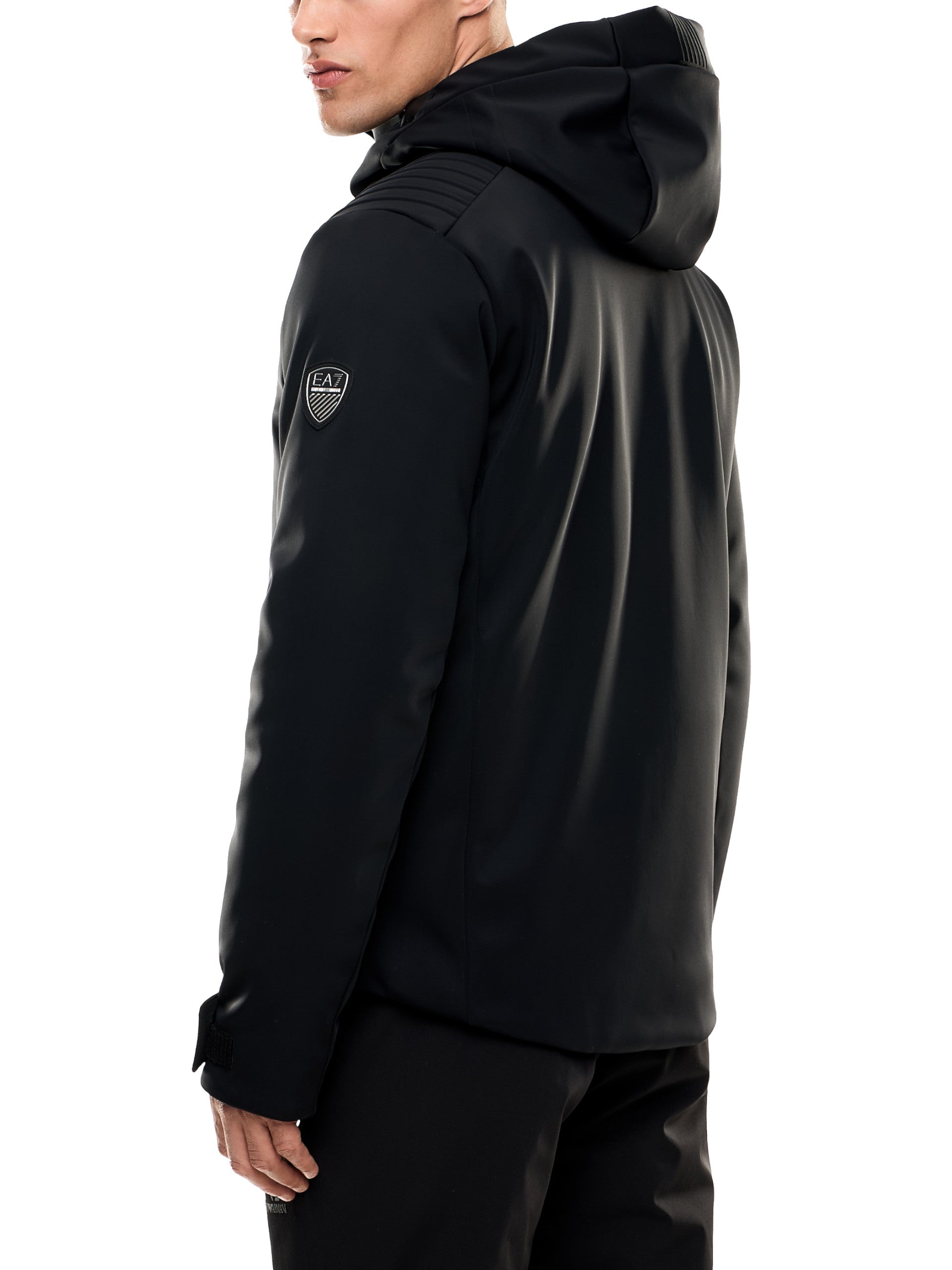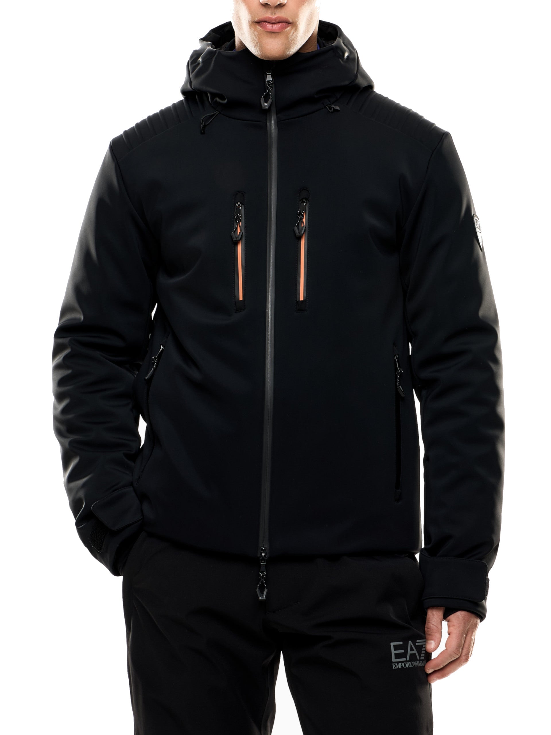Giacca uomo nera da sci EA7 Blouson. Giacca da sci da uomo realizzata in softshell, tessuto perfromante ed elasticizzato, impermeabile e traspirante. Questa giacca da neve EA7 è caratterizzata dal cappuccio fisso con coulisse, numerosi scomparti interni, chiusura centrale full zip con doppio cursore, due tasche laterali con zip e due altezza petto, e il logo applicato sulla manica sinistra polsini elasticizzati e regolabili e il fondo regolabile con coulisse, è un modello perfetto per vivere gli sport invernali al massimo del comfort con un tocco di stile inconfondibile. Il capo presenta l'innovativa imbottitura STRATUM7 RECYCLED realizzata in una microfibra, termoregolatrice, forma uno “scudo termico” tra l'esterno e il corpo, mentre la superficie esterna allontana l’umidità dal corpo garantendo il massimo comfort per tutta la durata dell'attività fisica.