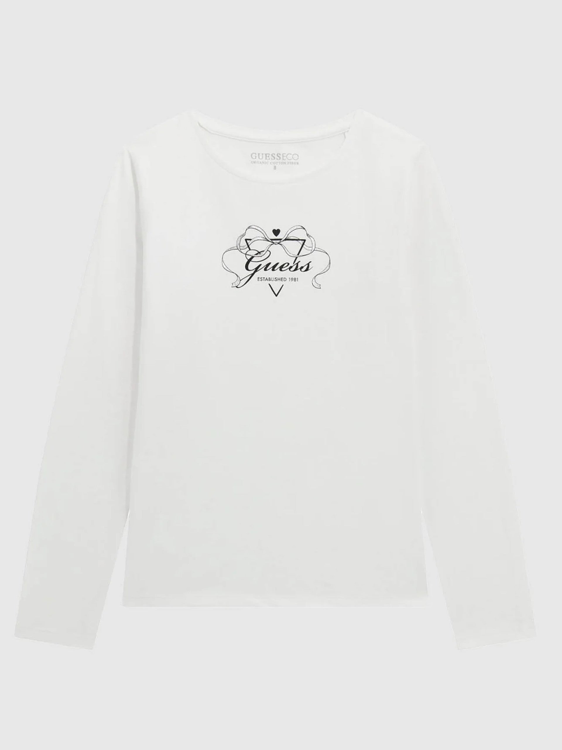 Maglia Guess Bianca da bambina con logo Guess con fiocco argentato. Questa maglia maniche lunghe bambina Guess è realizzata in morbido cotone elasticizzato.