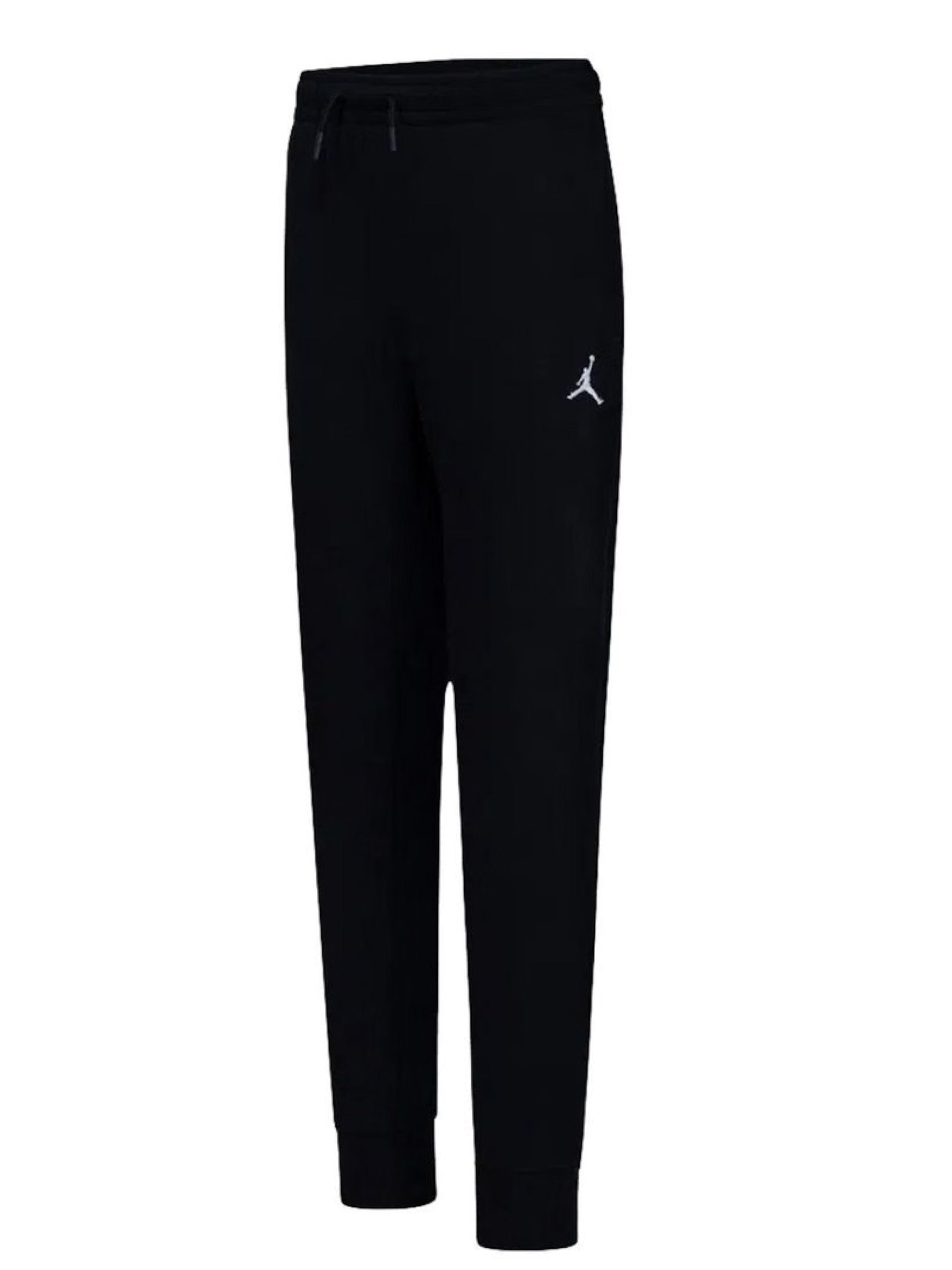 Pantaloni tuta Jordan neri da bambino in cotone felpato. Questi pantaloni Jordan neri hanno la banda elastica sul punto vita regolabile con laccetti, due tasche laterali aperte, una tasca posteriore,logo Jordan ricamato sulla gamba sinistra e polsini elasticizzati.