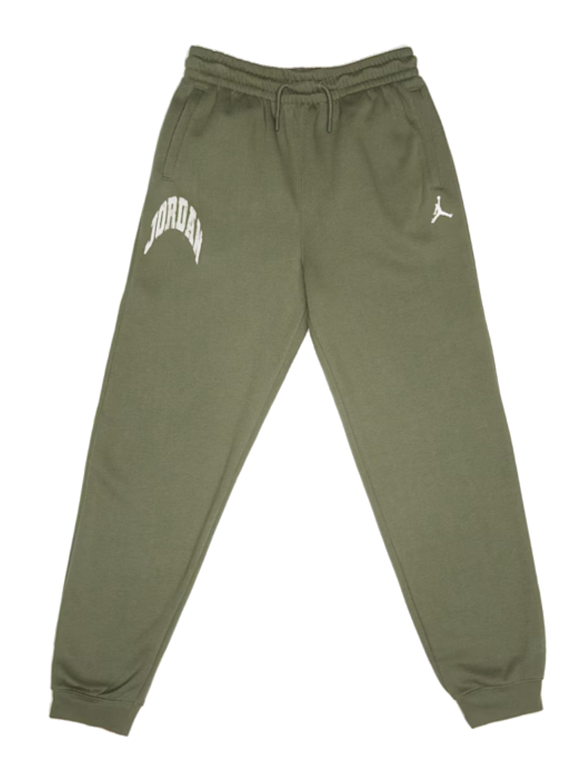 Pantaloni tuta Jordan verdi da bambino in cotone felpato. Questi pantaloni Jordan verdi hanno la banda elastica sul punto vita regolabile con laccetti, due tasche laterali aperte, una tasca posteriore, logo Jordan ricamato, la scritta Jordan applicata sulla gamba sinistra e polsini elasticizzati.