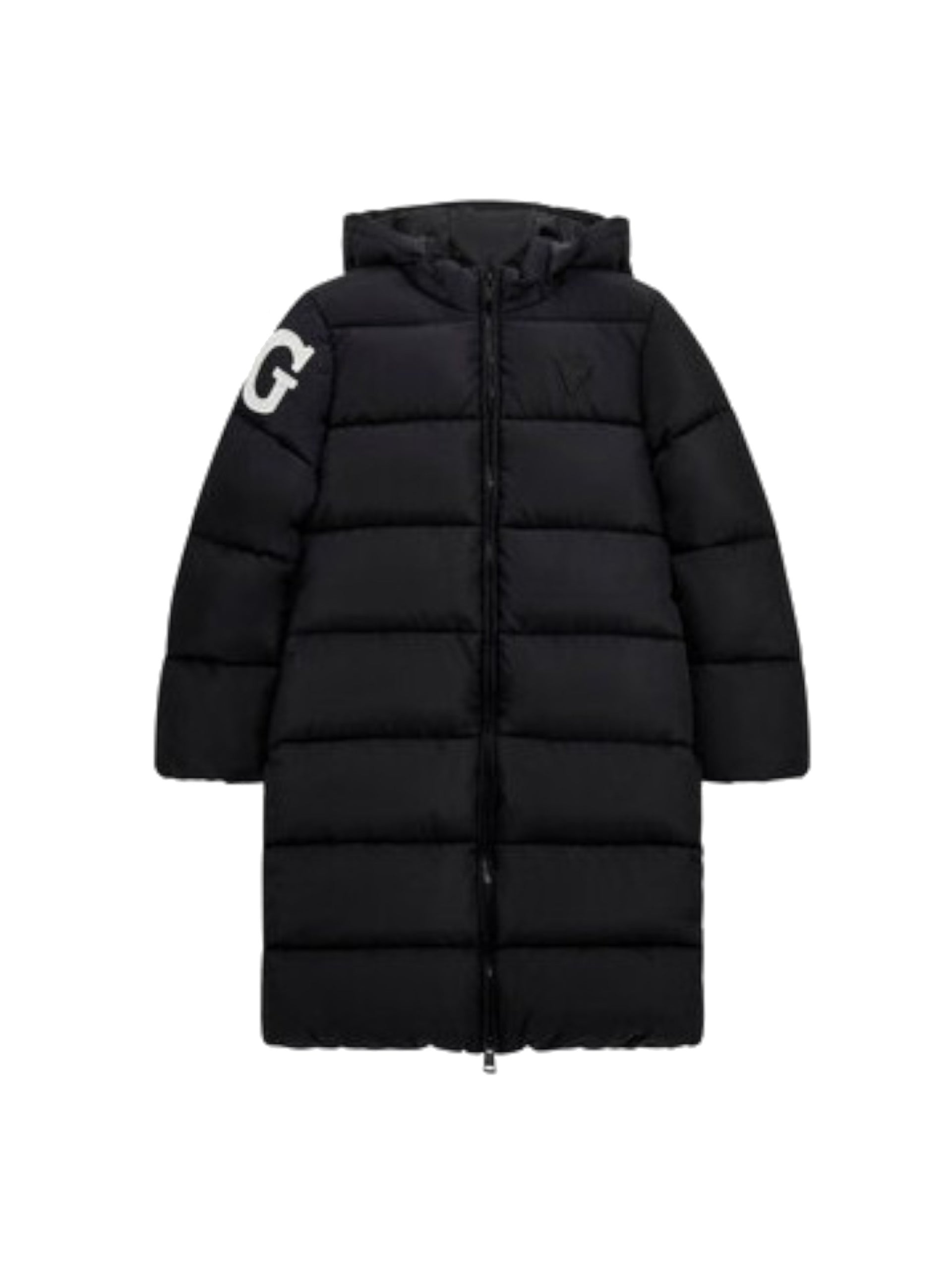 Piumino Guess lungo nero da bambina con cappuccio removibile Padded Long Puffer. Questo giubbino Guess realizzato da un tessuto trapuntato caldo, morbido ed avvolgente perfetto per i primi freddi invernali. Questo piumino da bambina nero Guess è caratterizzato dalla chiusura centrale full zip con doppio cursore, due tasche laterali con zip, cappuccio removibile, maxi scritta in bianco Guess sul retro, polsini e fondo regolari