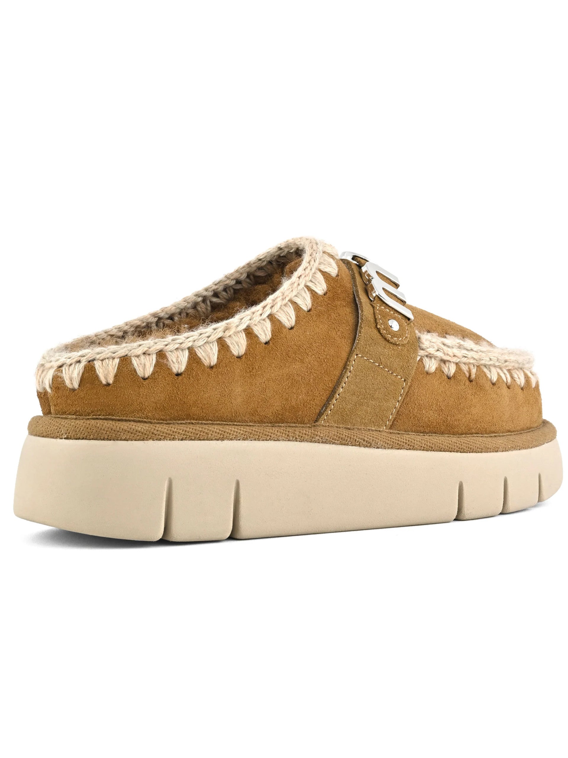 Scarpe Mou da donna marroni Bounce Clog Metal Logo. Queste scarpe da donna marroni Mou sono realizzati in vera pelle di montone e sono caratterizzate dalle inconfondibili cuciture in lana all'uncinetto, il plantare in morbido montone e la suola leggera in EVA e la gomma rendono questo modello incredibilmente comodo da indossare. Sul davanti troviamo il logo in metallo