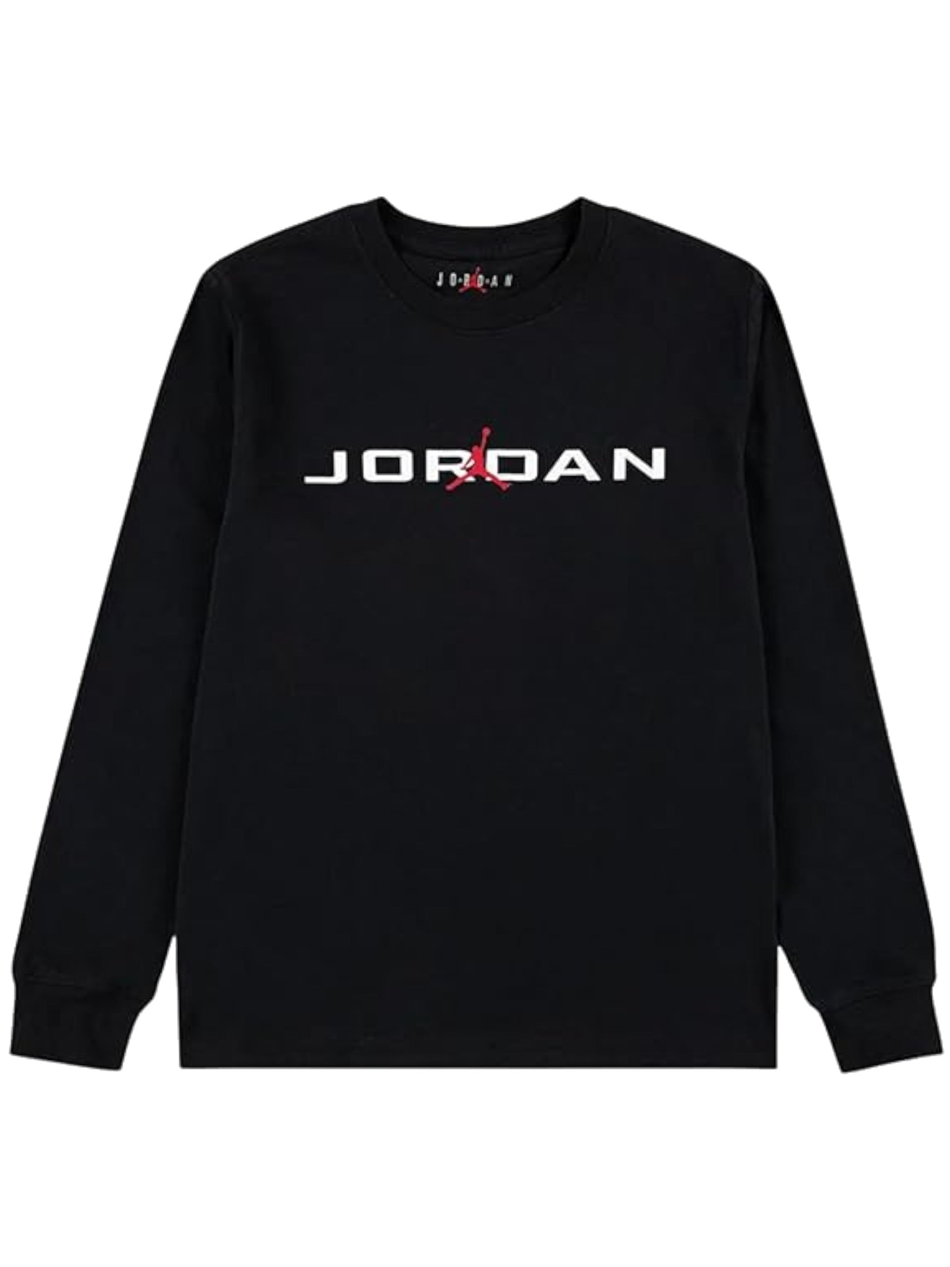 T-shirt nera da bambino Jordan stretch. Questa T-shirt nera Jordan realizzata i cotone è caratterizzata dal girocollo, maniche lunghe e sul davanti troviamo la scritta Jordan in bianco