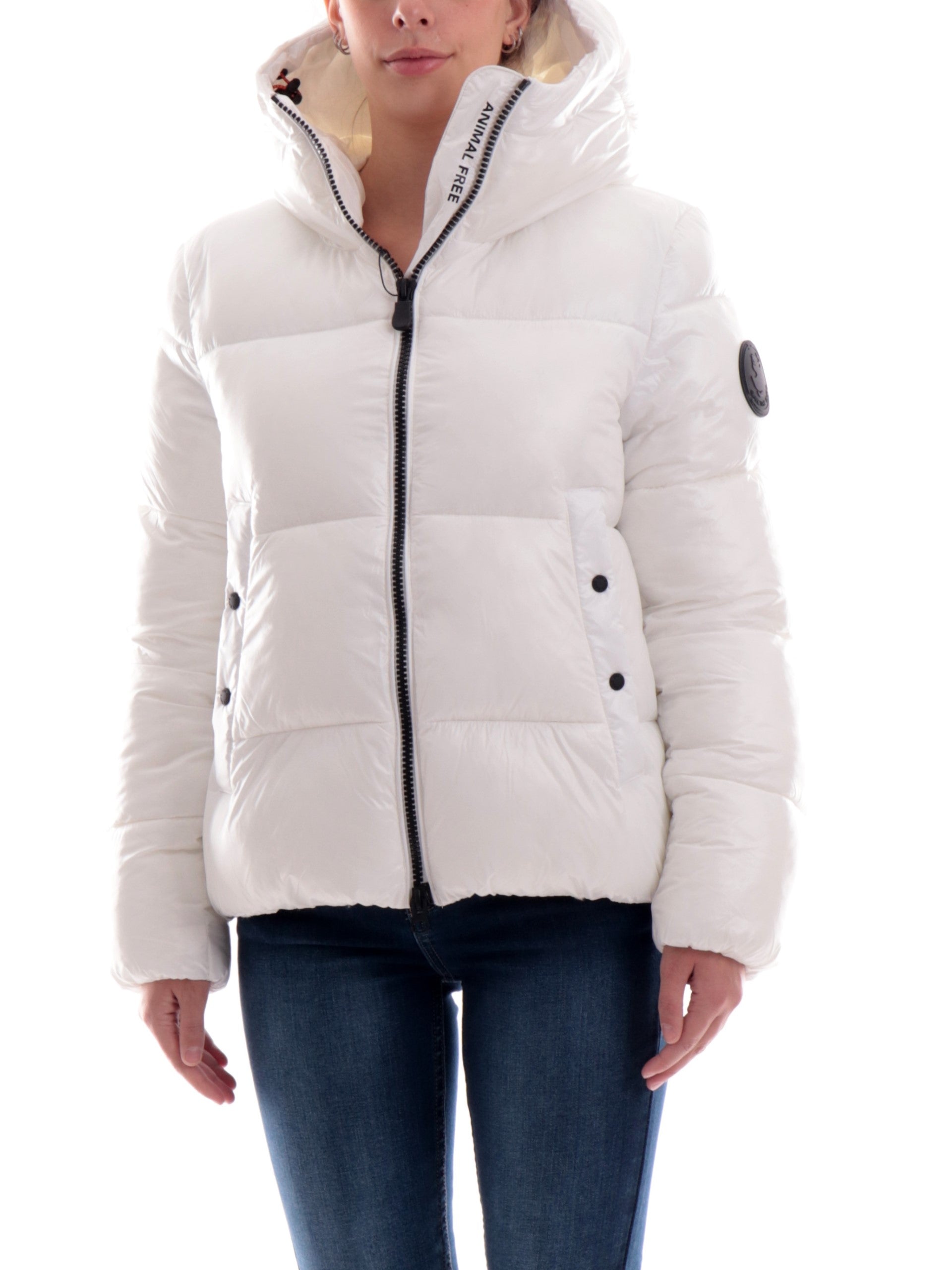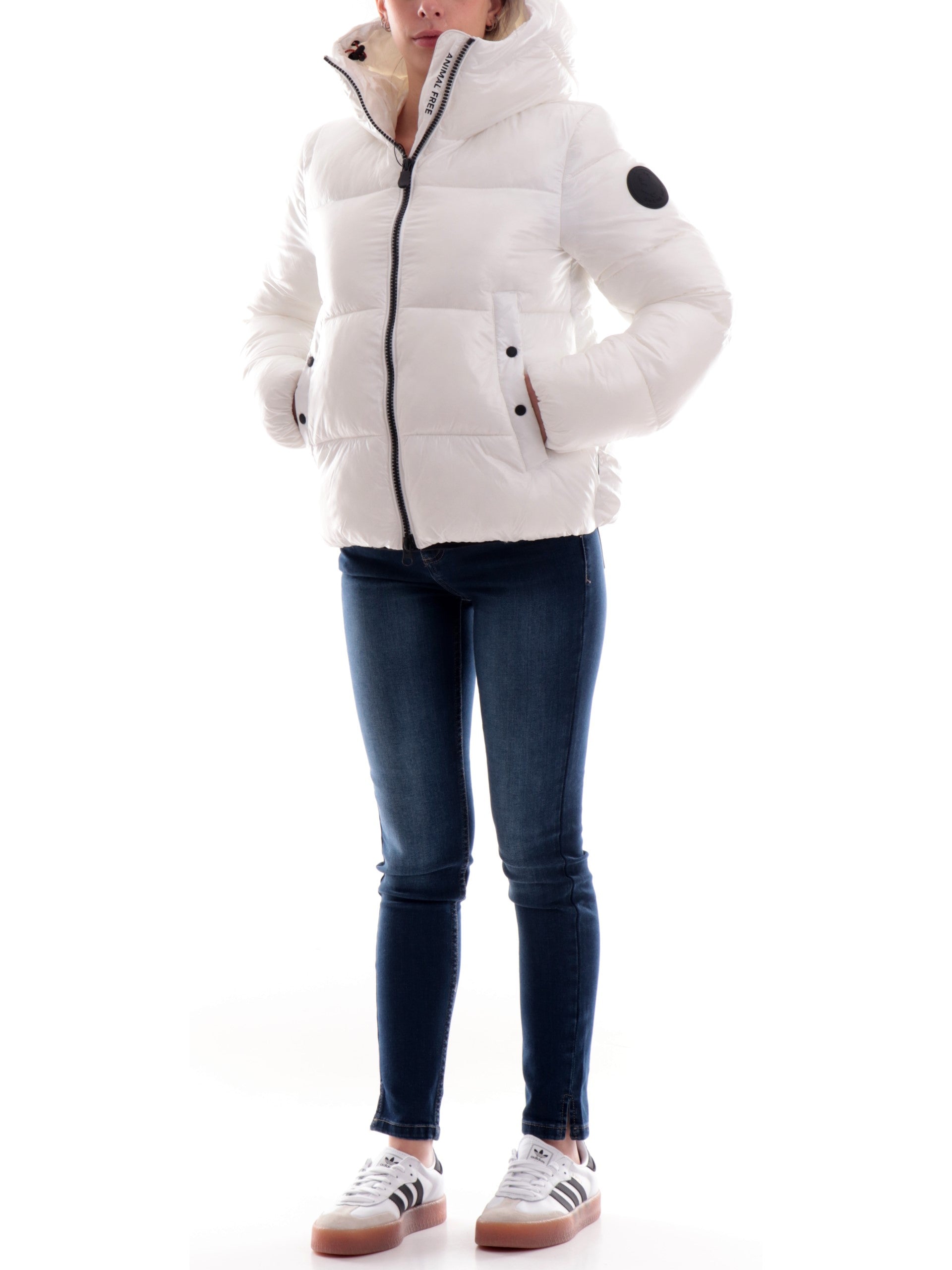 Piumino Save the Duck bianco da donna con cappuccio e tasche. Questo Save the Duck bianco lucido modello Biddy è realizzato in imbottitura ecologica cruelty free, e tessuto bianco lucido. Questo piumino bianco da donna ha il collo alto antivento e la cerniera nera moderna sul davanti.