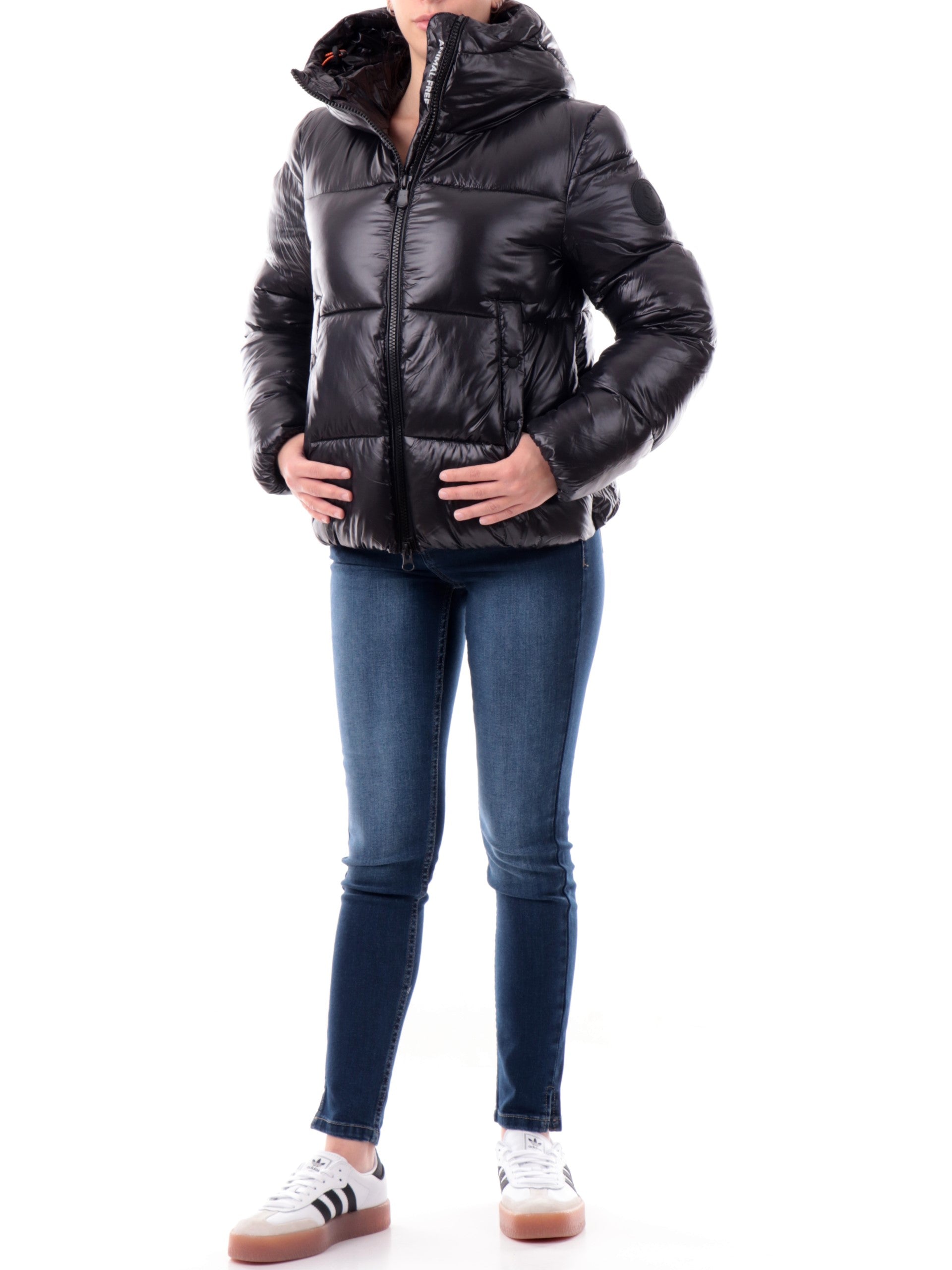 Piumino Save the Duck nero da donna con cappuccio e tasche. Questo Save the Duck nero lucido modello Biddy è realizzato in imbottitura ecologica cruelty free, e tessuto nero lucido. Questo piumino nero da donna ha il collo alto antivento e la cerniera moderna sul davanti.