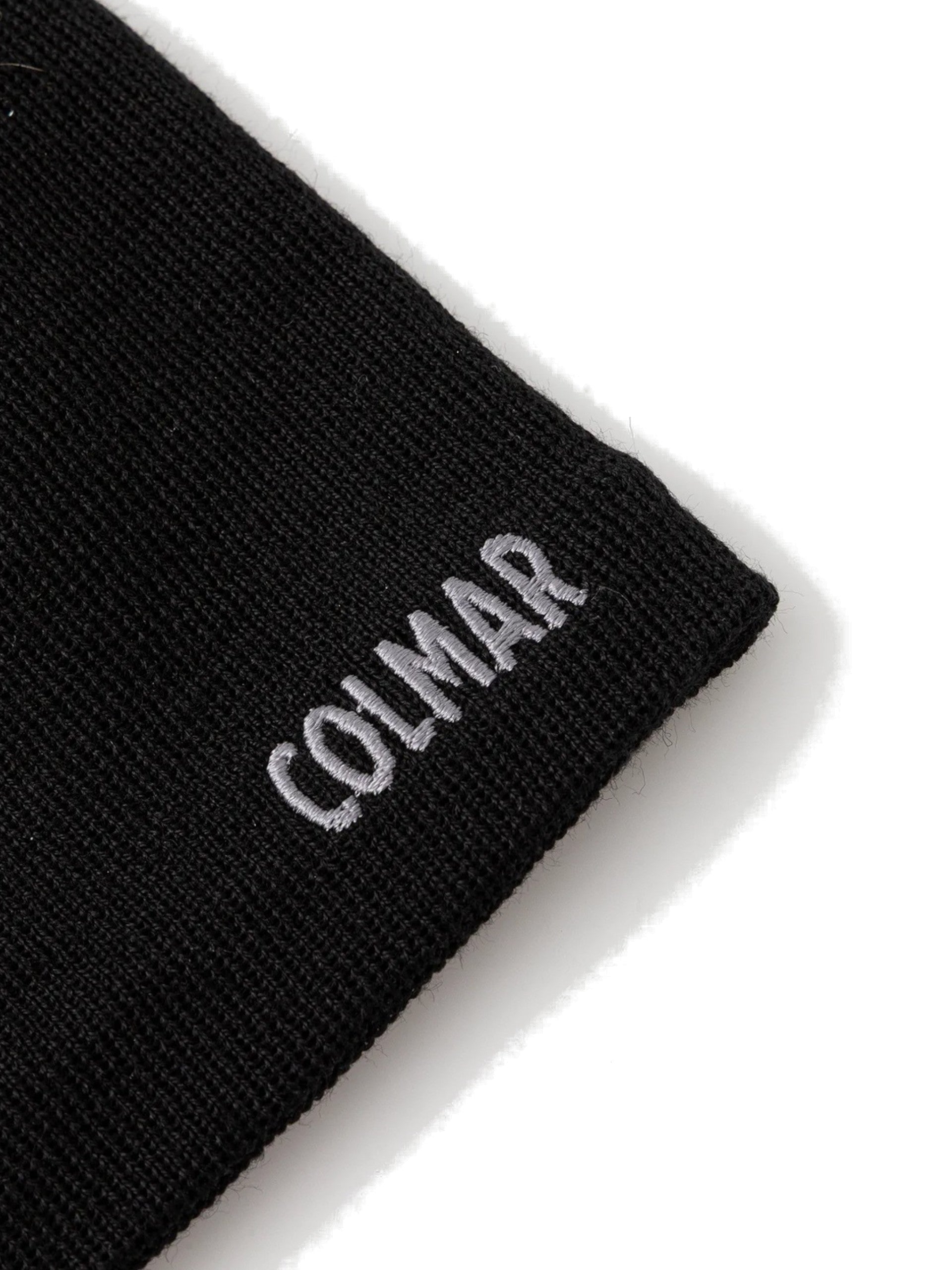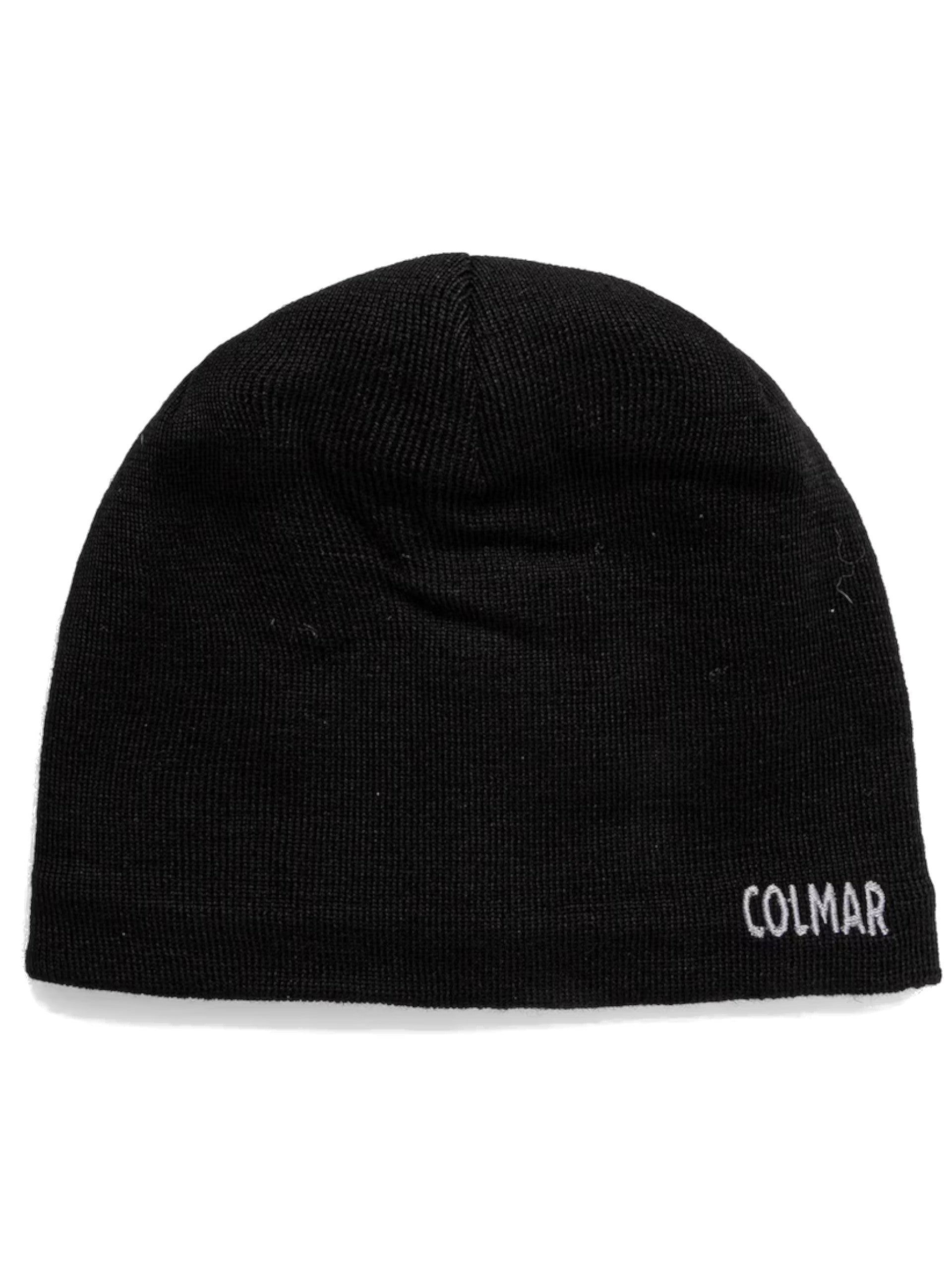 Cappello Colmar nero Miller. Questo cappello nero Colmar realizzato in morbido e caldo tessuto a tinta unita ha il risvolto con la scritta del brand cucito sul davanti ed è ideale per la stagione Autunno/Inverno.