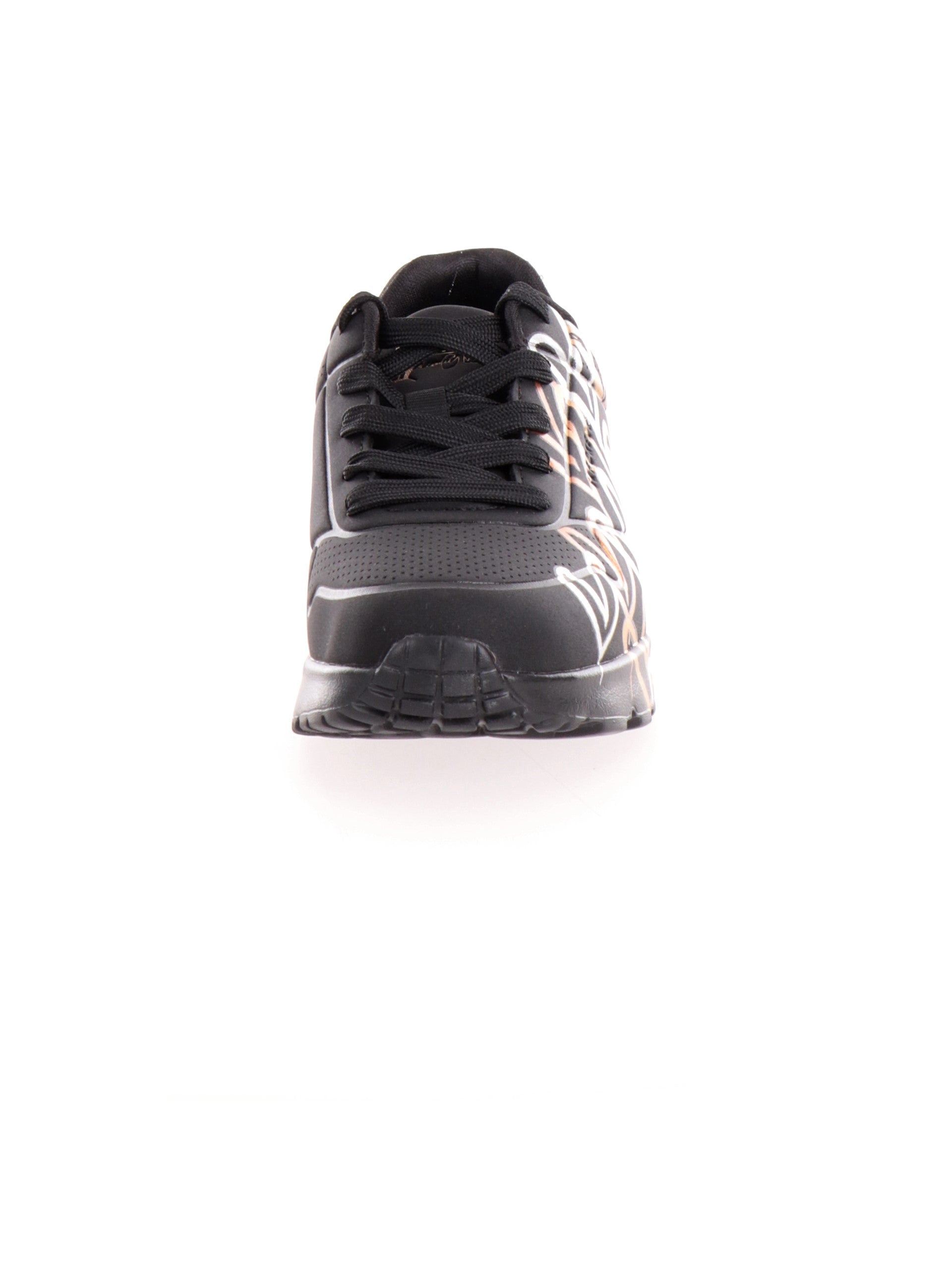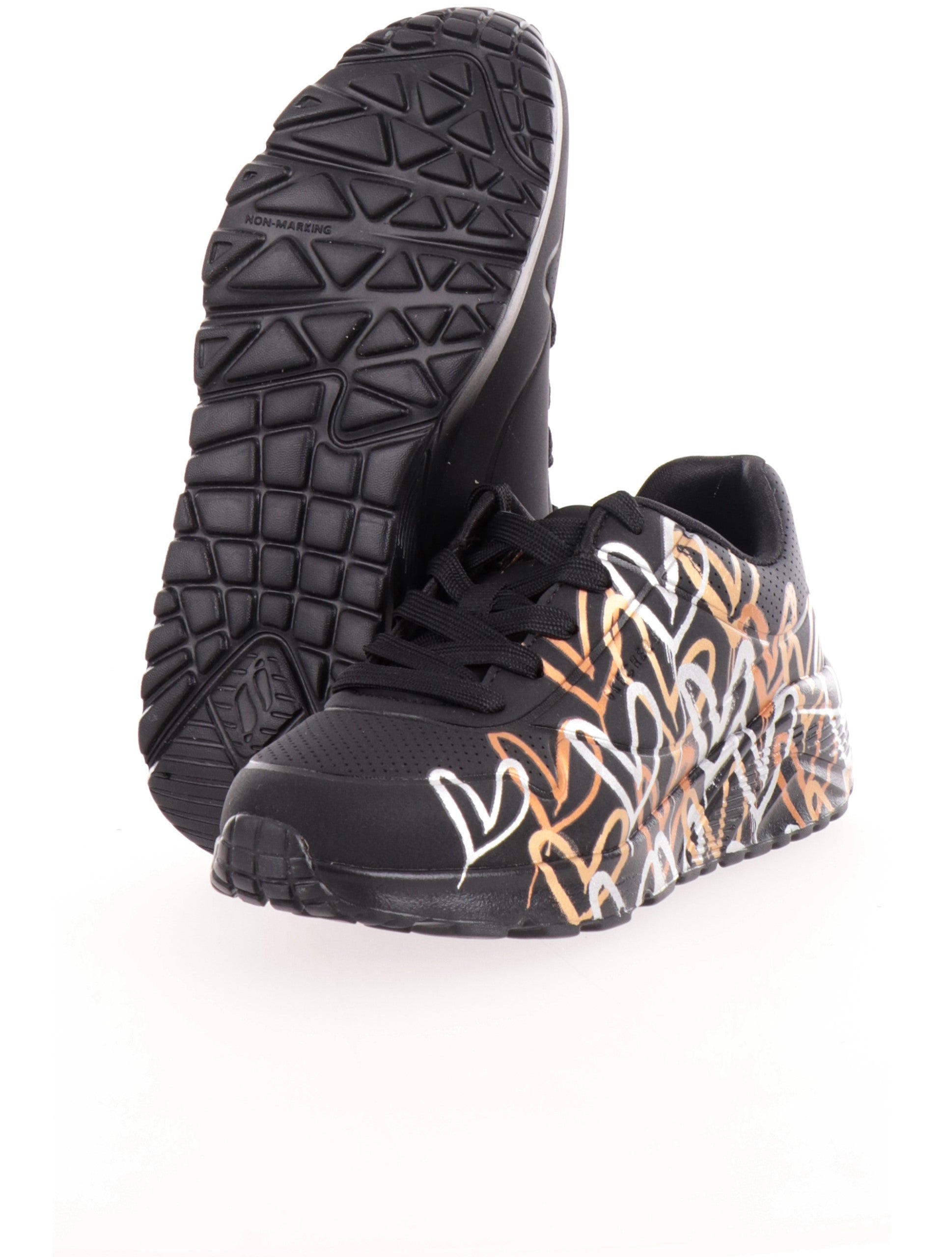 Scarpe Skechers Uno Lite Metallic Love nere Kids 314067L. Queste sneakers Skechers nere hanno la tomaia in mesh traspirante, la chiusura con lacci, la suola in gomma, cuori dorati all over ed il sottosuola antiscivolo per una maggiore aderenza.