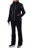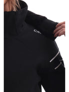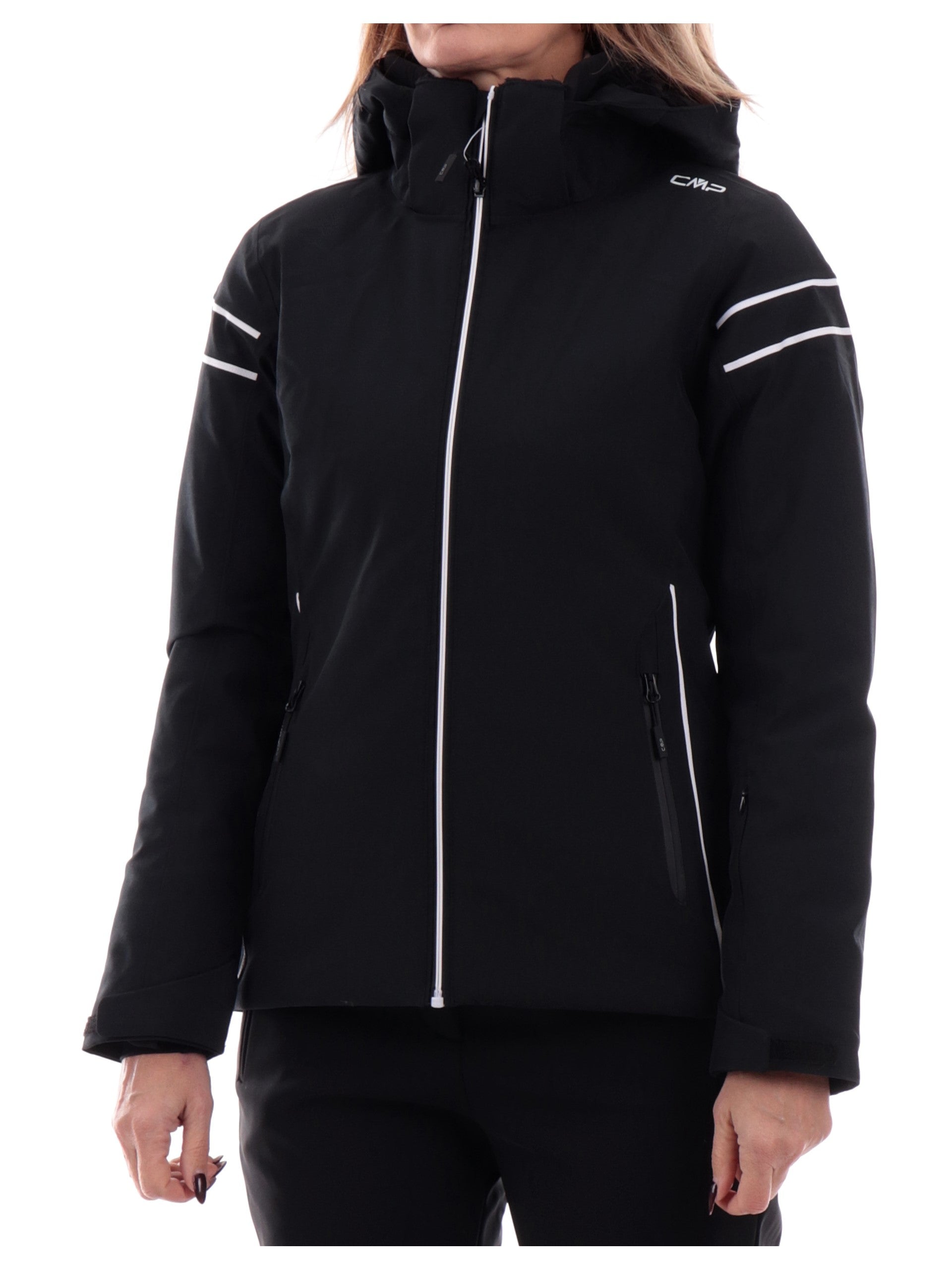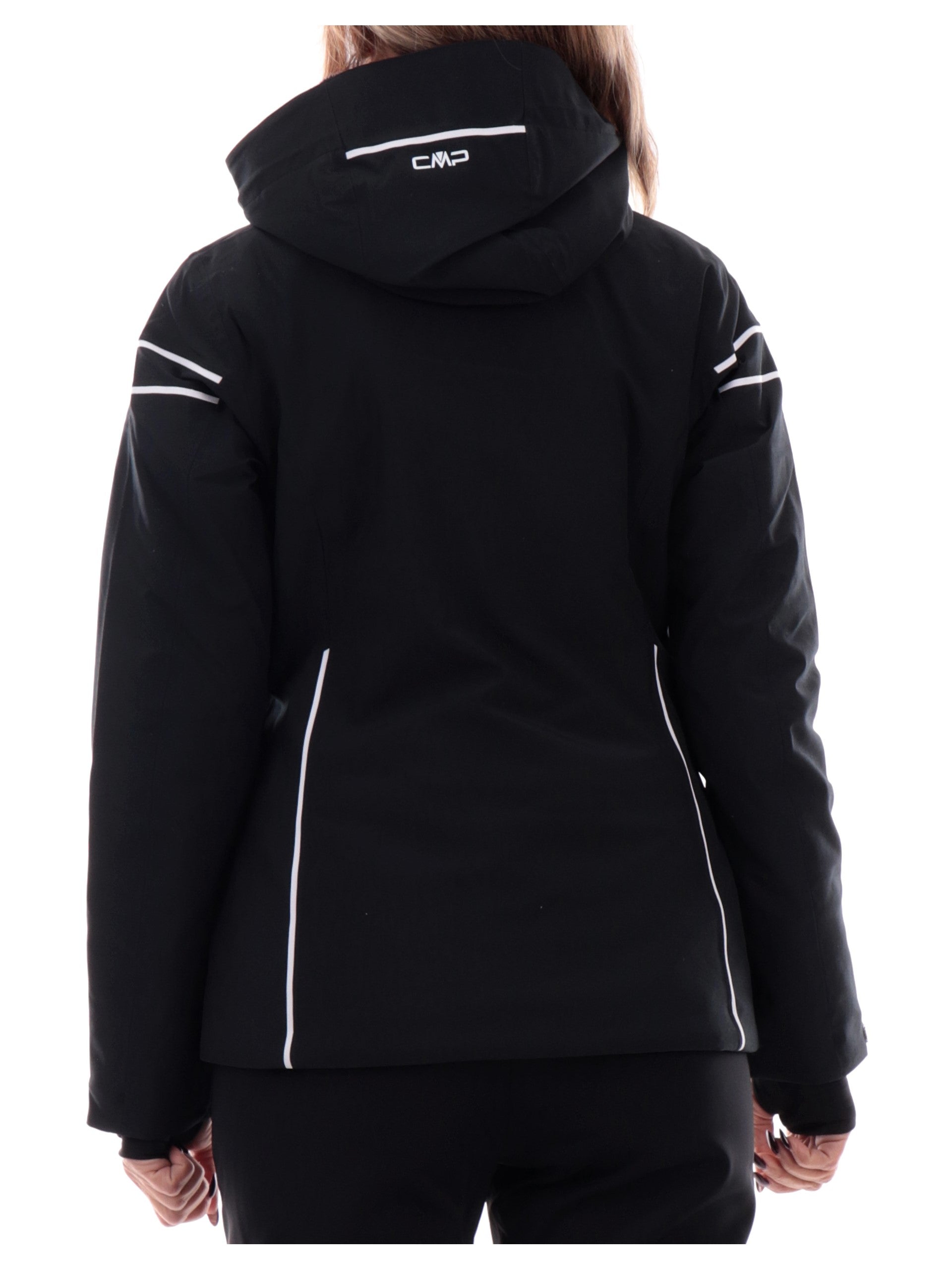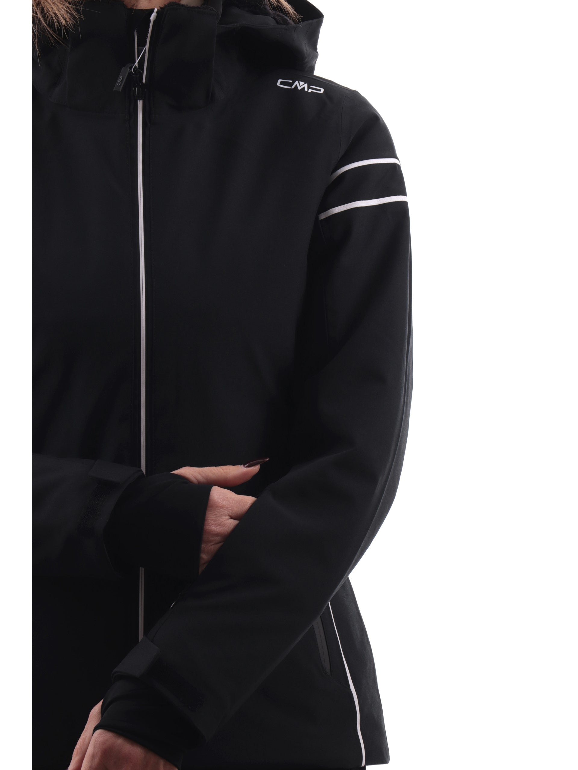 Giacca sci CMP nera da donna antineve 34W4516, realizzata in tessuto tecnico impermeabile e antivento. Questa giacca neve CMP nera ha il cappuccio rimovibile e regolabile con coulisse, la chiusura full zip centrale, due tasche laterali con zip, una tasca sulla manica sinistra per lo skipass, la ghetta interna elasticizzata, polsini e fondo elasticizzati.