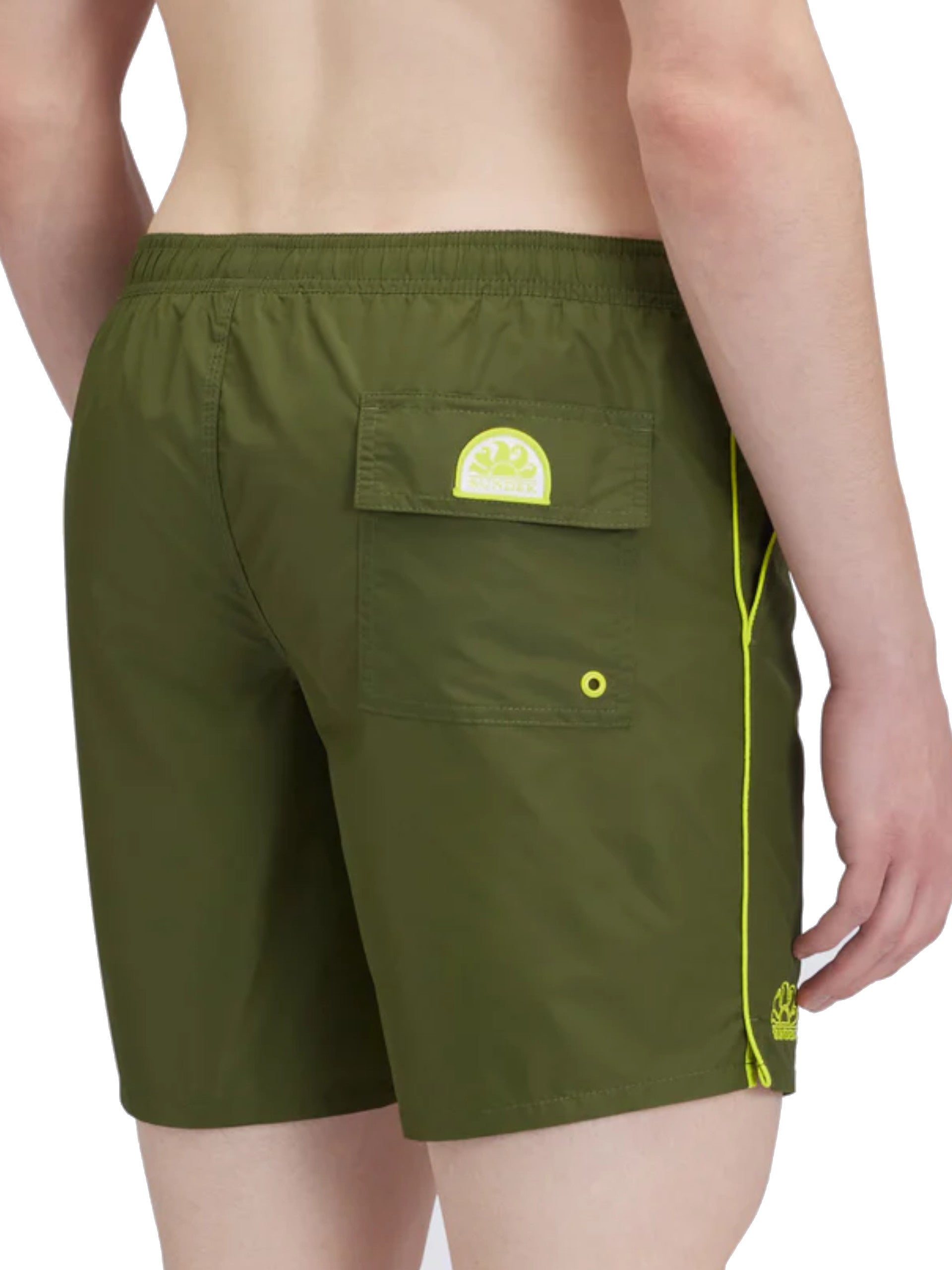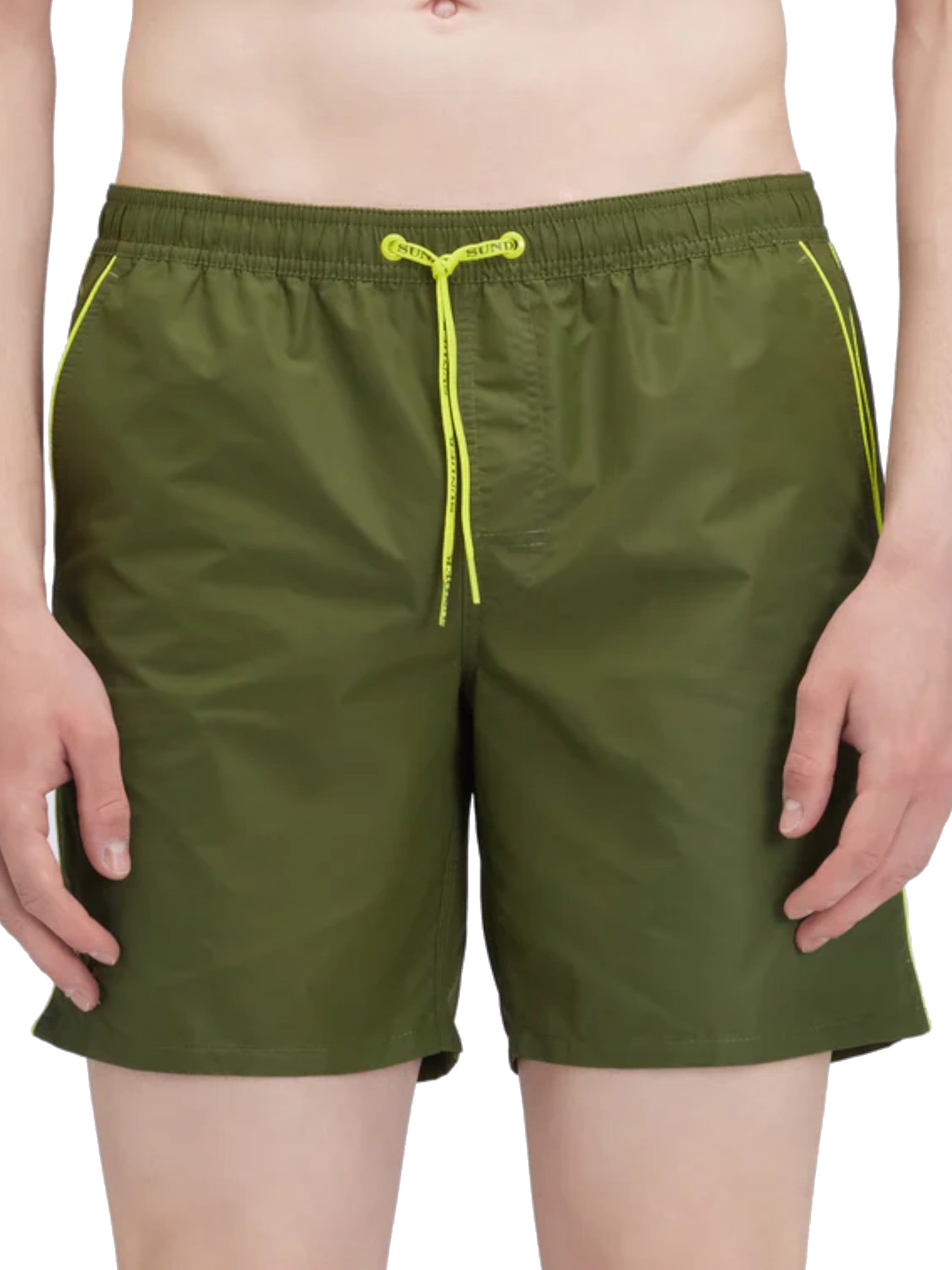 Costume mare Sundek verde da uomo Boardshort con inserti gialli M420BDTA100. Questo costume Sundek verde ha la retina traspirante interna, la banda elastica sul punto vita regolabile con laccetti, due tasche laterali sul davanti e il taschino sul retro. Il costume Sundek è caratterizzato da profili gialli a contrasto colore ed il logo del brand applicato sul fondo della gamba e sul taschino.