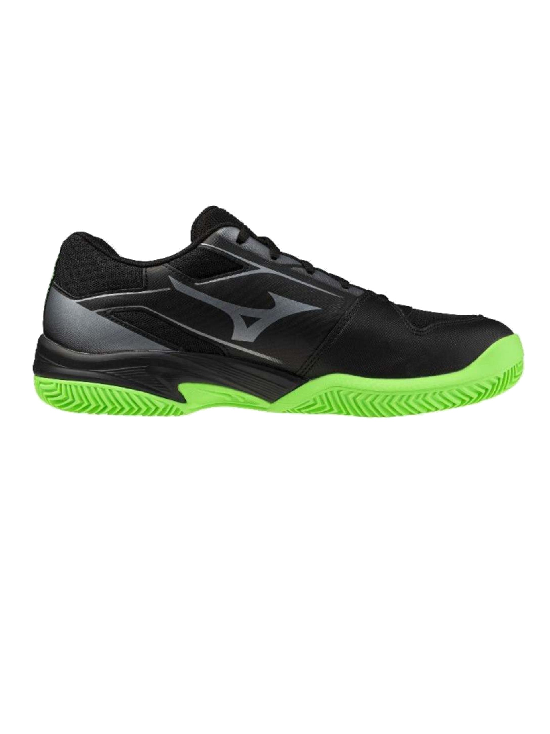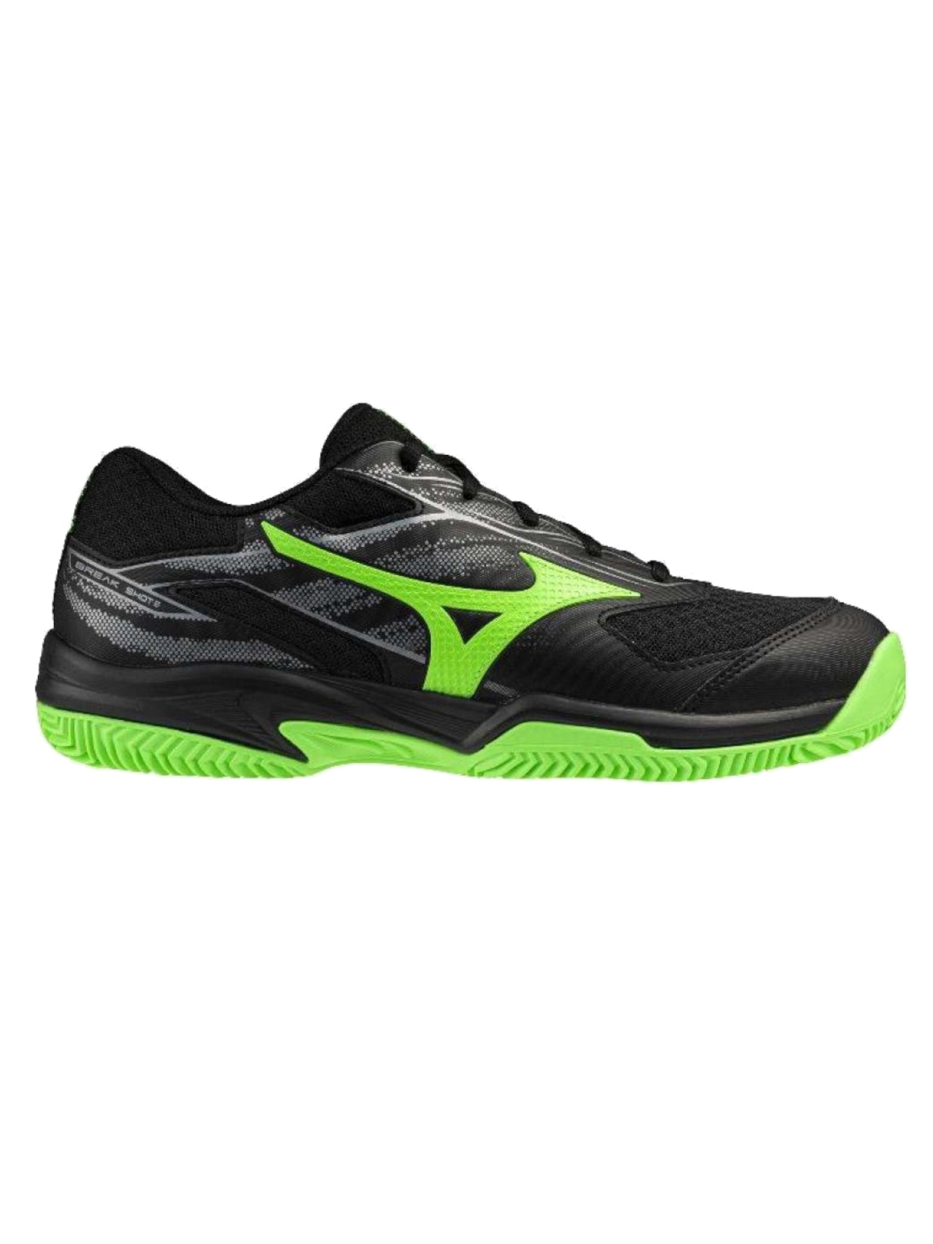 Scarpe Mizuno nere e verdi da uomo Break Shot 5 CC tennis. Queste scarpe da tennis Mizuno hanno la tomaia in tessuto traspirante mista mesh, la chiusura con lacci, la suola in gomma per un comfort ottimale, il sottosuola antiscivolo per avere più grip e il battistrada a lisca di pesce. Logo del brand Mizuno a contrasto colore stampato su tutti e due i lati.