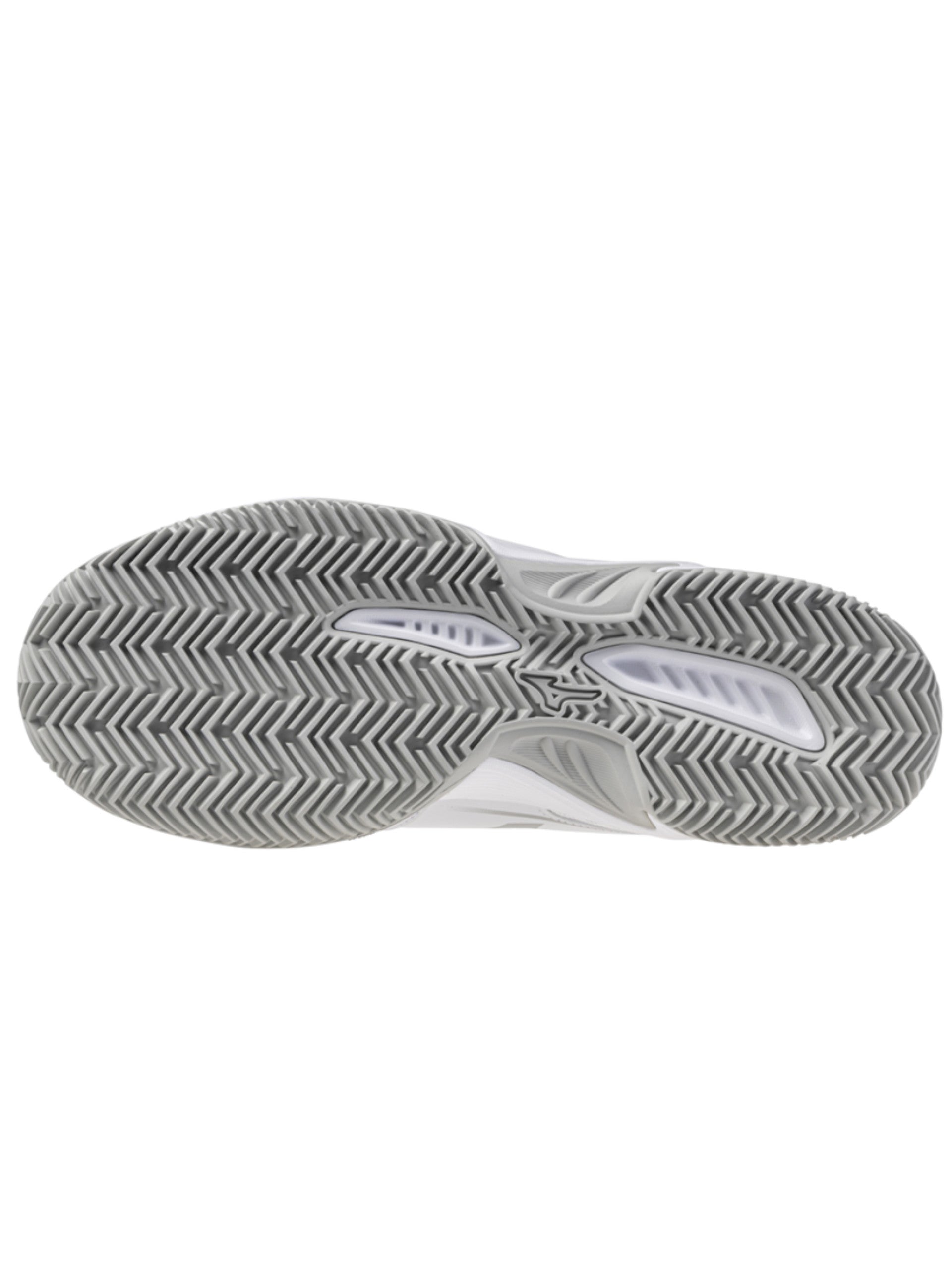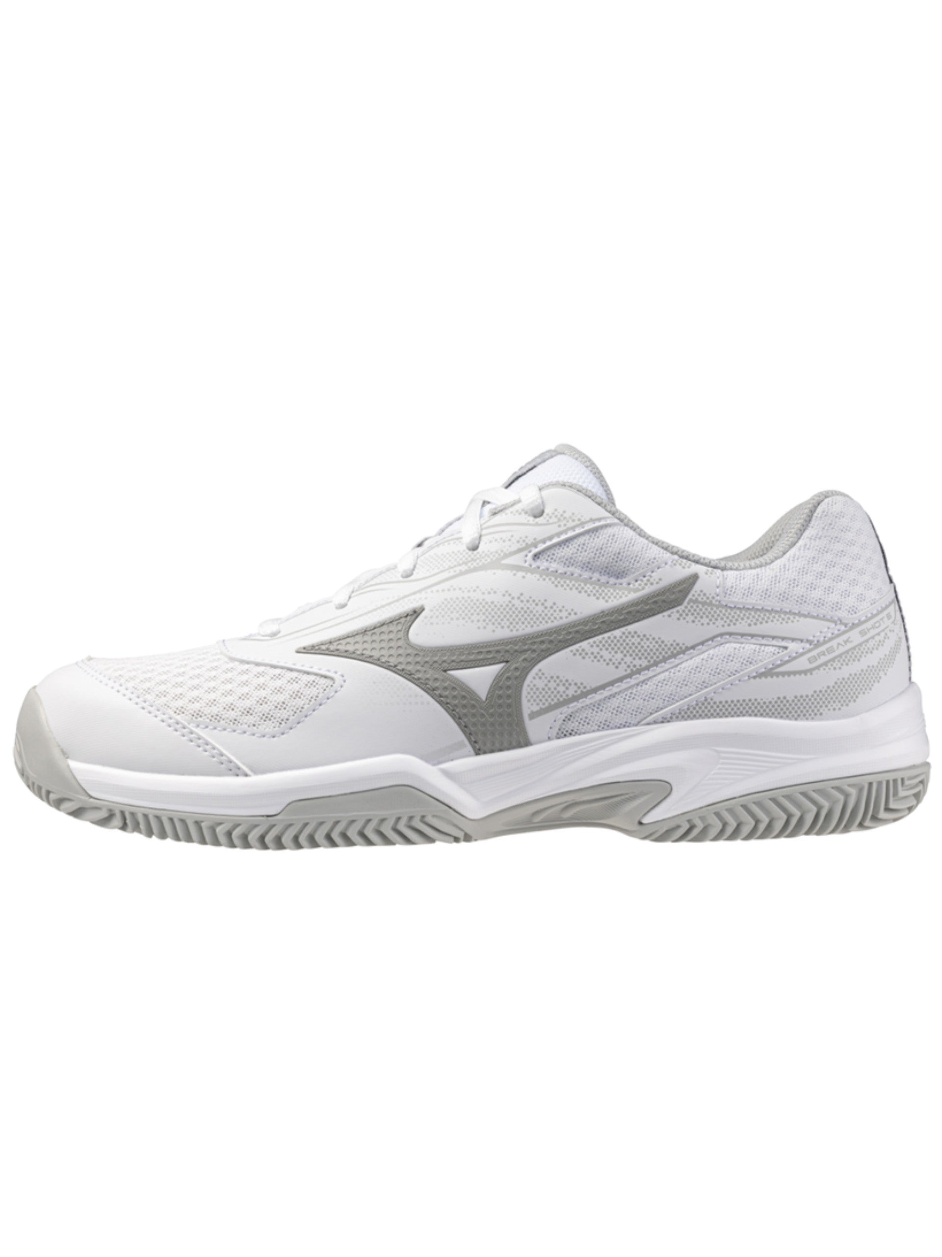 Scarpe tennis Mizuno bianche da donna Break Shot 5 CC Wos 61GC2526. Queste scarpe da padel Mizuno hanno la tomaia in tessuto traspirante mista mesh, la chiusura con lacci, la suola in gomma per un comfort ottimale, il sottosuola antiscivolo per avere più grip e il battistrada a lisca di pesce. Logo del brand Mizuno a contrasto colore stampato su tutti e due i lati.