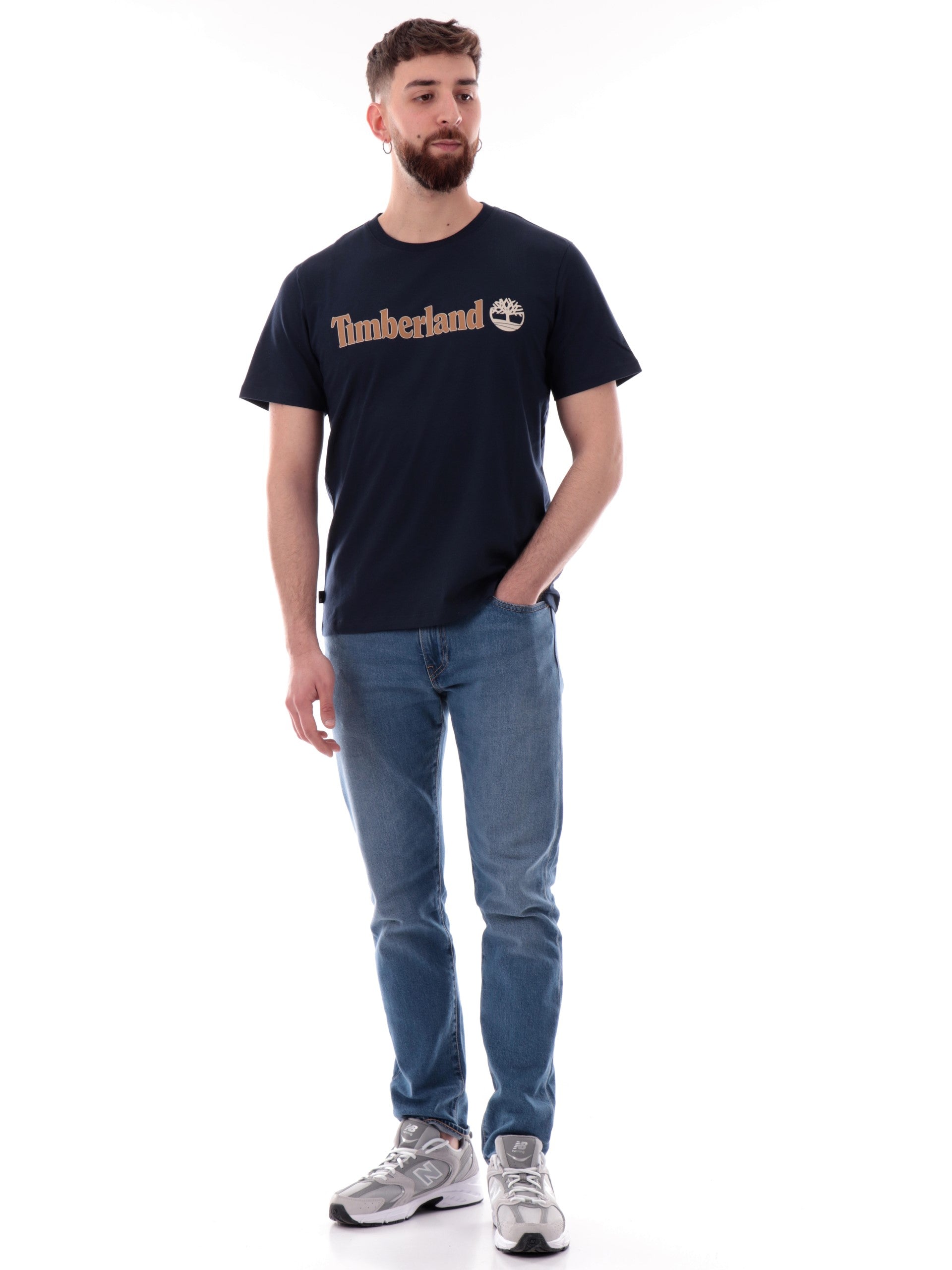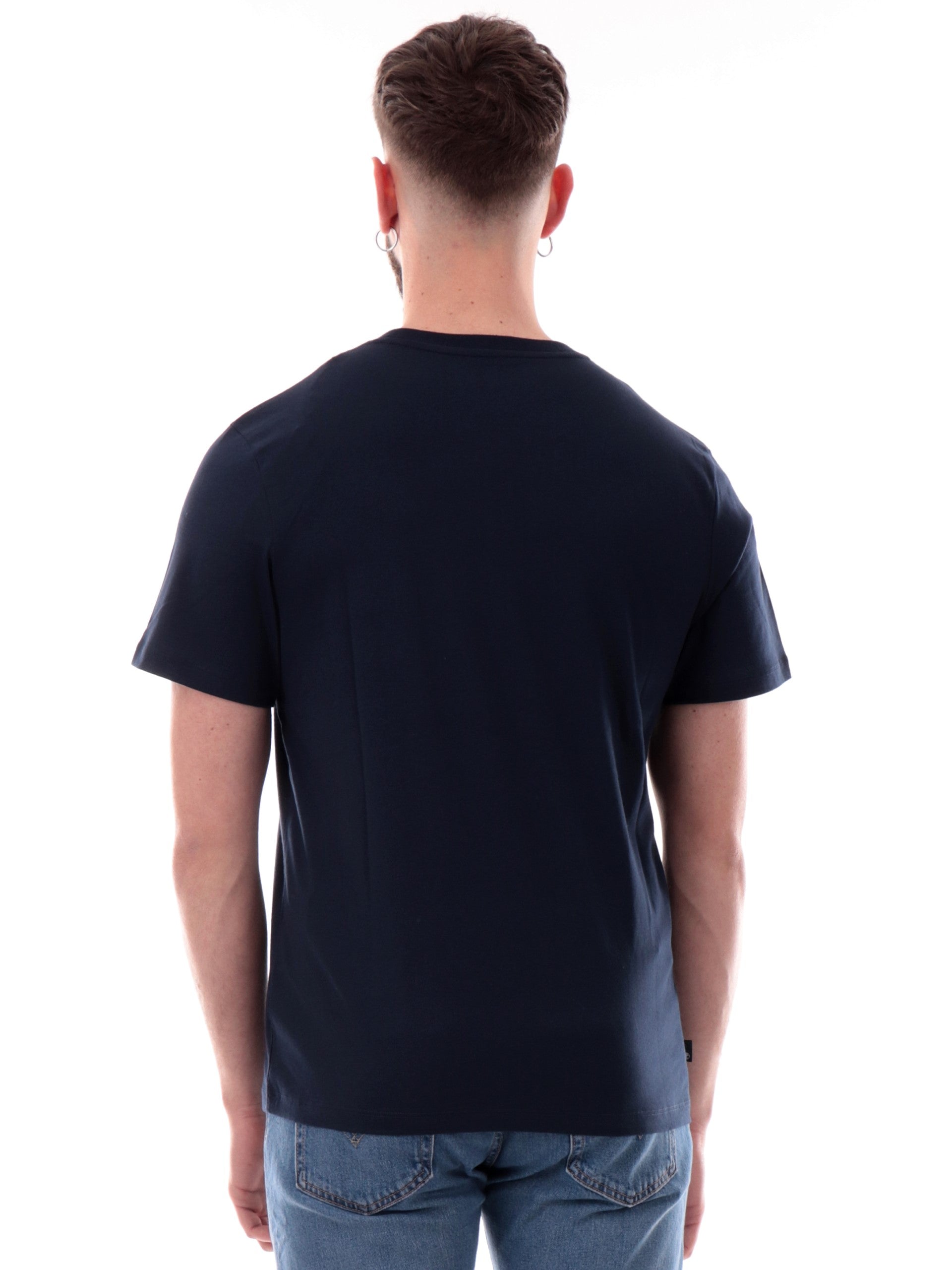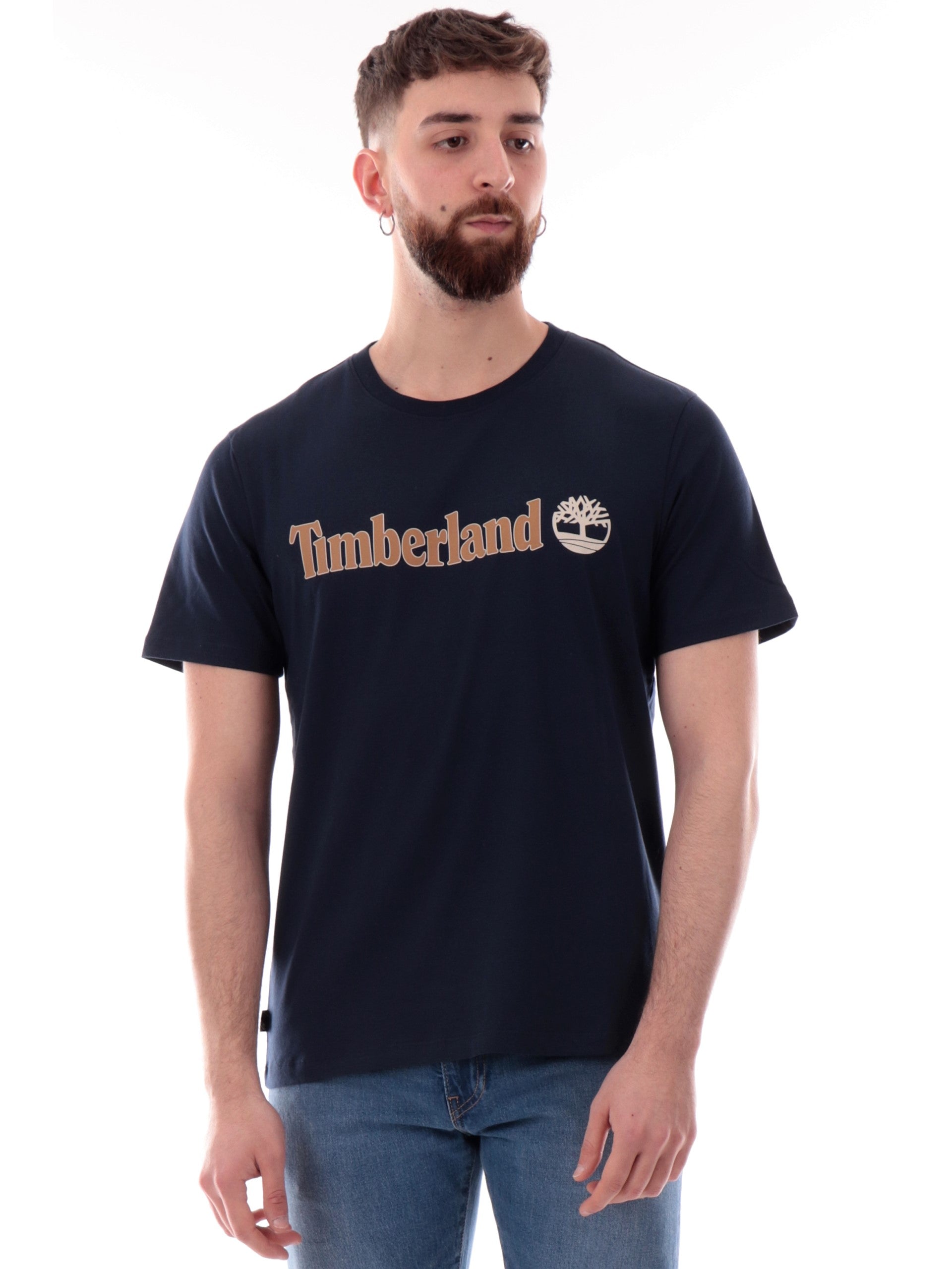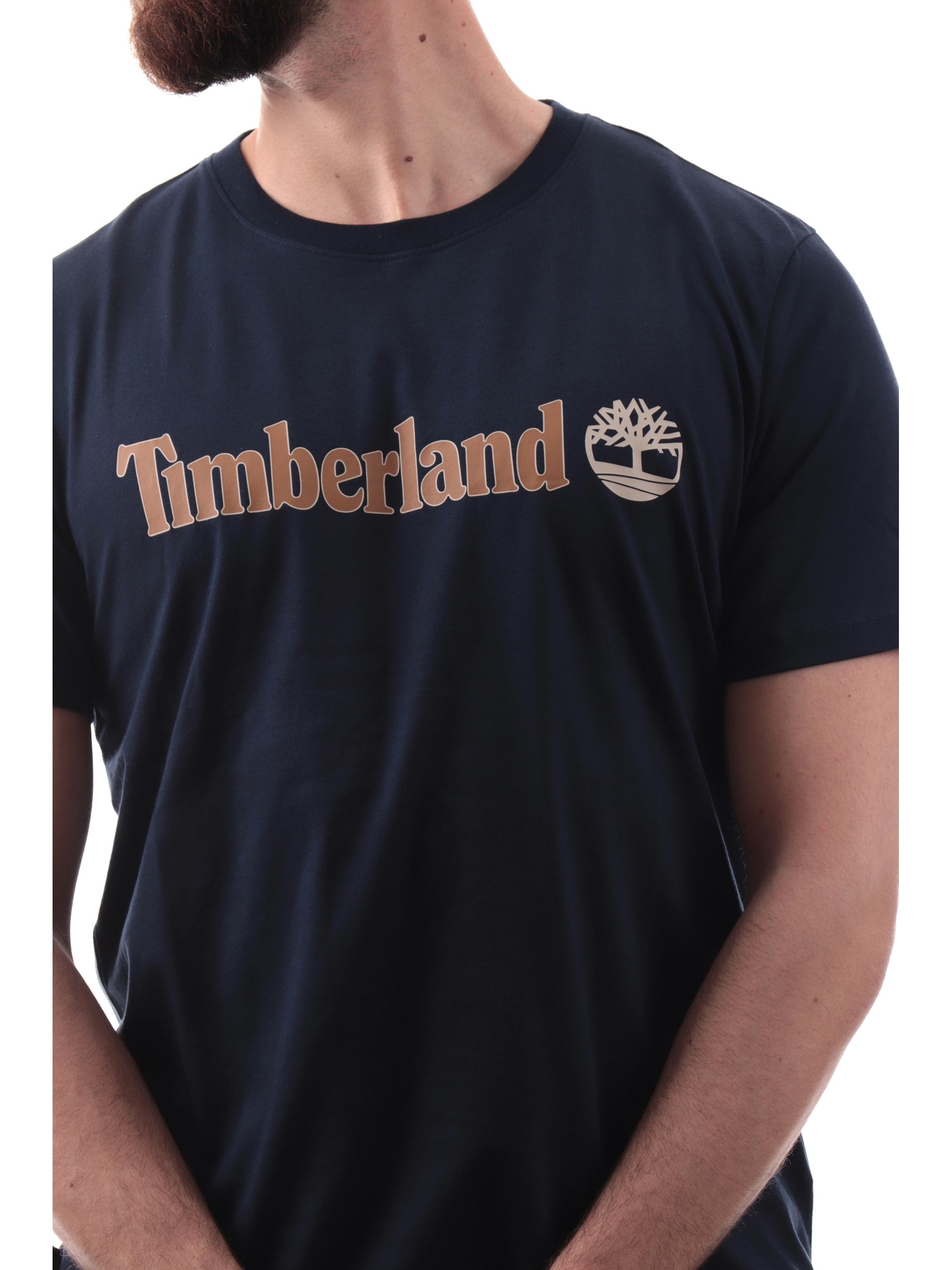 Maglia Timberland blu da uomo maxi stampa Timberland Kennebec River TB0A5UPQ, realizzata in 100% puro cotone. Questa t-shirt Timberland blu girocollo ha le maniche corte e la maxi stampa Timberland acontrasto colore.