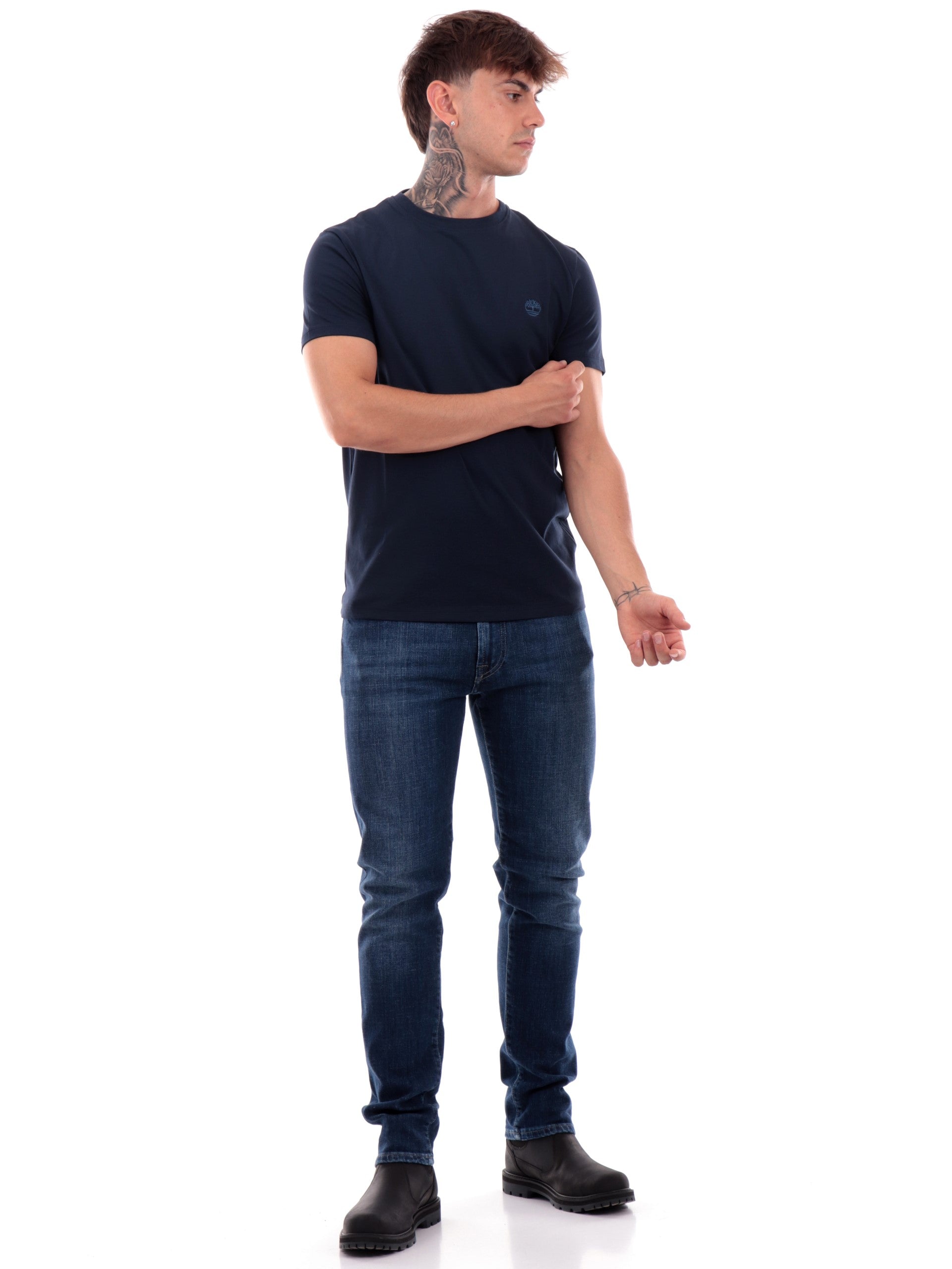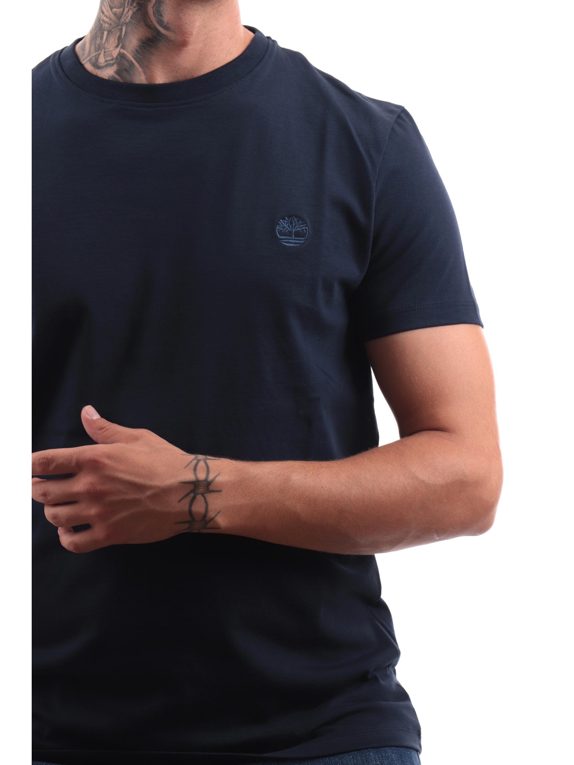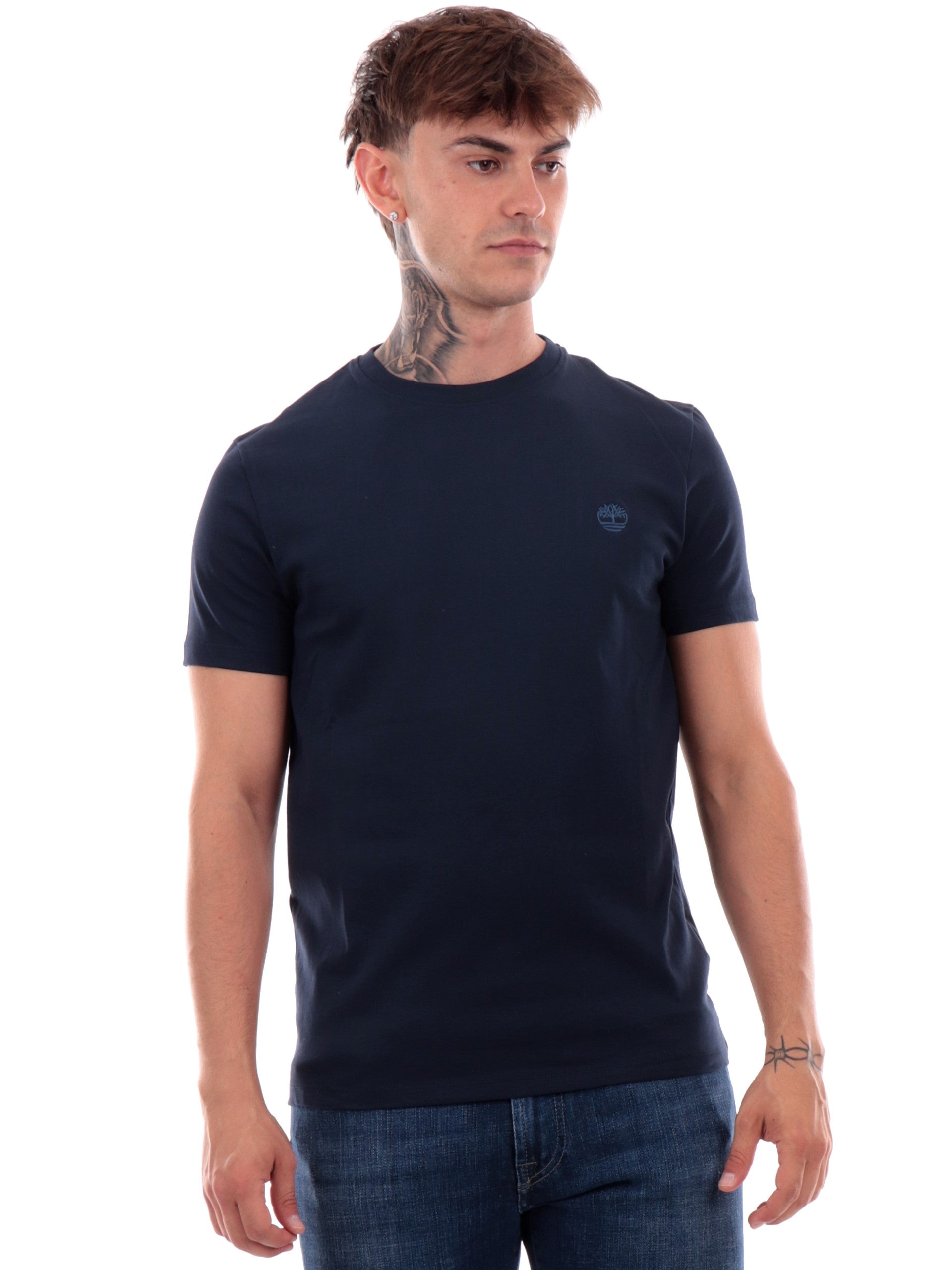 T-shirt Timberland blu da uomo con logo Dunstan River TB0A2BPR, realizzata in 100% puro cotone. Questa maglia Timberland blu ha il girocollo realizzato in tessuto a costine, le maniche corte, il fondo regolare e il logo del brand ricamato sul cuore a contrasto colore.