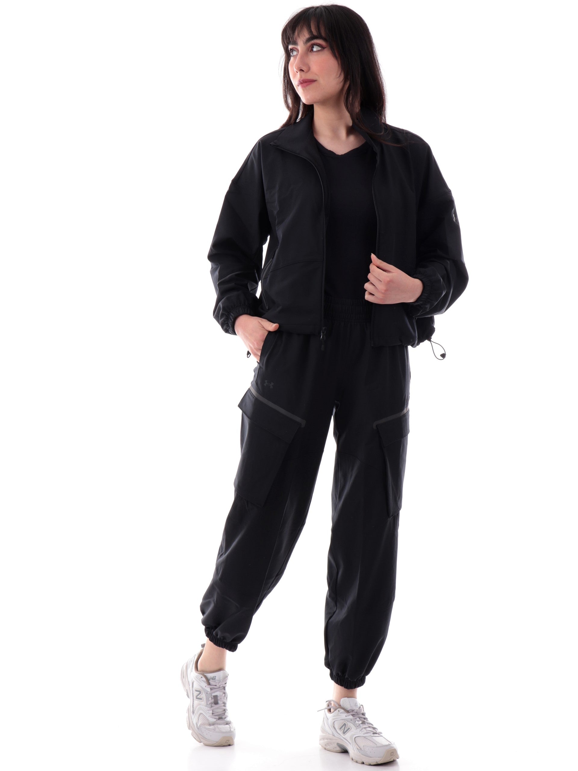 Pantaloni cargo Under Armour neri tessuto tecnico da donna Unstoppable 13864810. Questi cargo Under Armour neri hanno la banda elastica sul punto vita regolabile con laccetti interni, due tasche laterali aperte, due tasconi altezza ginocchio, polsini elasticizzati e il logo Under Armour applicato sul lato destro.