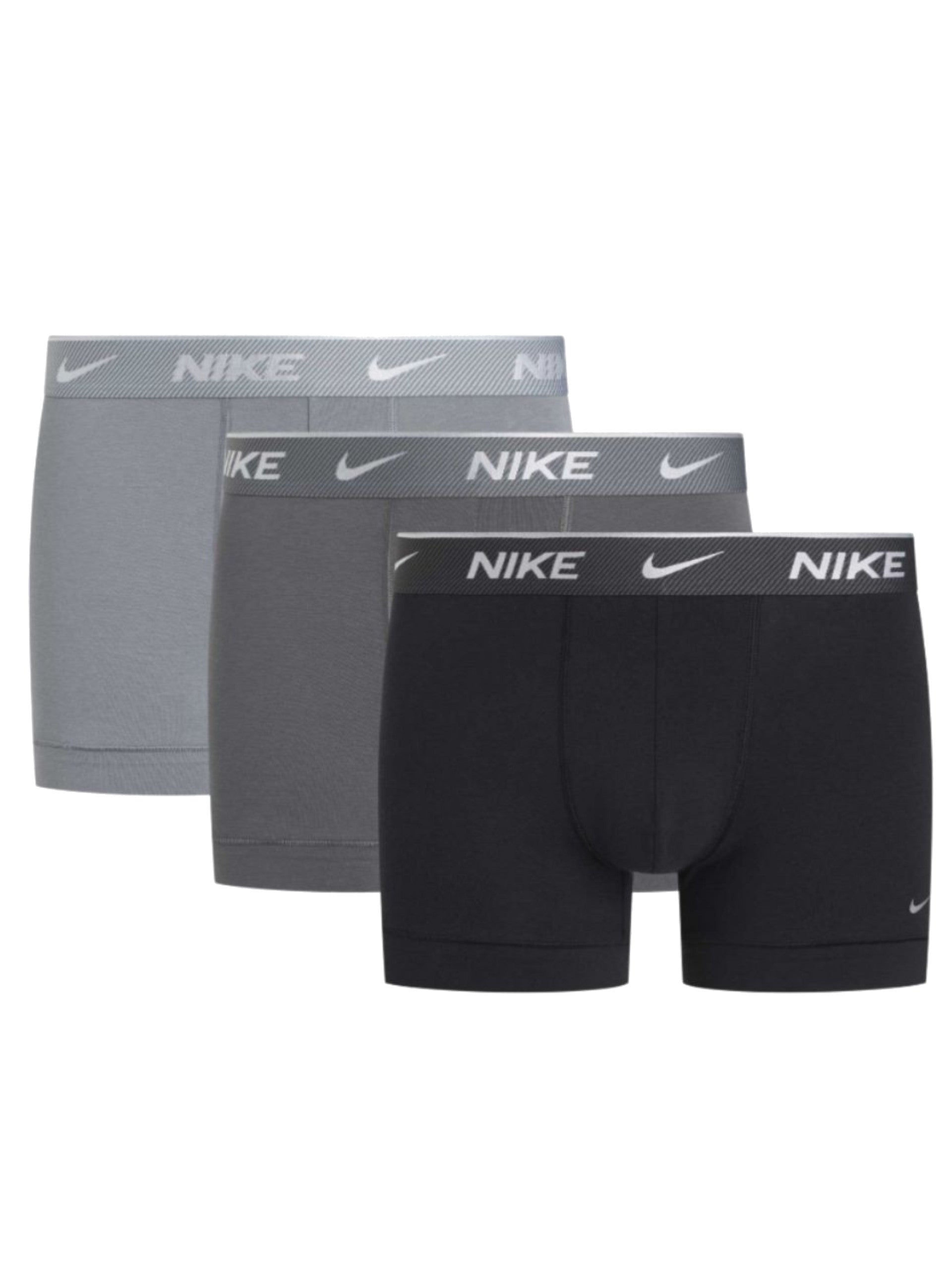 Boxer Nike grigi e neri da uomo x3 Trunk 0000KE1008. Queste mutande Nike grigie hanno la banda elastica sul punto vita con logo Nike a contrasto colore e sono state realizzate con la tecnologia DRI-FIT, che garantisce il massimo comfort durante tutta la giornata.