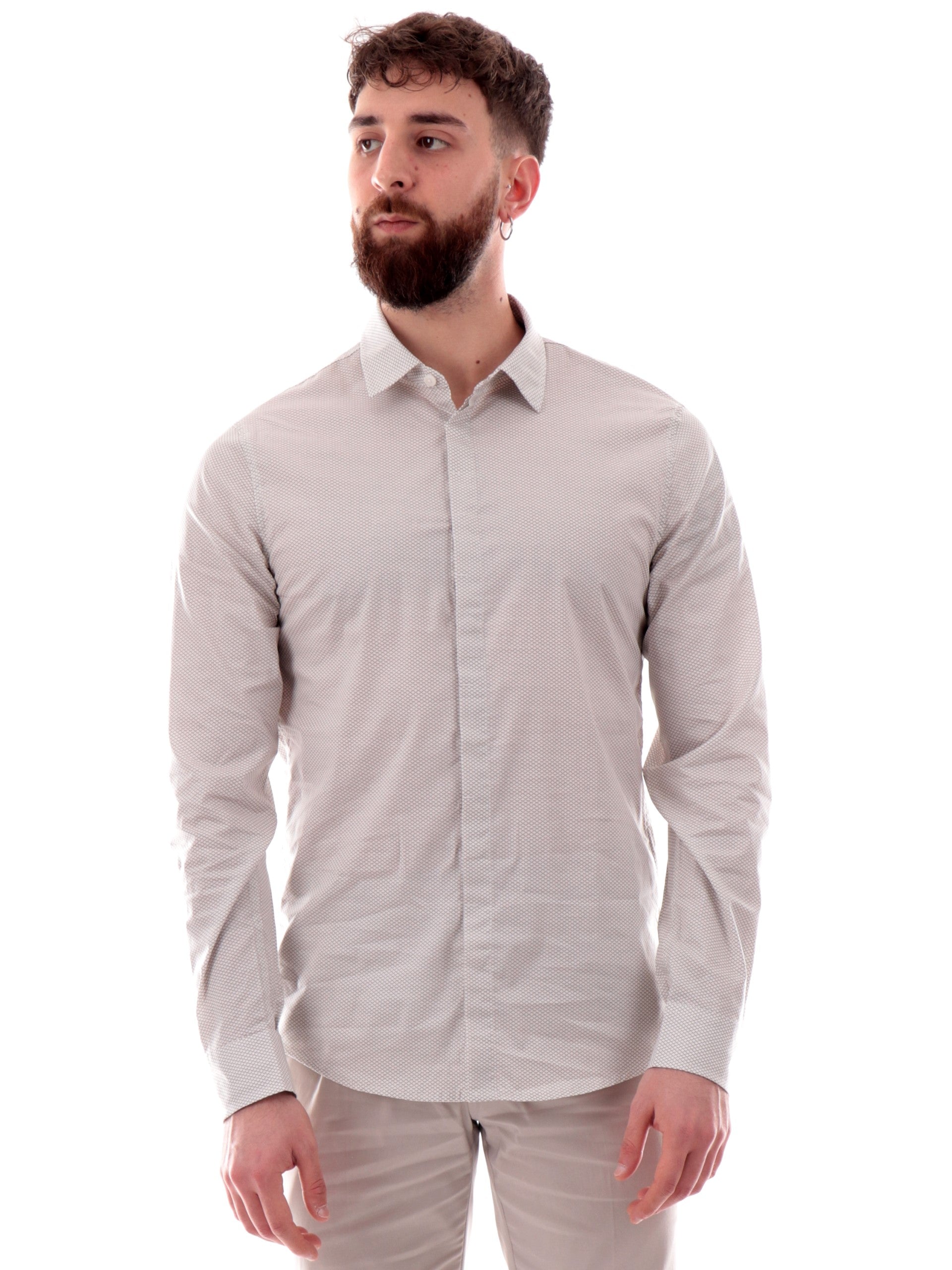 Camicia Armani Exchange AX bianca da uomo fantasia geo XM000625AF13184, realizzata in cotone. Questa camicia AX bianca ha il colletto alla francese, la chiusura con bottoni nascosta da una patta, le maniche lunghe con polsini e la fantasia geo.