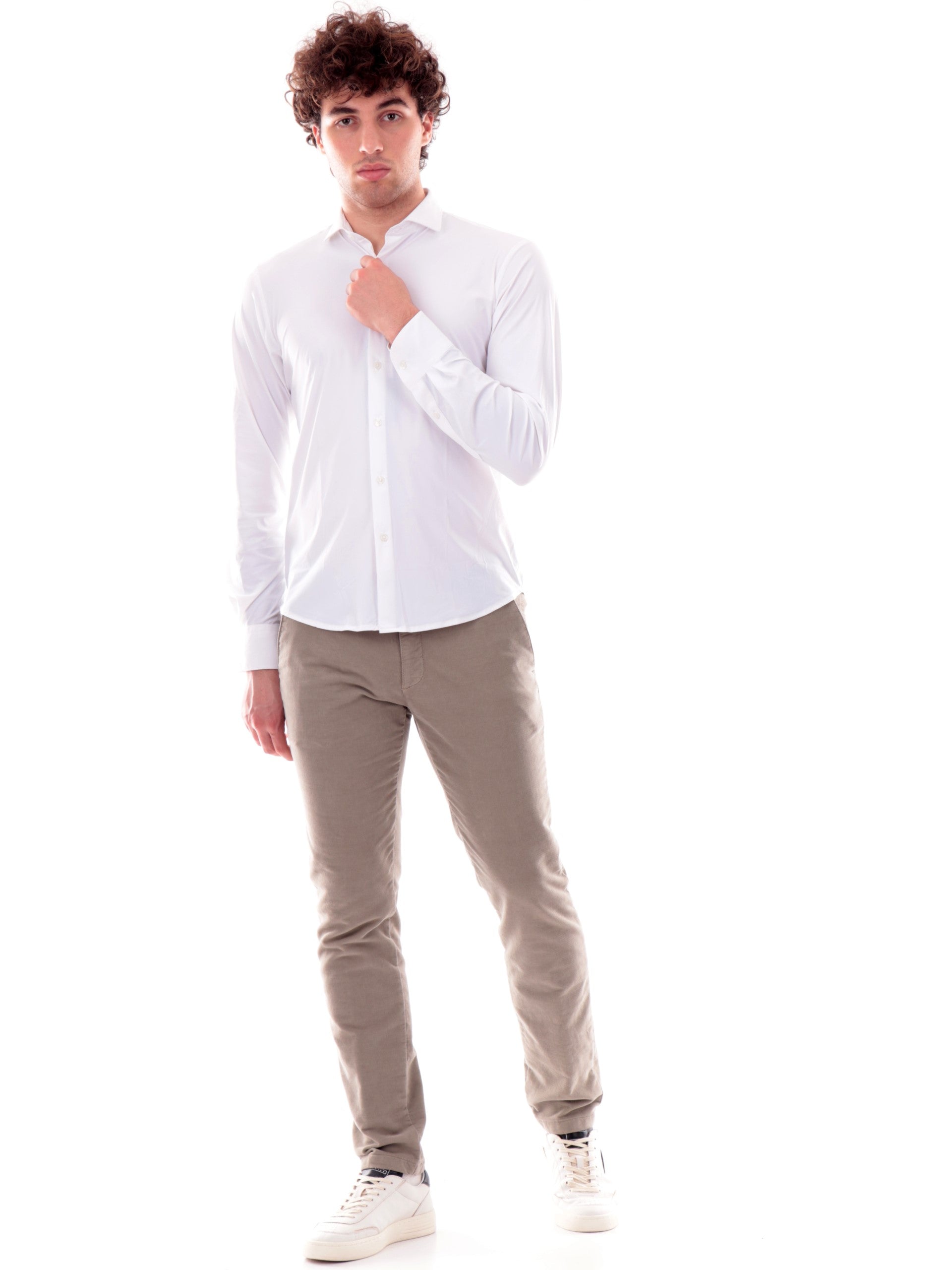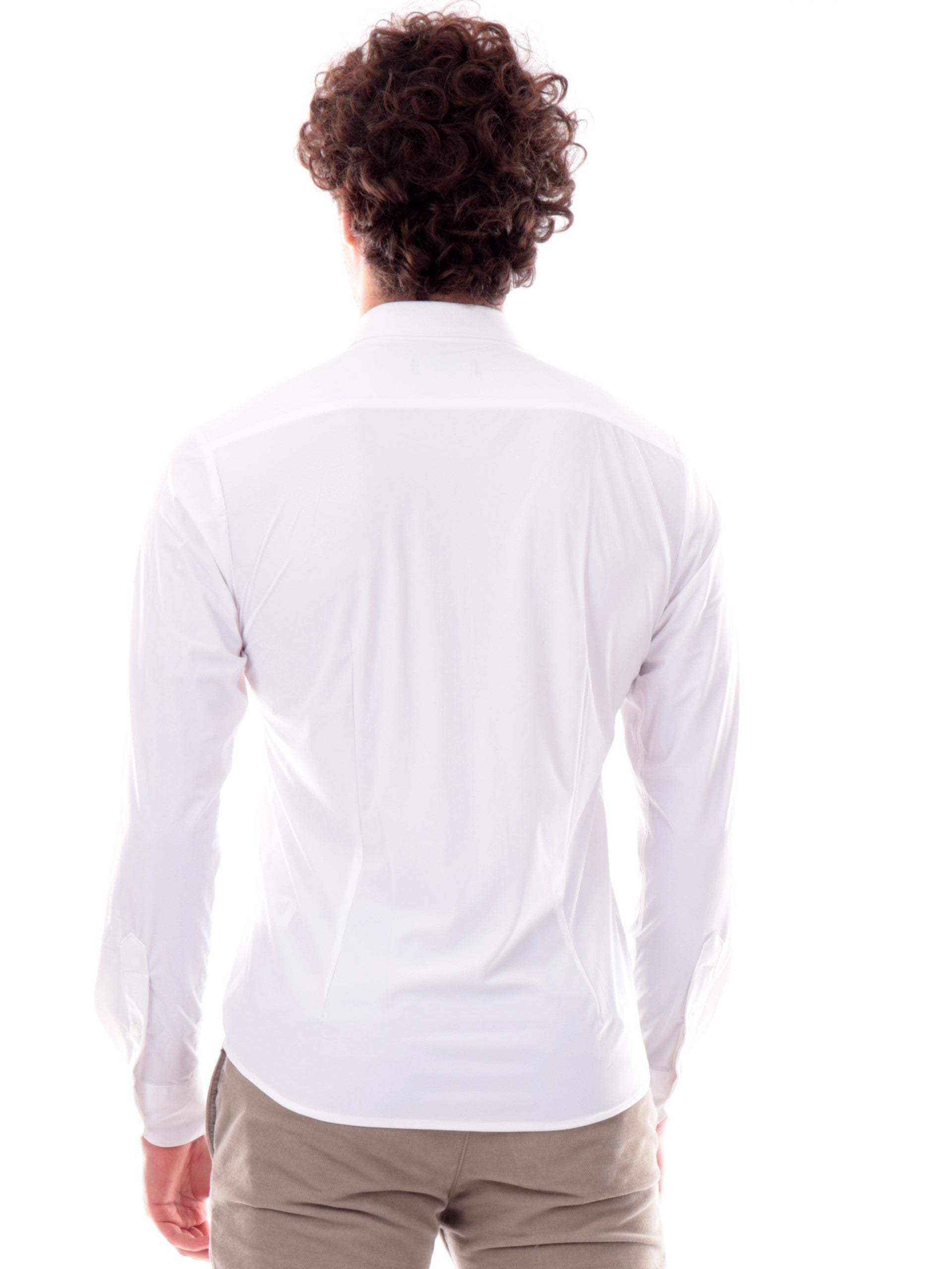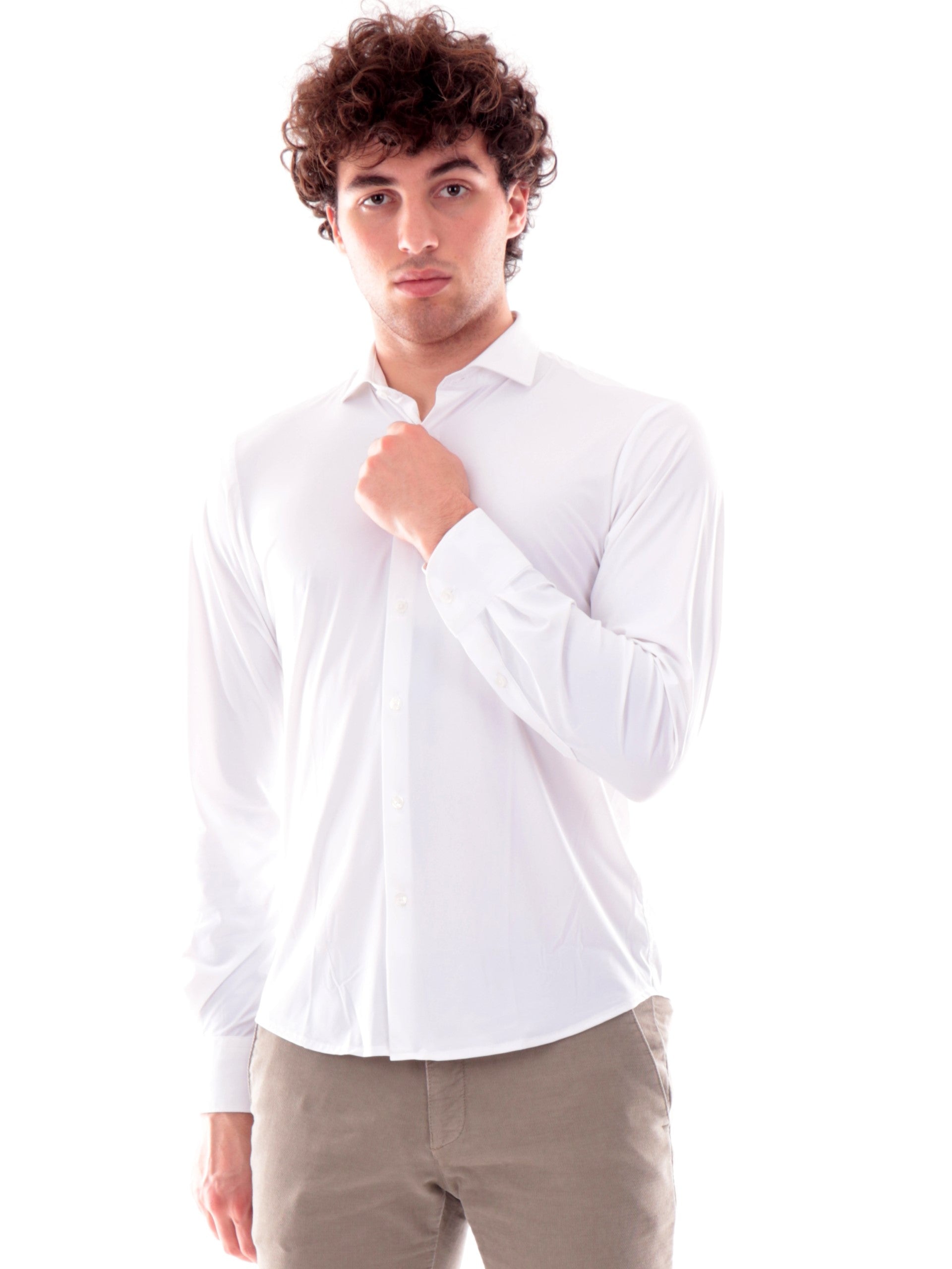 Camicia Yes Zee bianca da uomo collo alla francese. Questa camicia bianca da uomo è realizzata da un tessuto tecnico ed elestico è caratterizzata dal colletto alla francese, chiusura centrale con bottoni, maniche lunghe, polsini regolabili con bottoni e fondo regolare