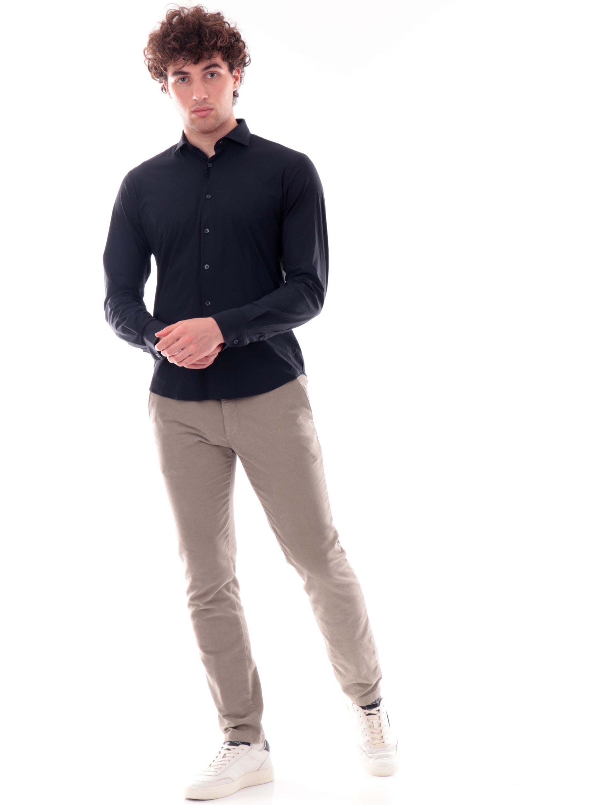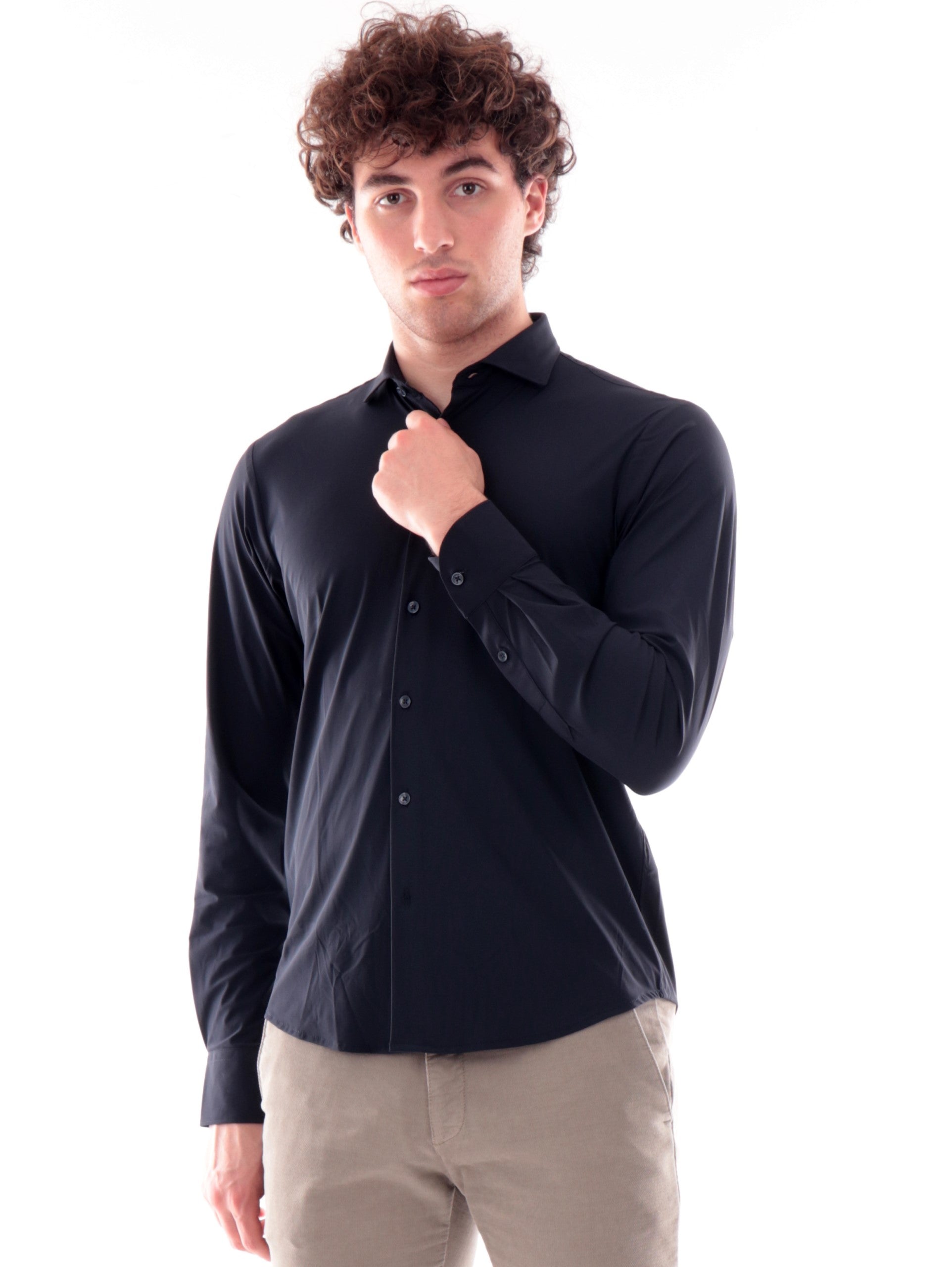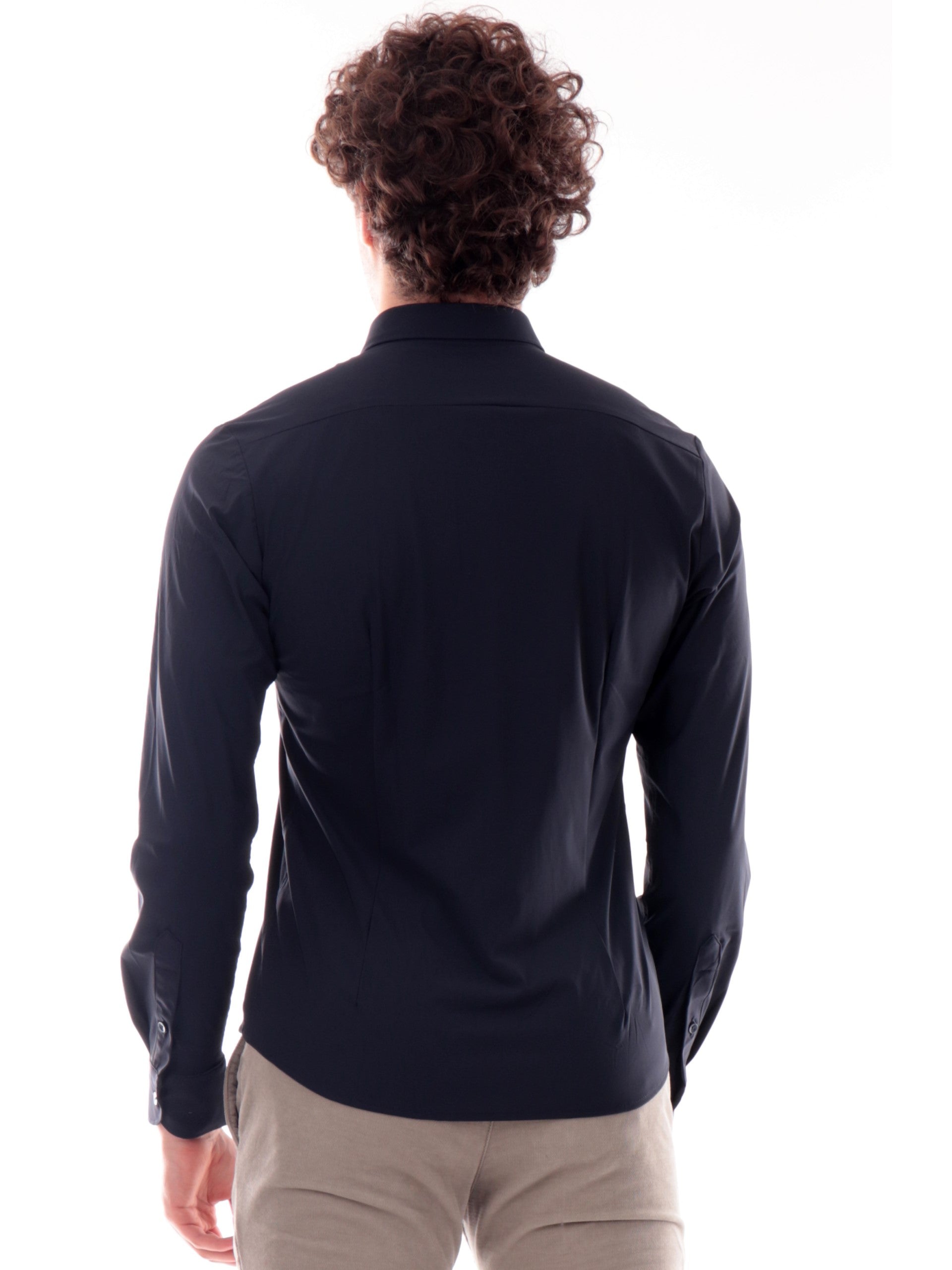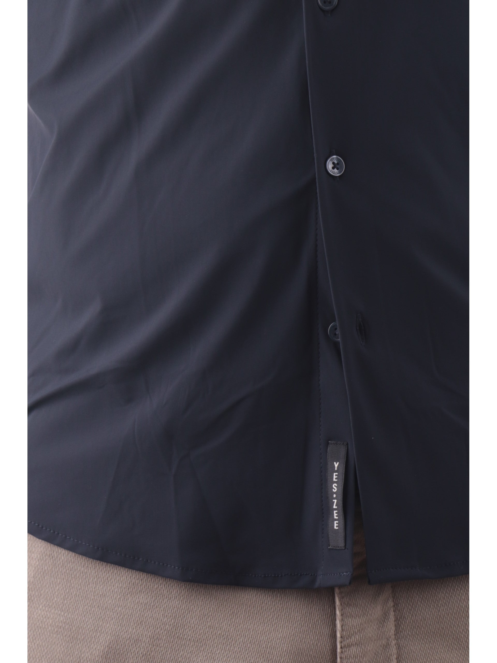Camicia Yes Zee blu da uomo collo alla francese. Questa camicia blu da uomo è realizzata da un tessuto tecnico ed elestico è caratterizzata dal colletto alla francese, chiusura centrale con bottoni, maniche lunghe, polsini regolabili con bottoni e fondo regolare