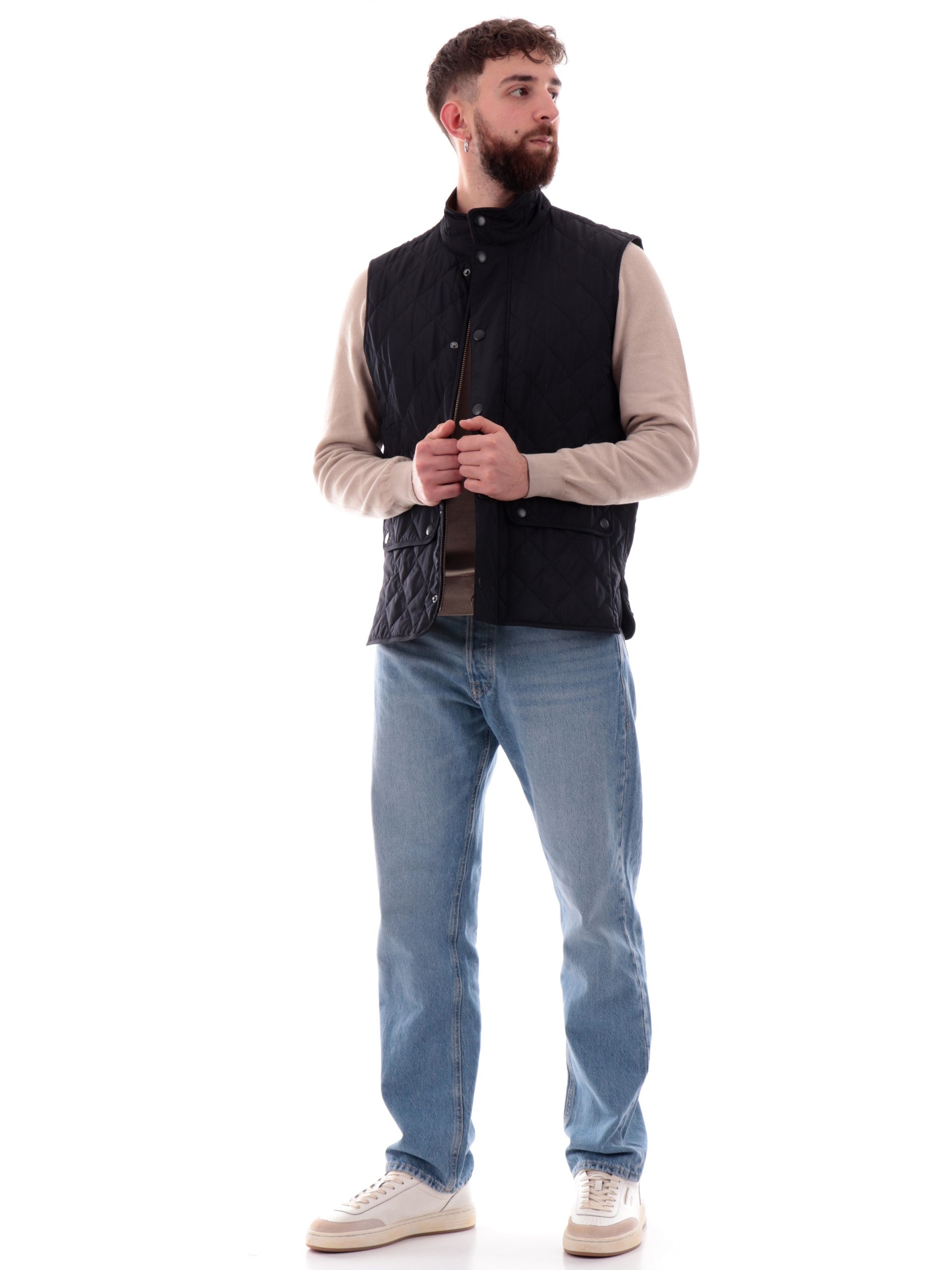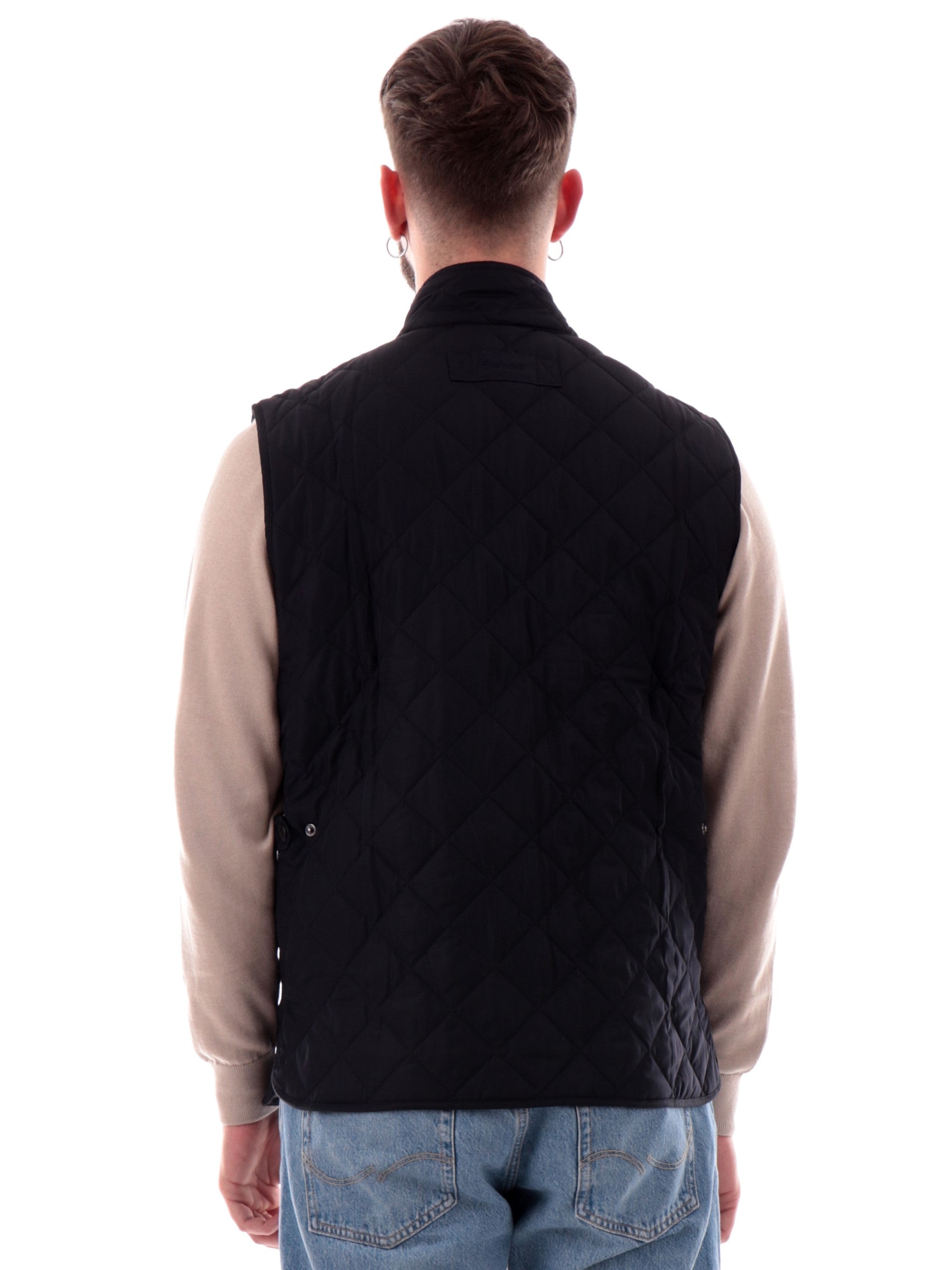 Gilet Barbour blu New Lowerdale da uomo trapuntato MGI0245, realizzato con imbottitura eco-friendly. Questo gilet uomo Barbour blu ha la chiusura full zip centrale nascosta da una patta con bottoni automatici, due tasche frontali con patta e il logo Barbour ricamato.