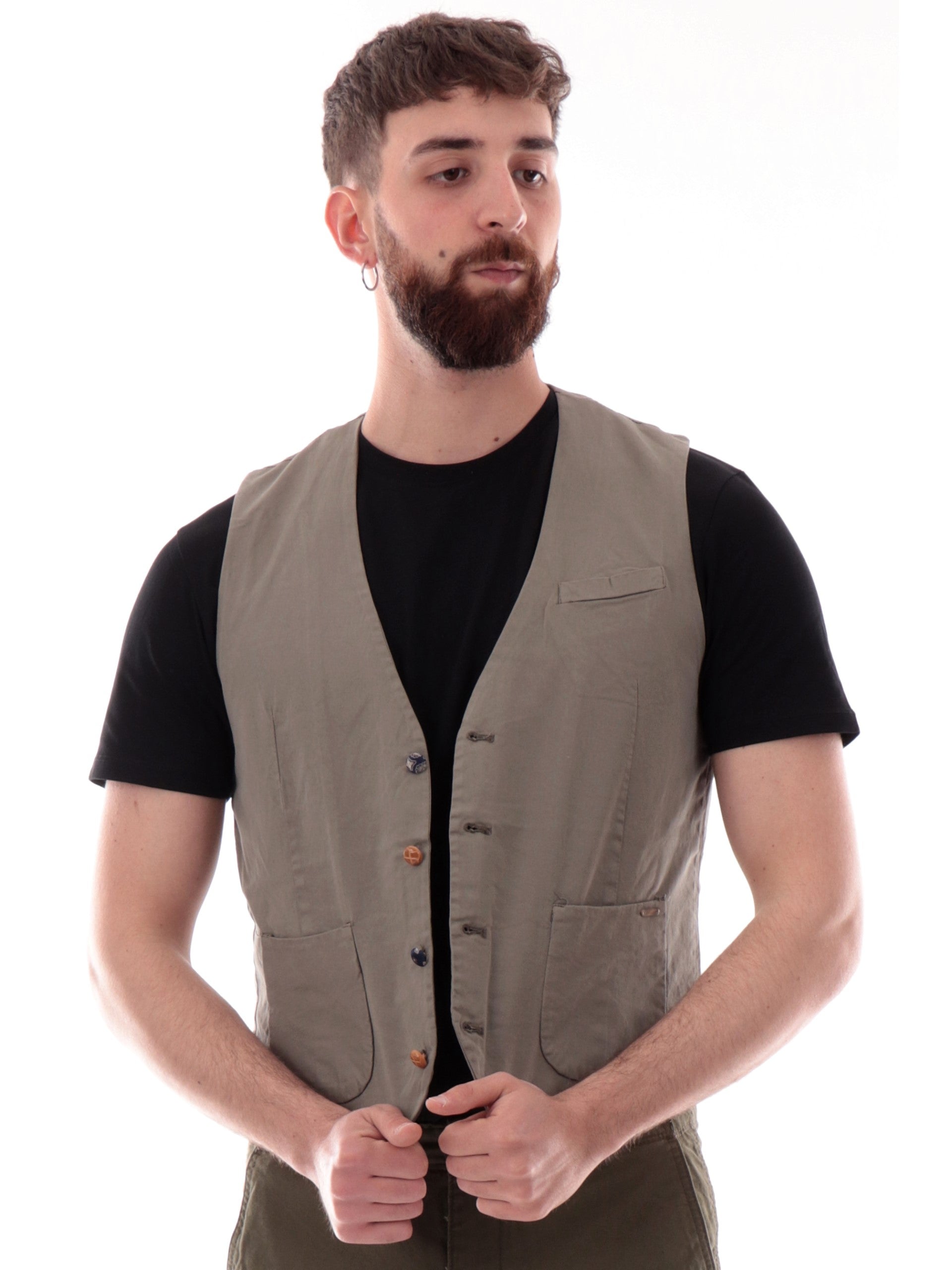 Gilet Gianni Lupo verde da uomo elegante con bottoni GL9710S25, realizzato in cotone. Questo gilet uomo Gianni Lupo ha la chiusura con bottoni, due tasche frontali a filo e un taschino lato cuore.