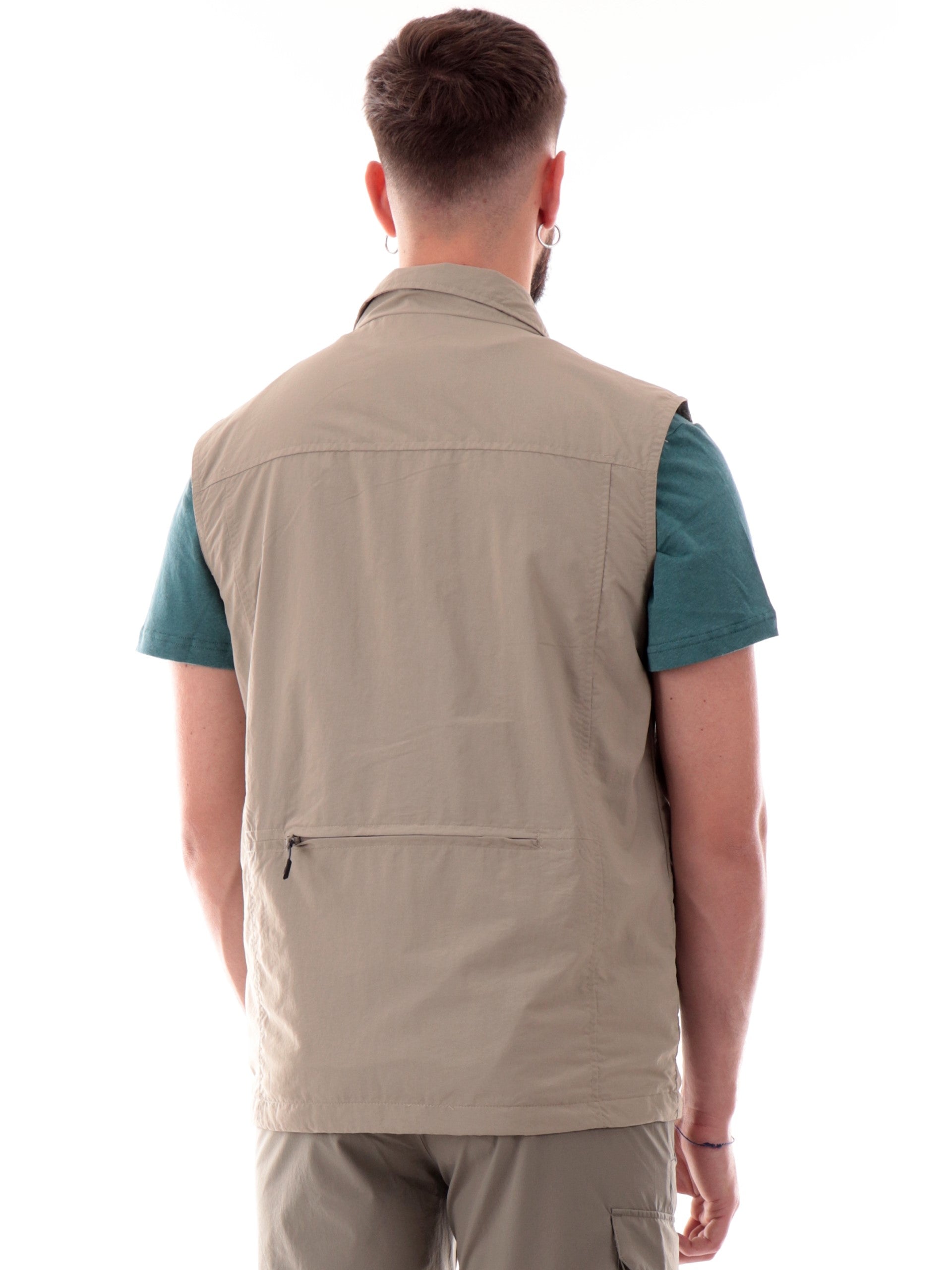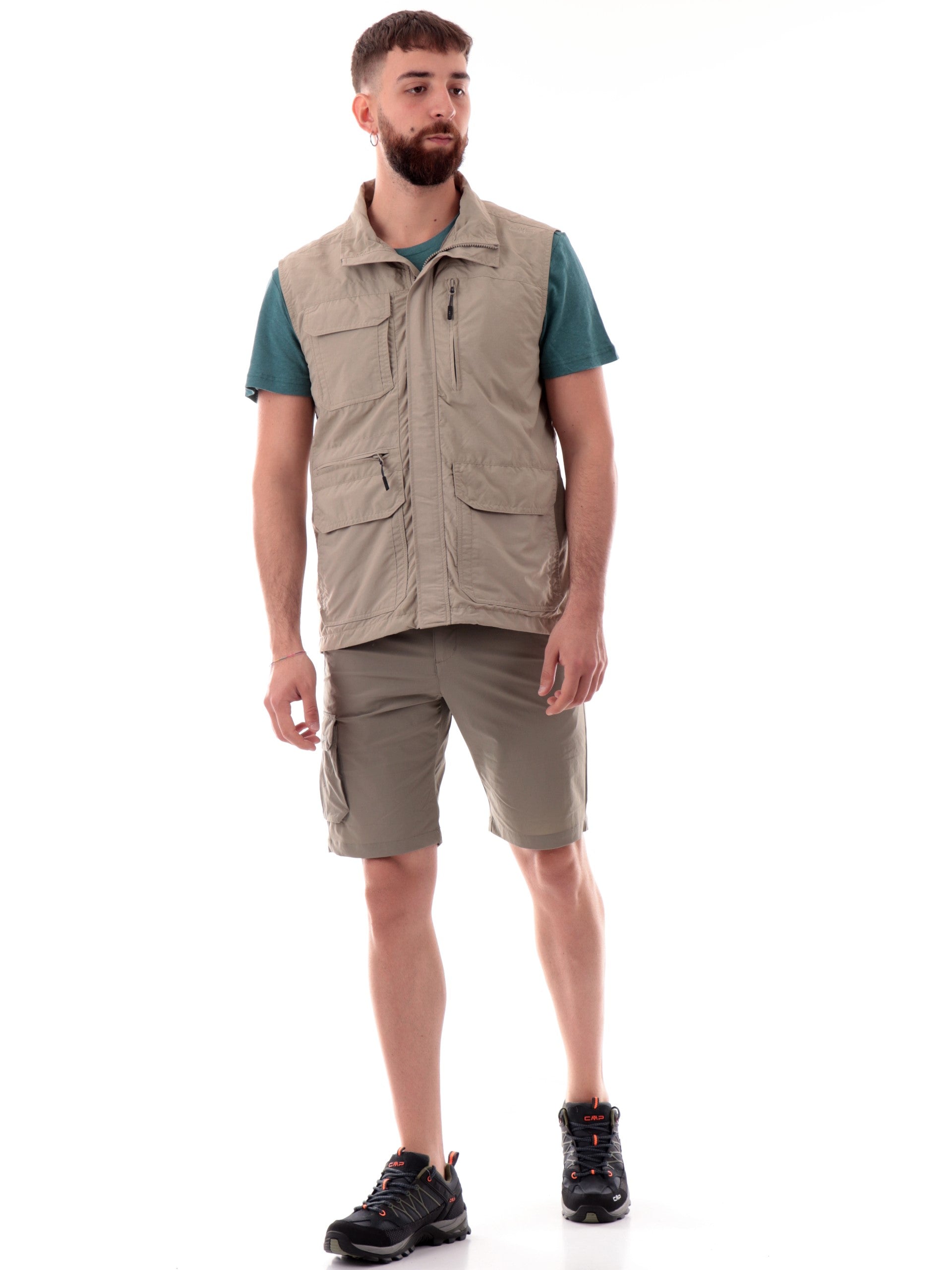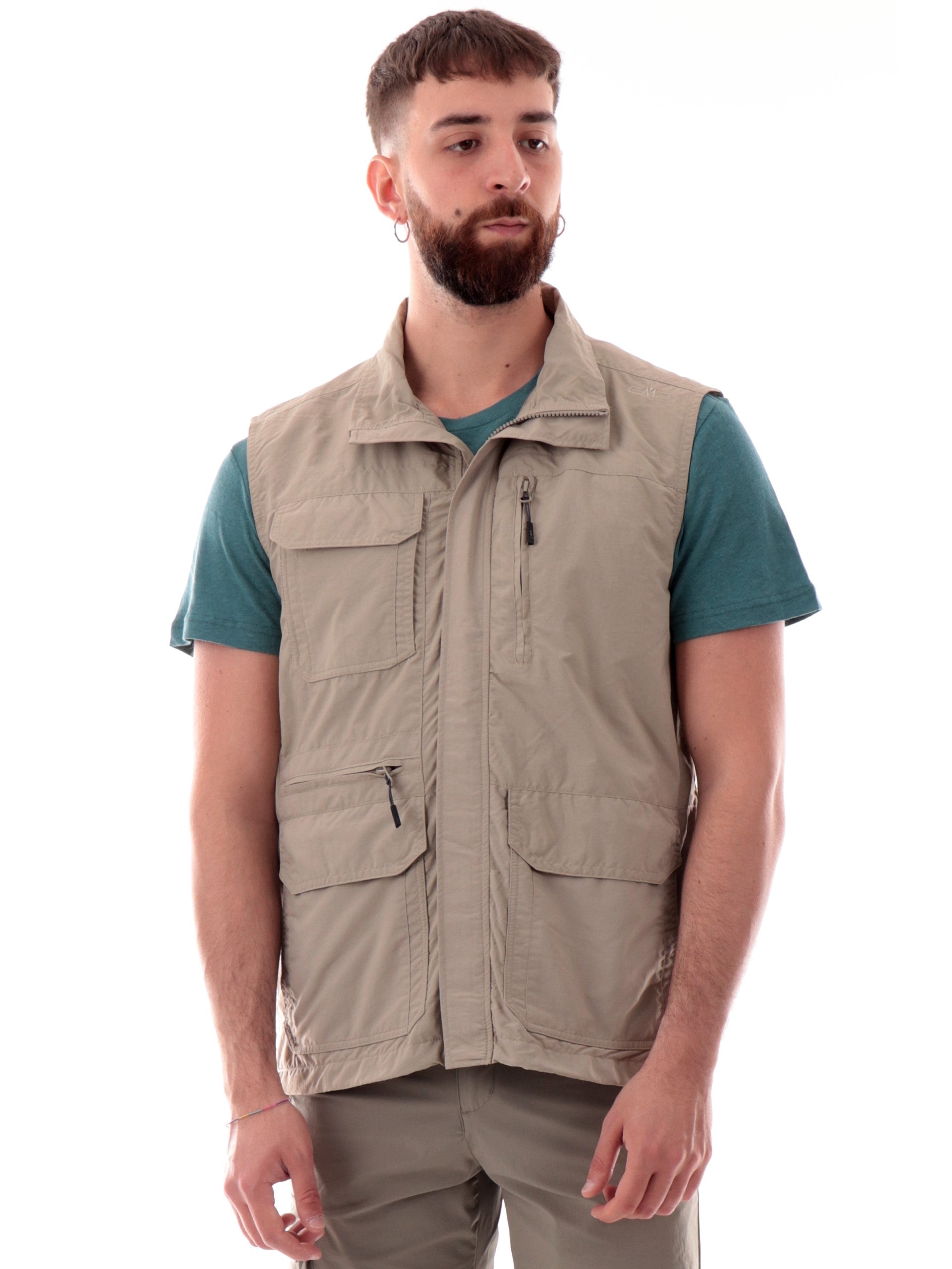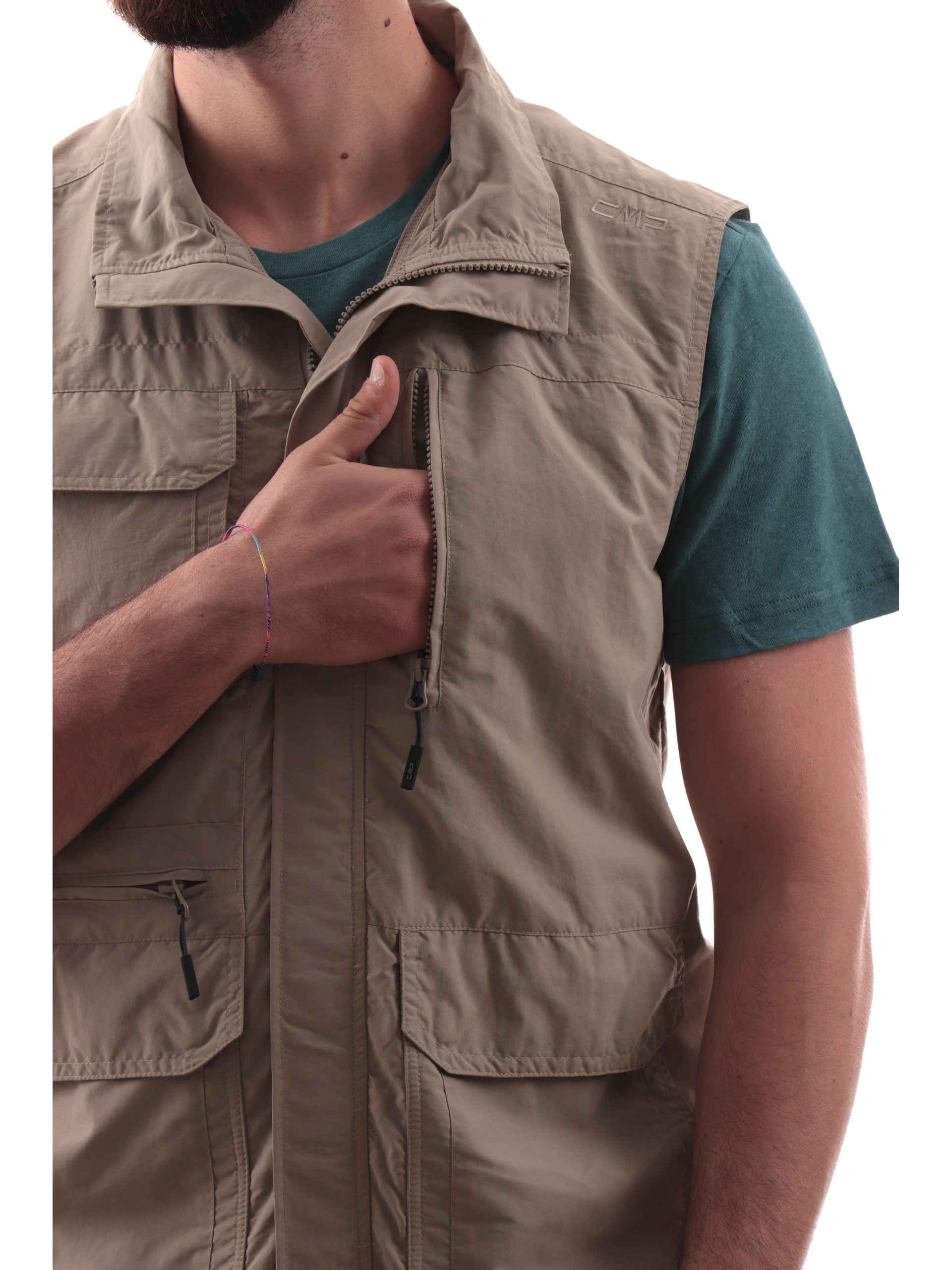 Gilet trekking CMP beige da uomo 30T6657. Questo gilet CMP beige è estremamente pratico grazie alle sue sei tasche, tre con chiusura con bottone automatico sul davanti, due con chiusura zip sul davanti e una posteriore con cerniera. Questo gilet da trekking Campagnolo da uomo ha la chiusura full zip nascosta da una patta in tessuto, la retina interna traspirante, il fondo regolabile con la doppiacoulisse ed il logo applicato sulla spalla sinistra tono su tono.