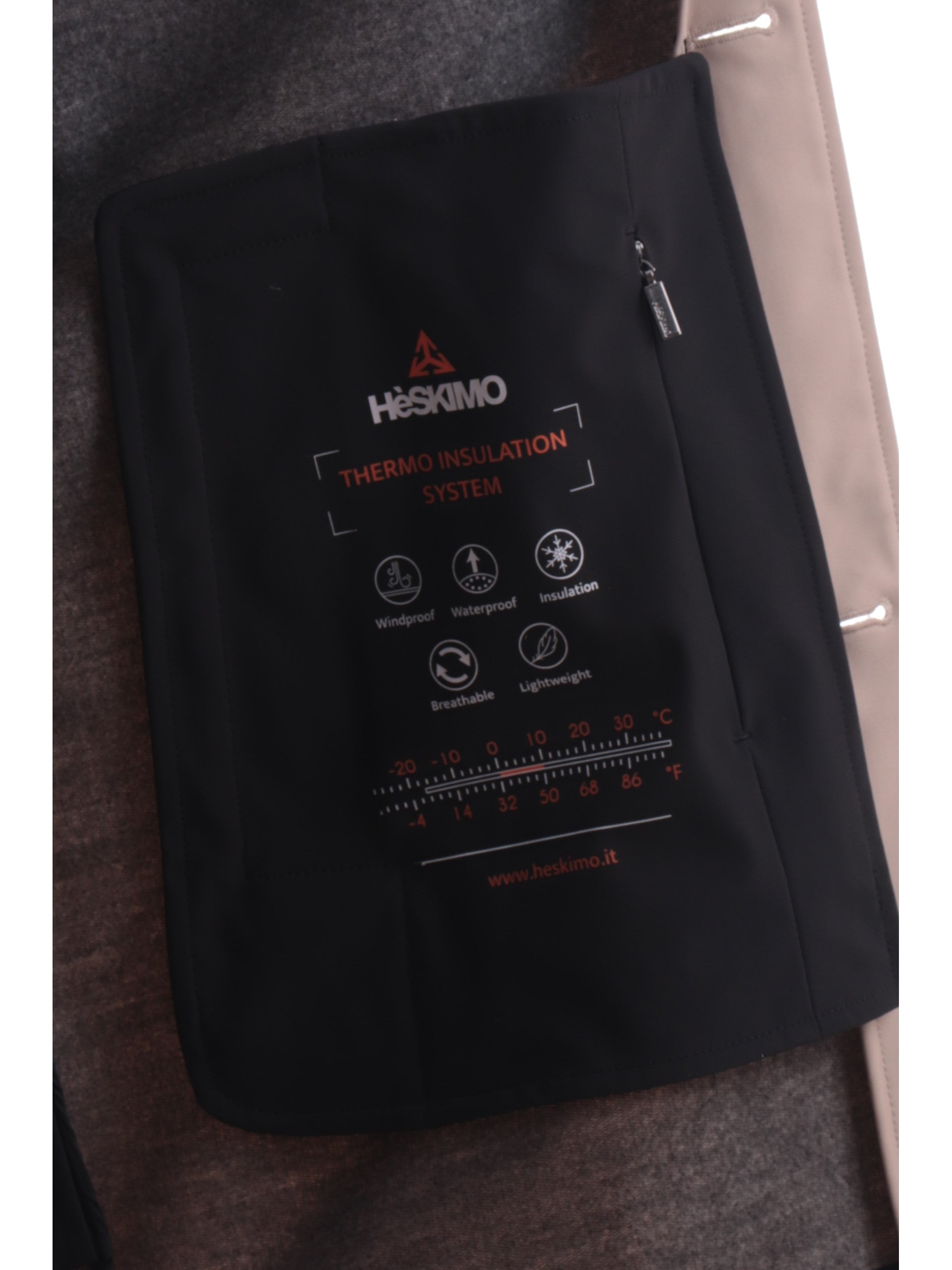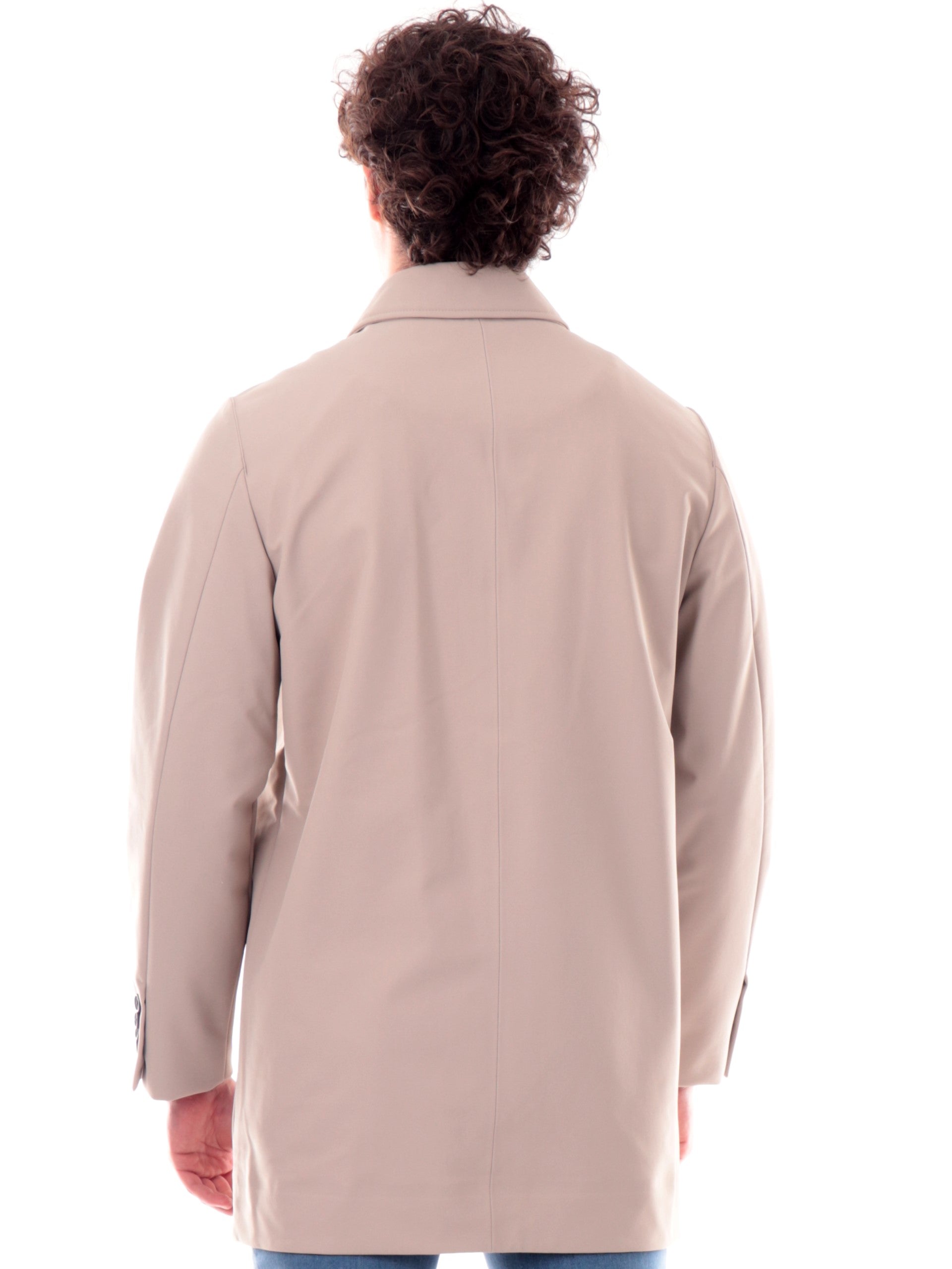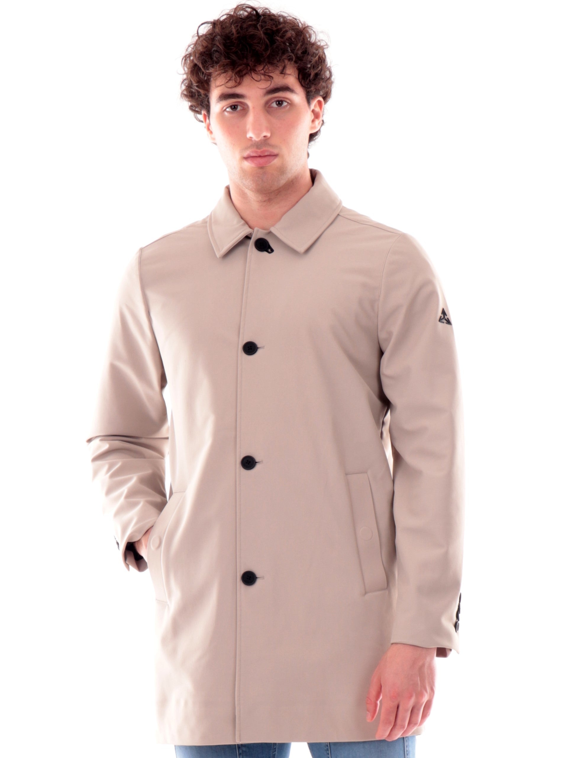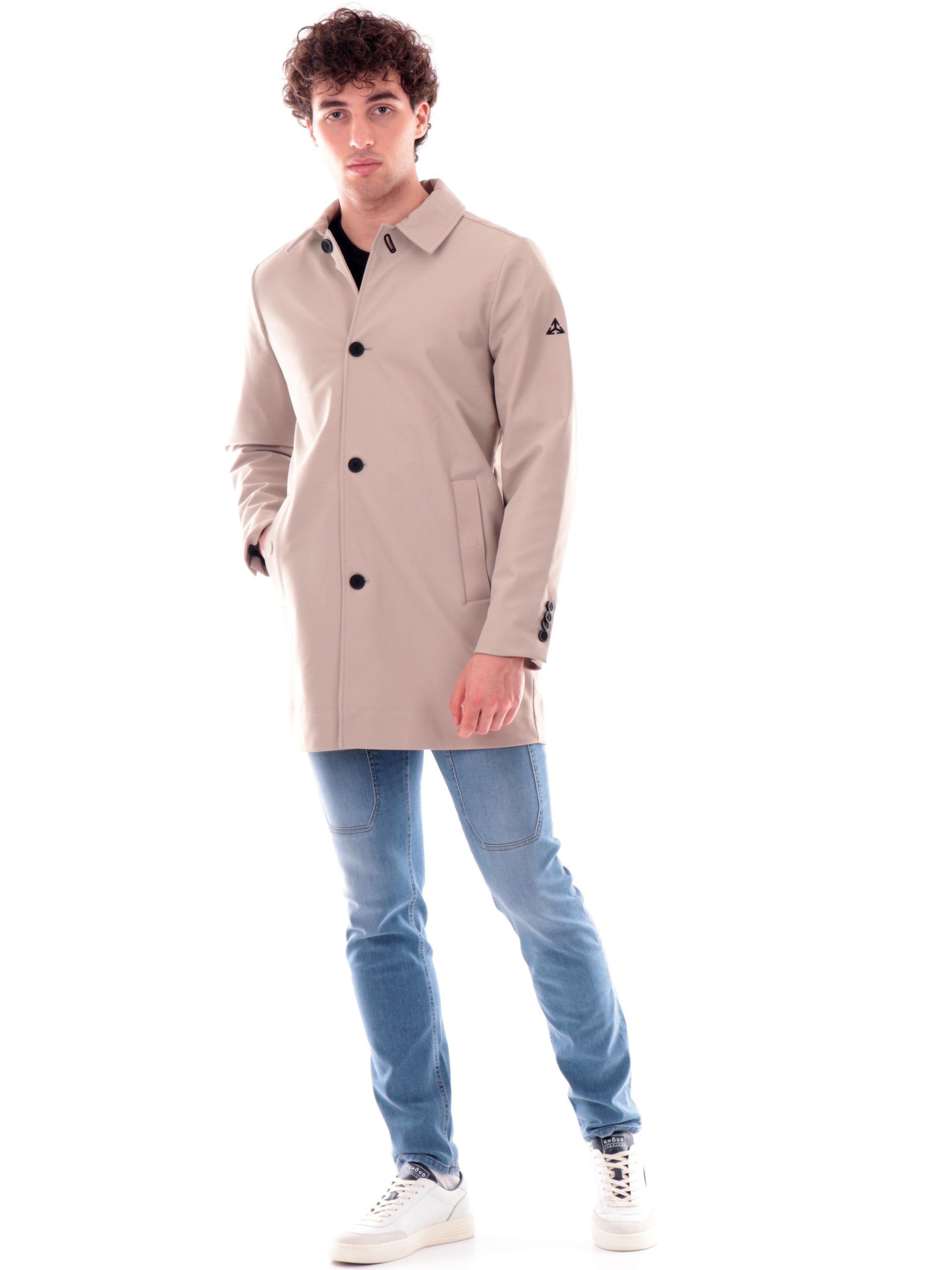 Cappotto Heskimo beige da uomo con colletto e chiusura con bottoni. Questo cappotto Heskimo beige è realizzato in tessuto tecnico resistente all'acqua. Dal fascino londinese questo cappotto si prestaanche ad essere abbinato ad abiti eleganti.