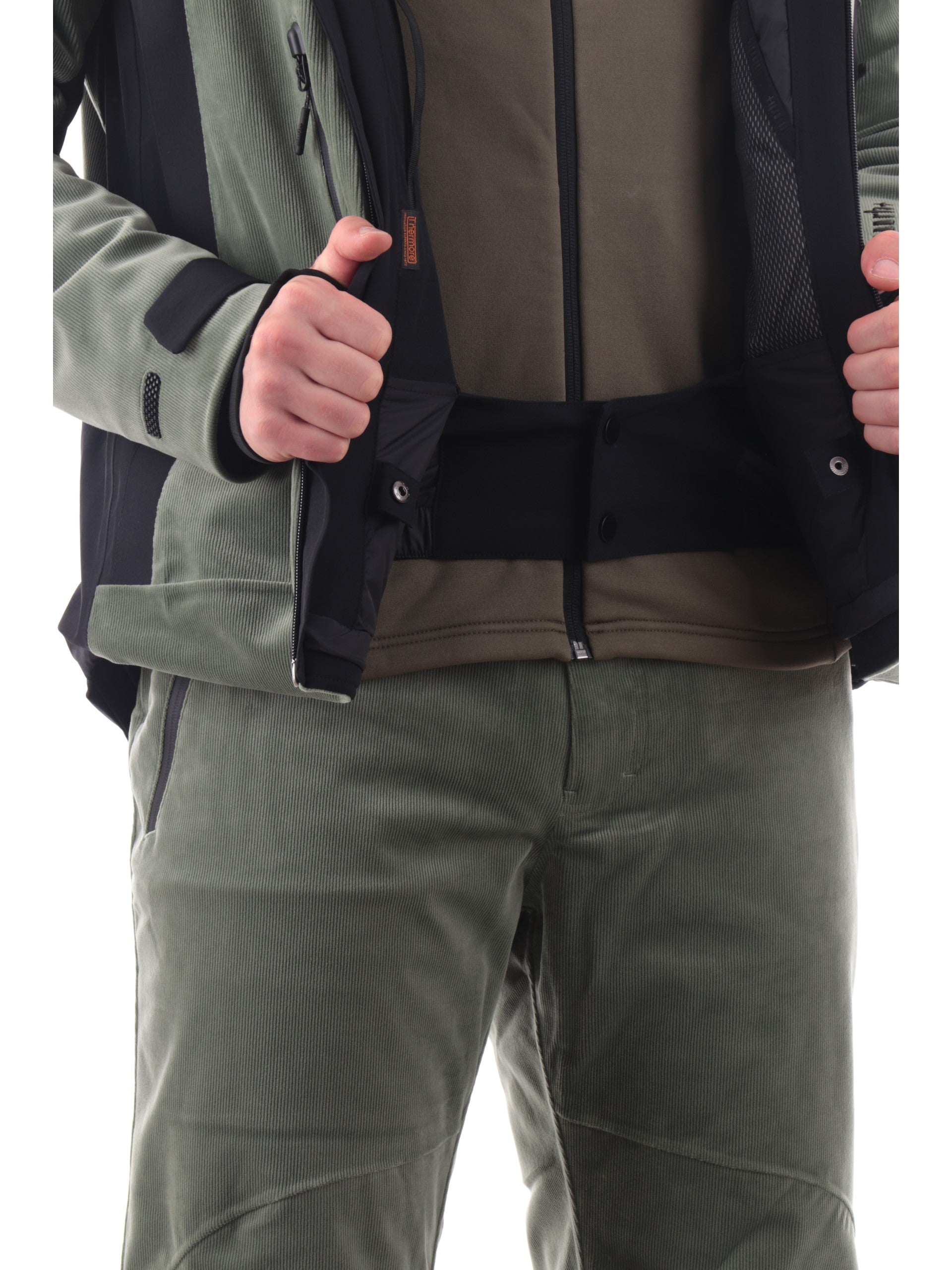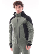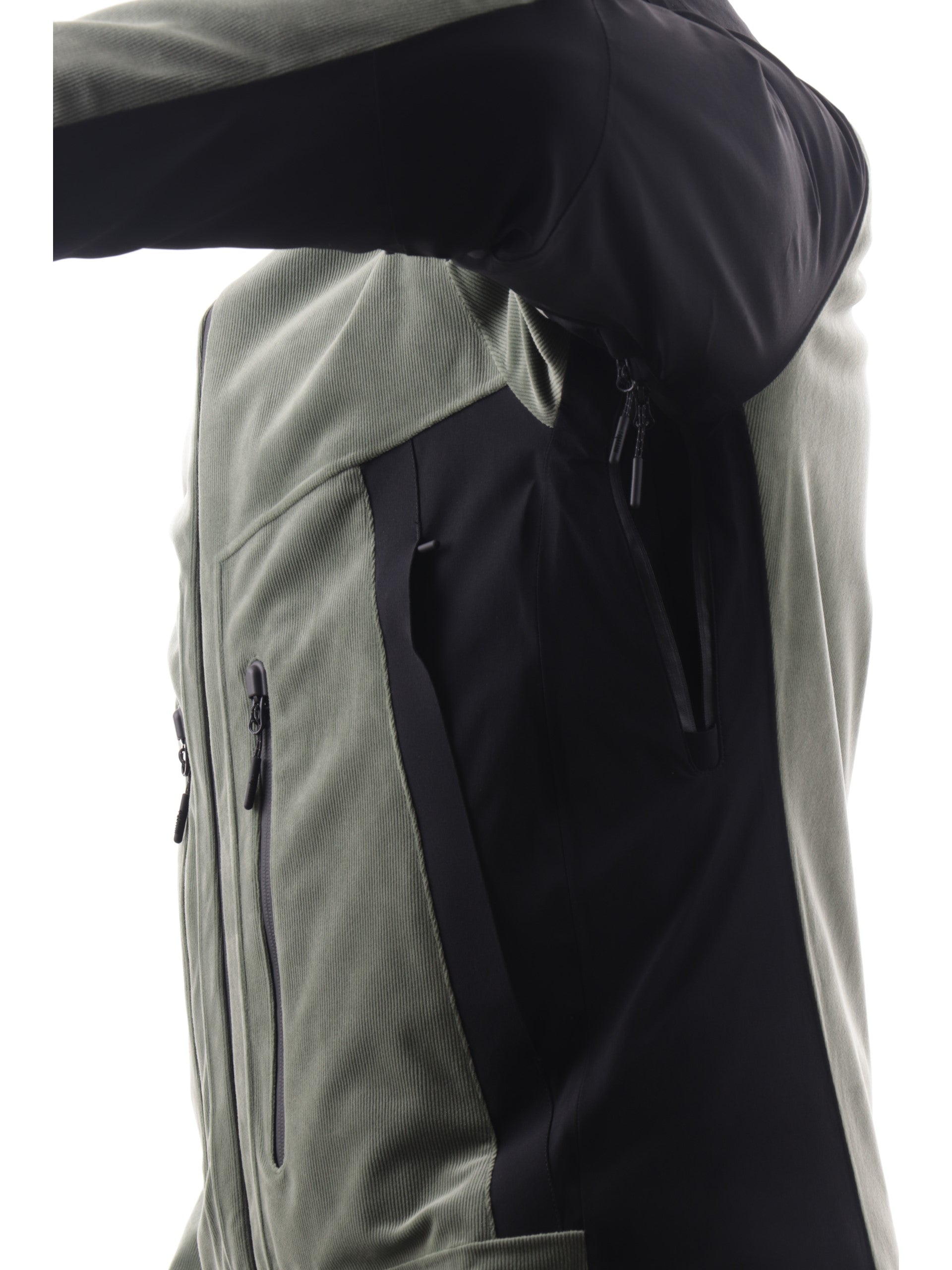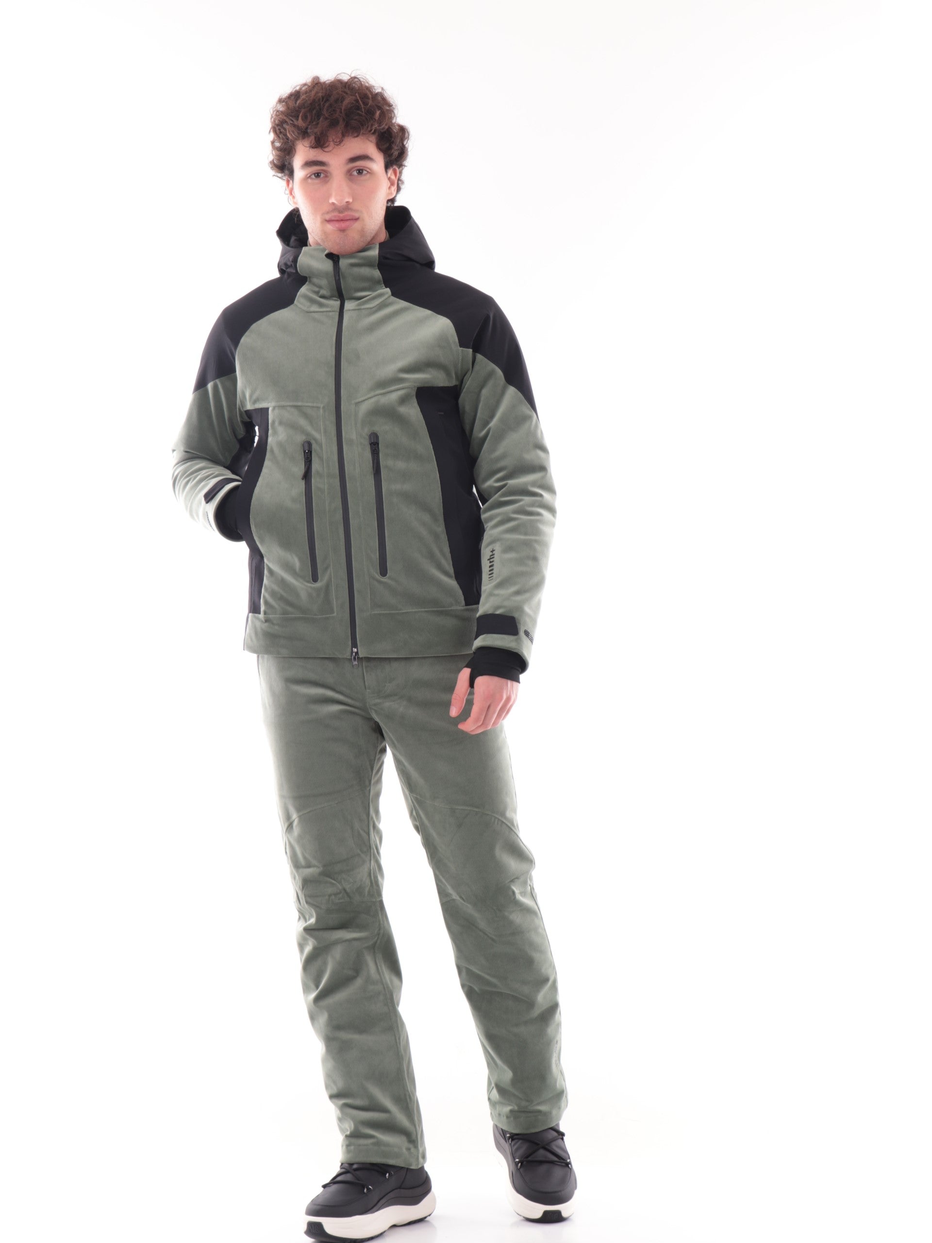 Giacca da sci verde RH+ da uomo BIMATERIC VELVET. Questa giacca tecnica rh+ è realizzata con un design bimaterico, combinando il tessuto principale Techno Corduroy Stretch con inserti in Ergonomic 4 Way Stretch per garantire massima libertà di movimento e comfort. Il capo è completamente nastrato per assicurare impermeabilità, mentre le maniche preformate e il fondo sagomato con coulisse interna offrono una vestibilità perfetta. Questo giubbino verde da uomo è caratterizzato dal cappuccio fisso regolabile, chiusura full zip due tasche laterali e due frontali con zip, polisini elasticizzati con un taschino porta ski-pass invisibile e fondo regolare con coulisse. All'interno di questo giubbino troviamo una tasca con zip e una aperta con il gancio