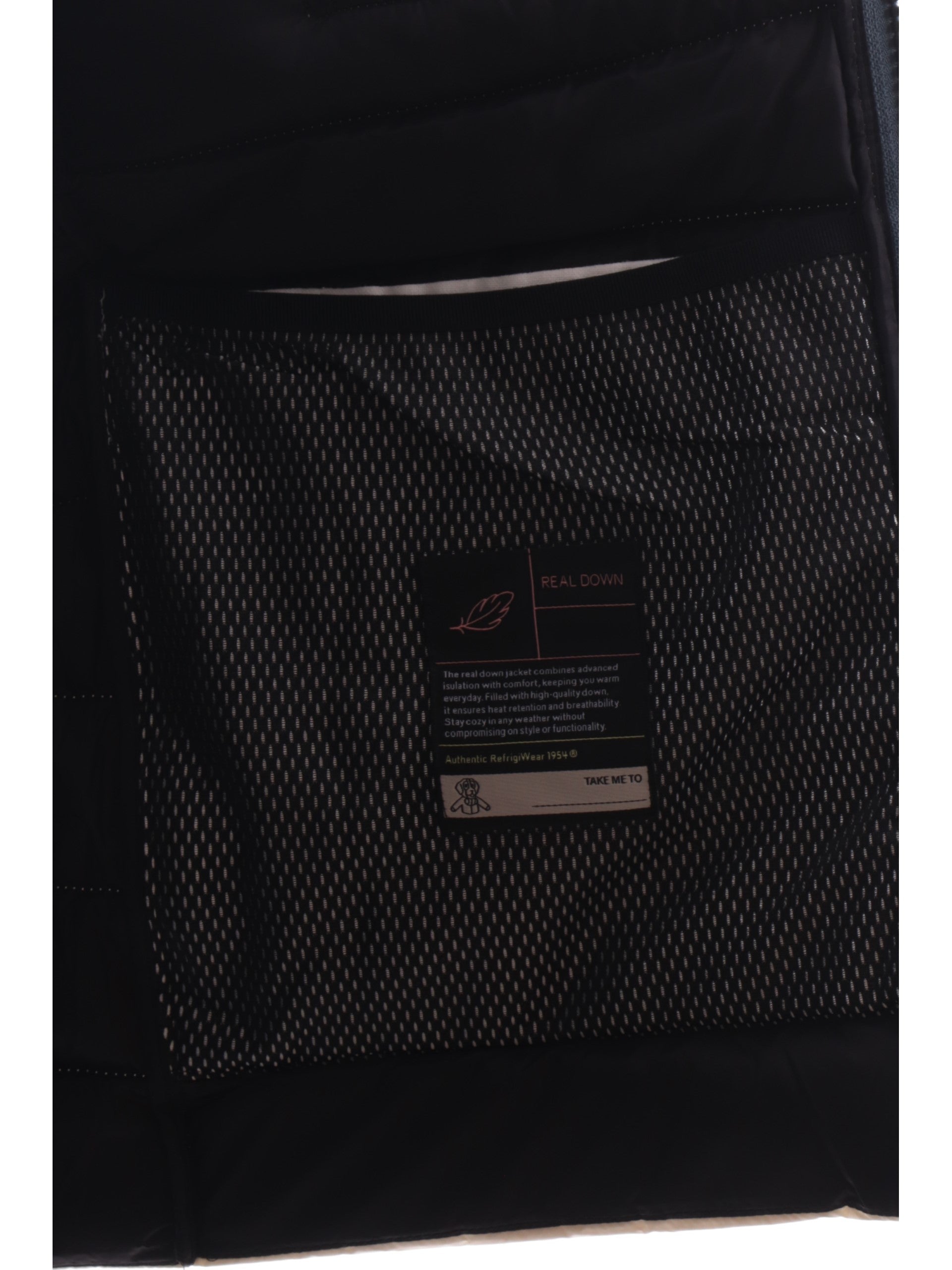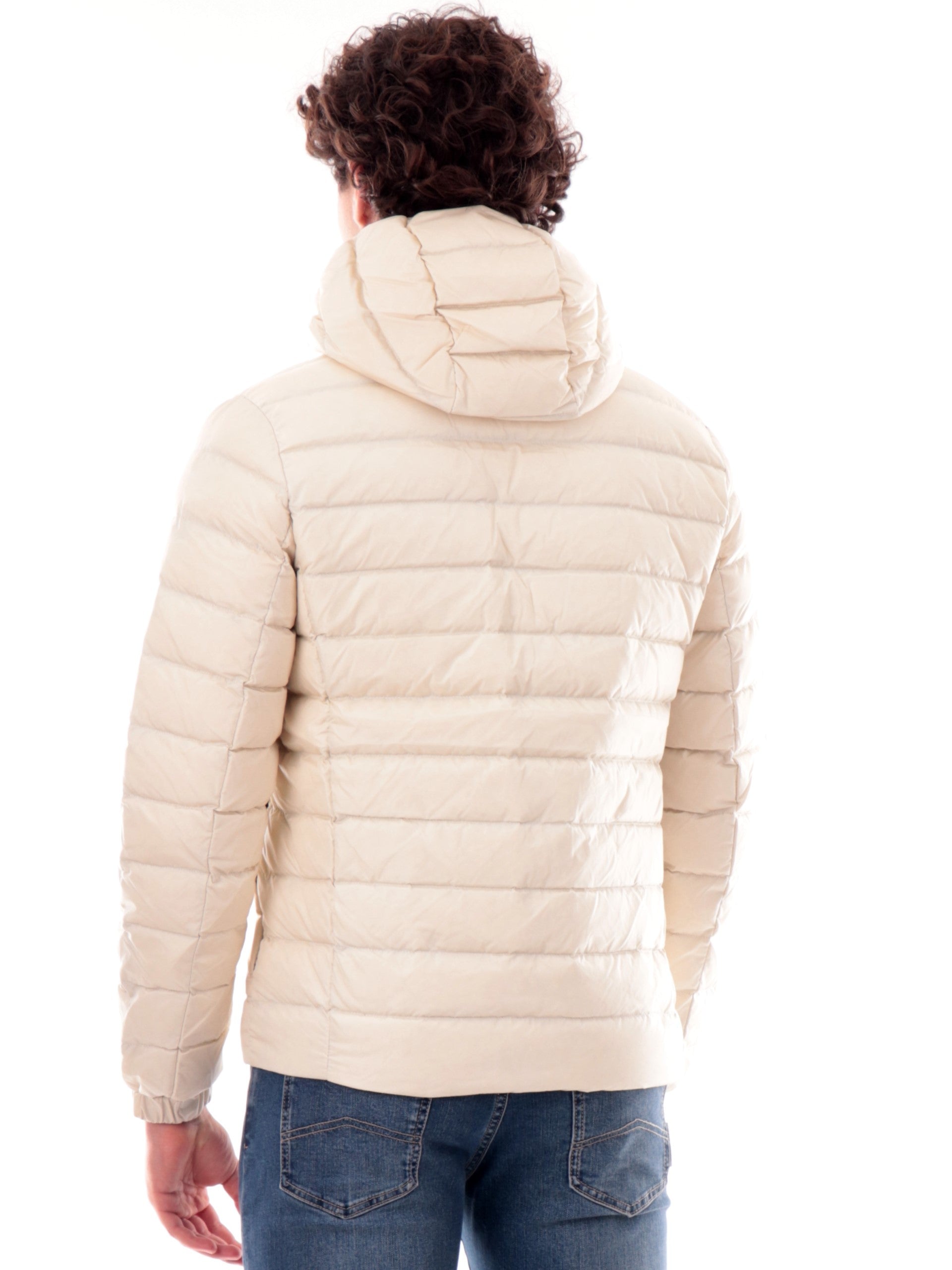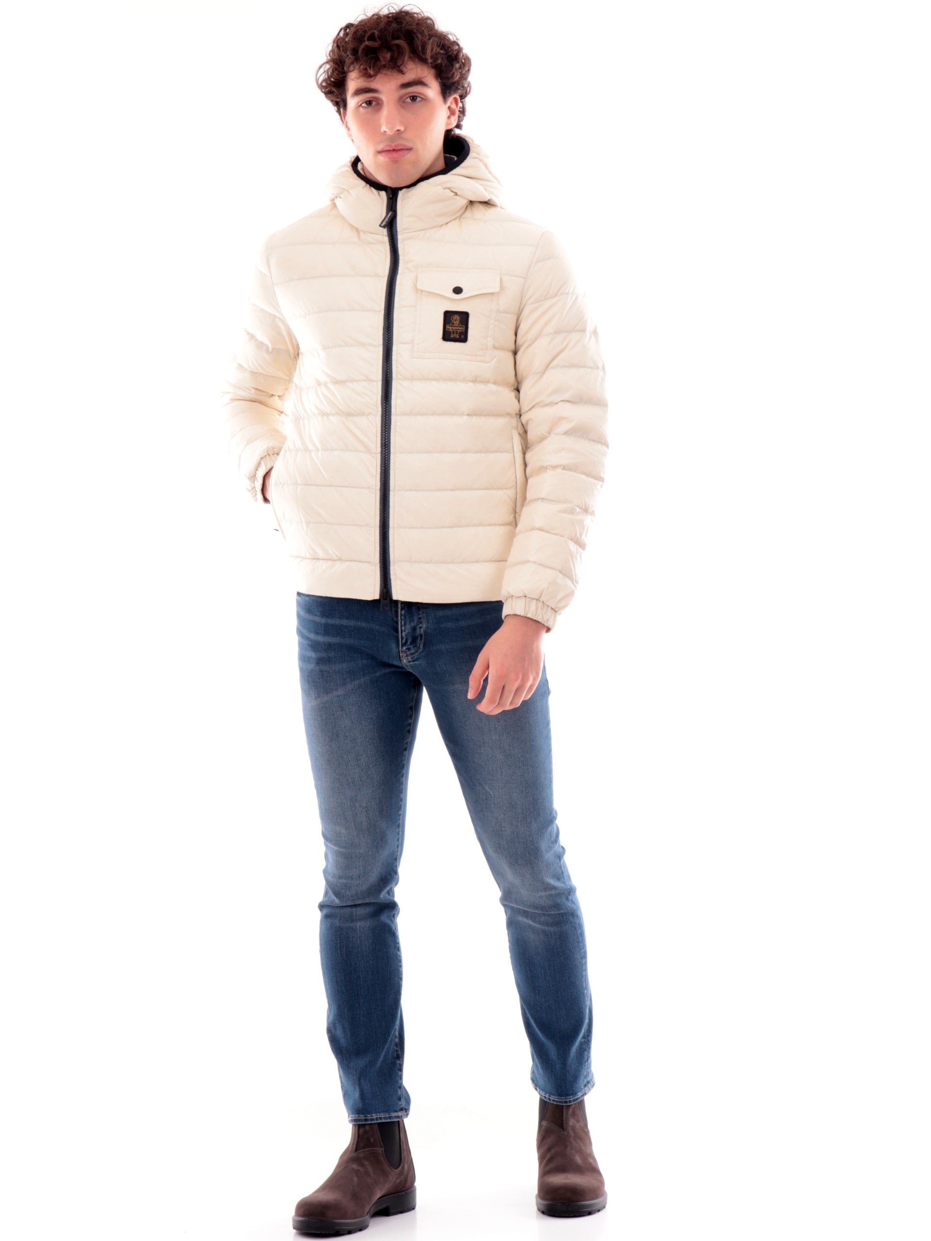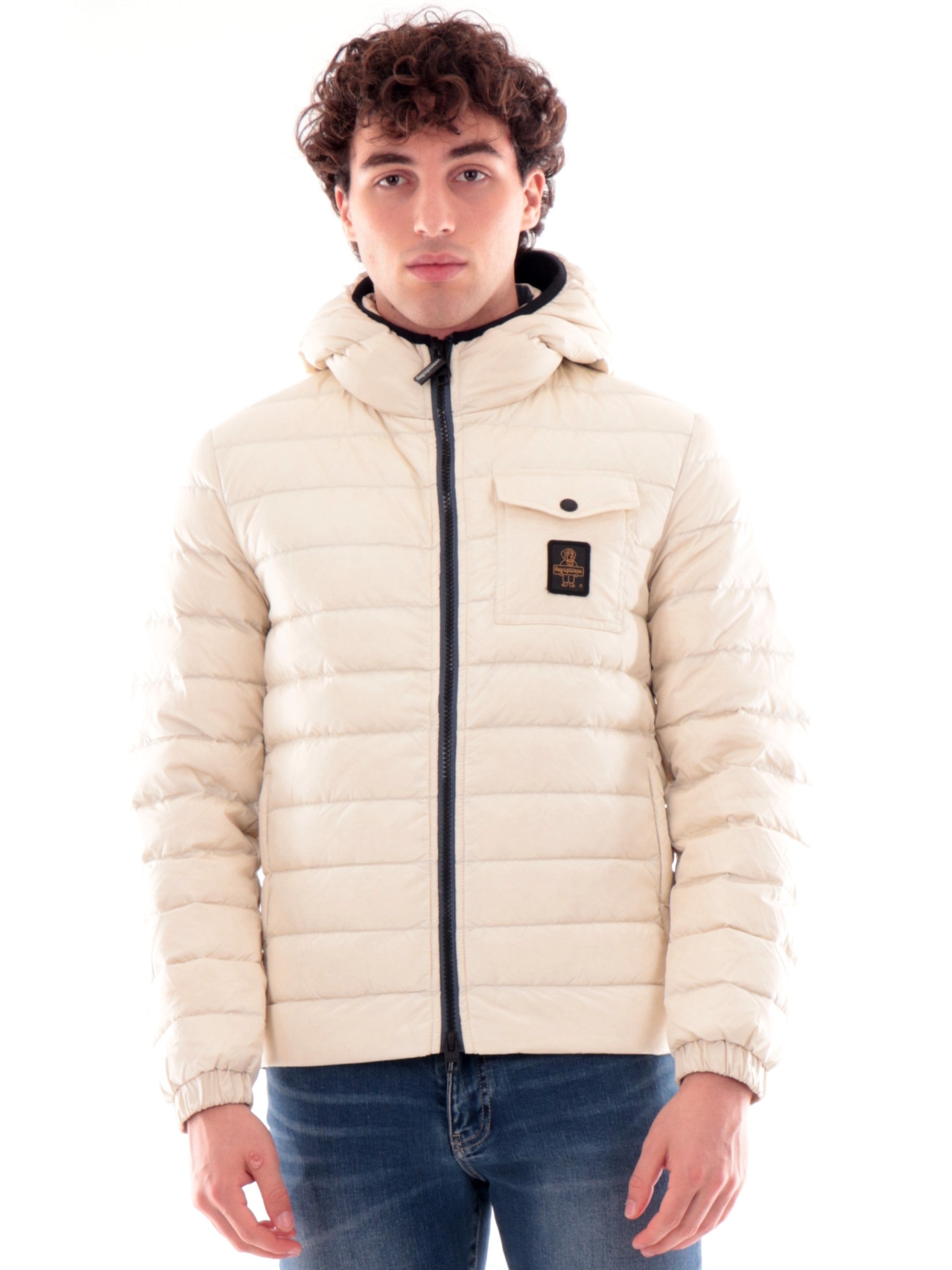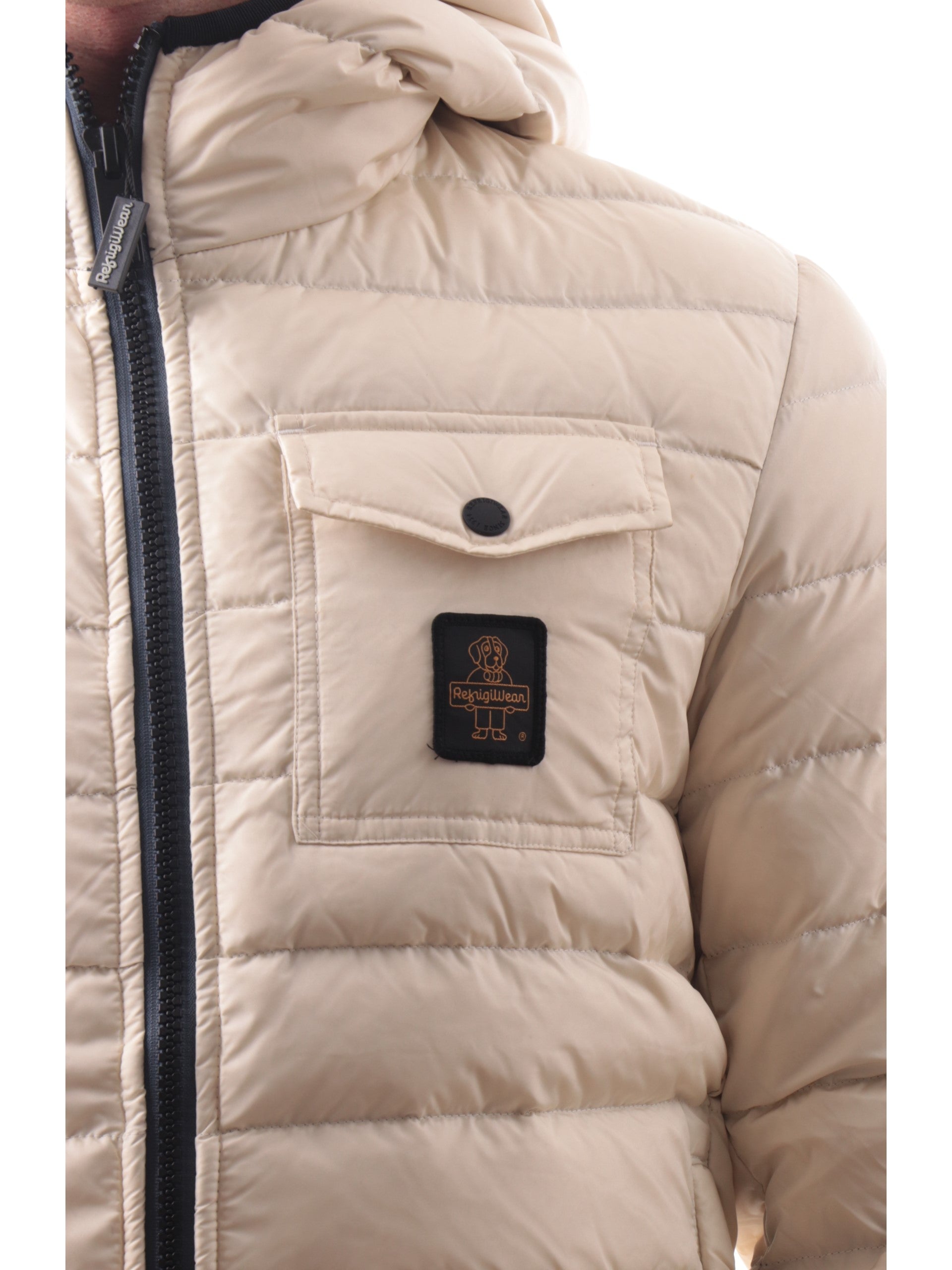 Giacca Refrigiwear Hunter bianca da uomo full zip con cappuccio G92708, realizzato con imbottitura in piuma naturale. Questo giubbotto Refrigiwear bianco ha il cappuccio fisso con banda elastica, la chiusura full zip centrale, due tasche laterali con zip, un taschino con patta, polsini elasticizzati e il patch del brand cucito sul cuore a contrasto colore.