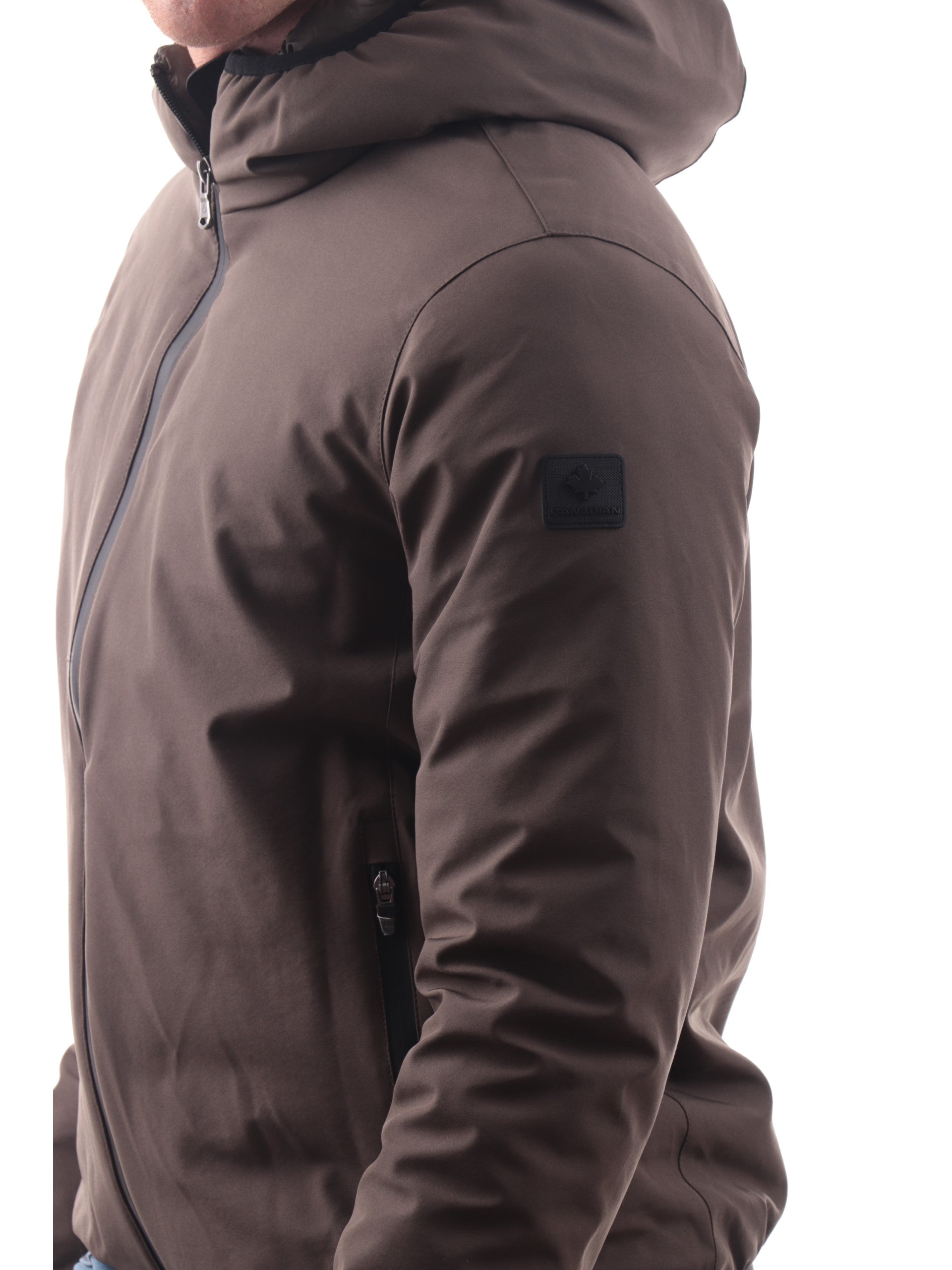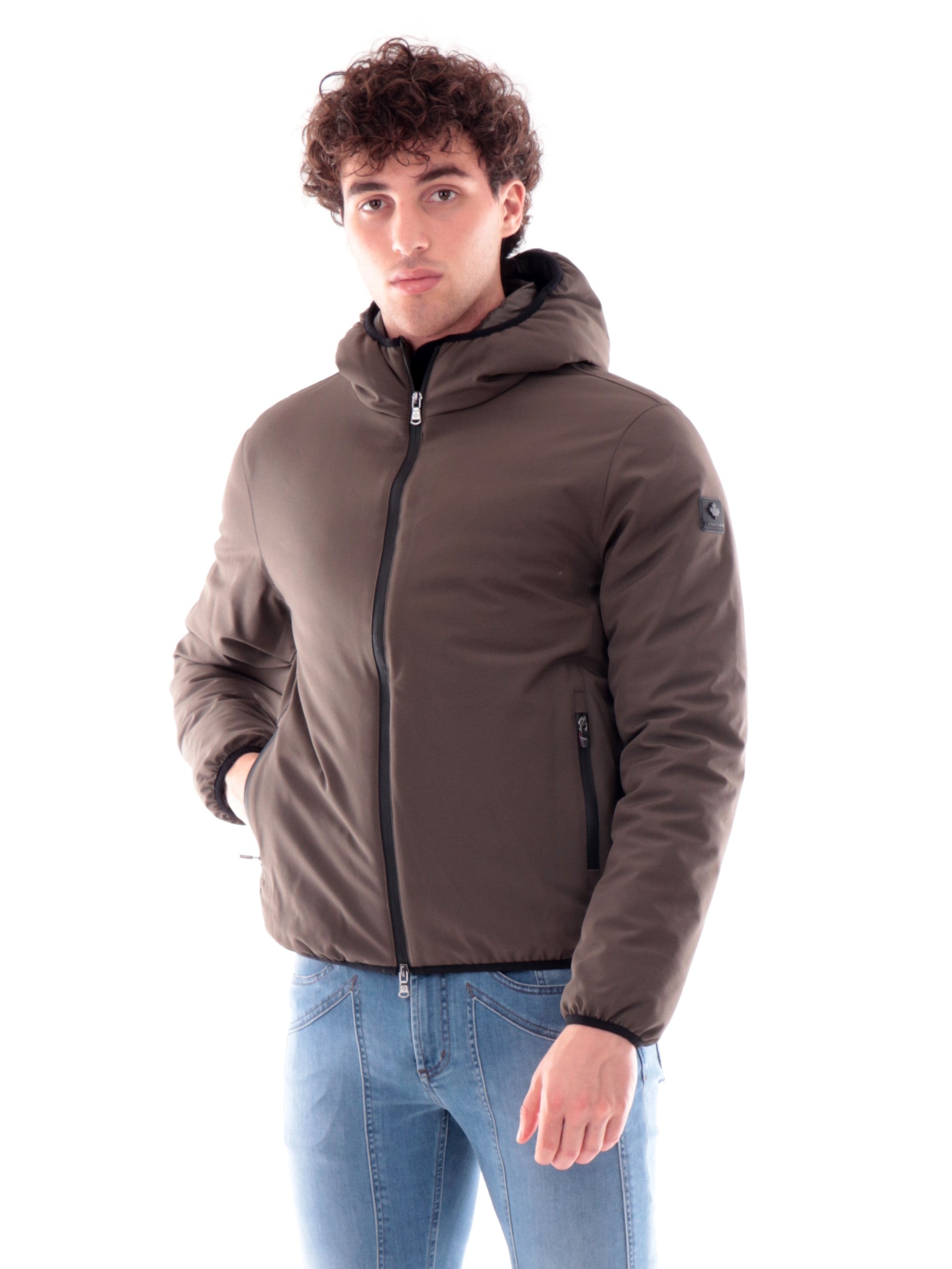 Piumino Canadian Yorkton verde da uomo tessuto tecnico. Questa giacca Canadian verde è realizzata da un tessuto tecnico, caratterizzata da cappuccio fisso, due tasche laterali e chiusura zip, polsinielasticizzati e fondo regolare, il logo stampato in gomma sulla manica sinistra, all'interno troviamo l'imbottitura piumina che rende questa giacca ancora più calda e una tasca con zip