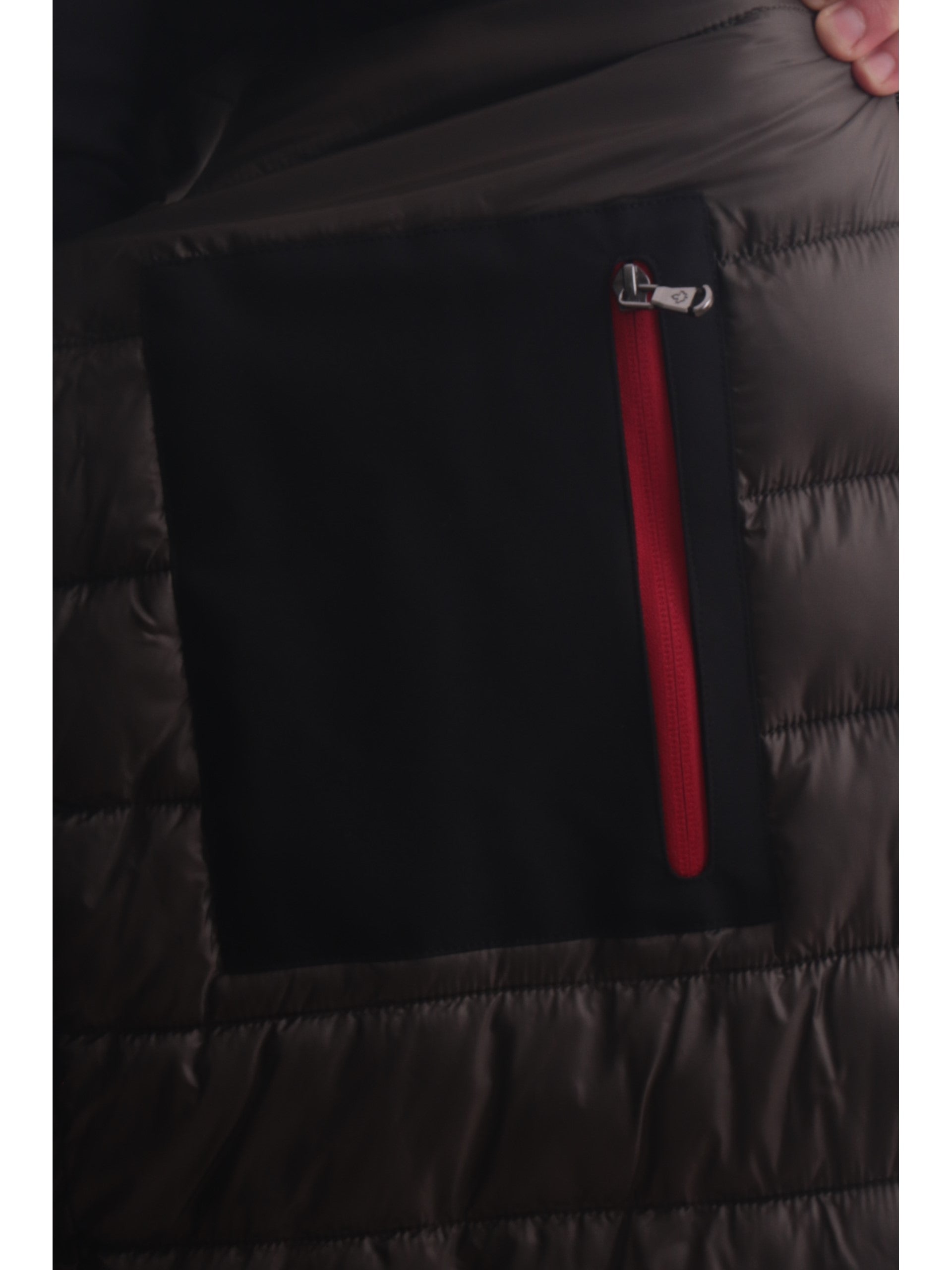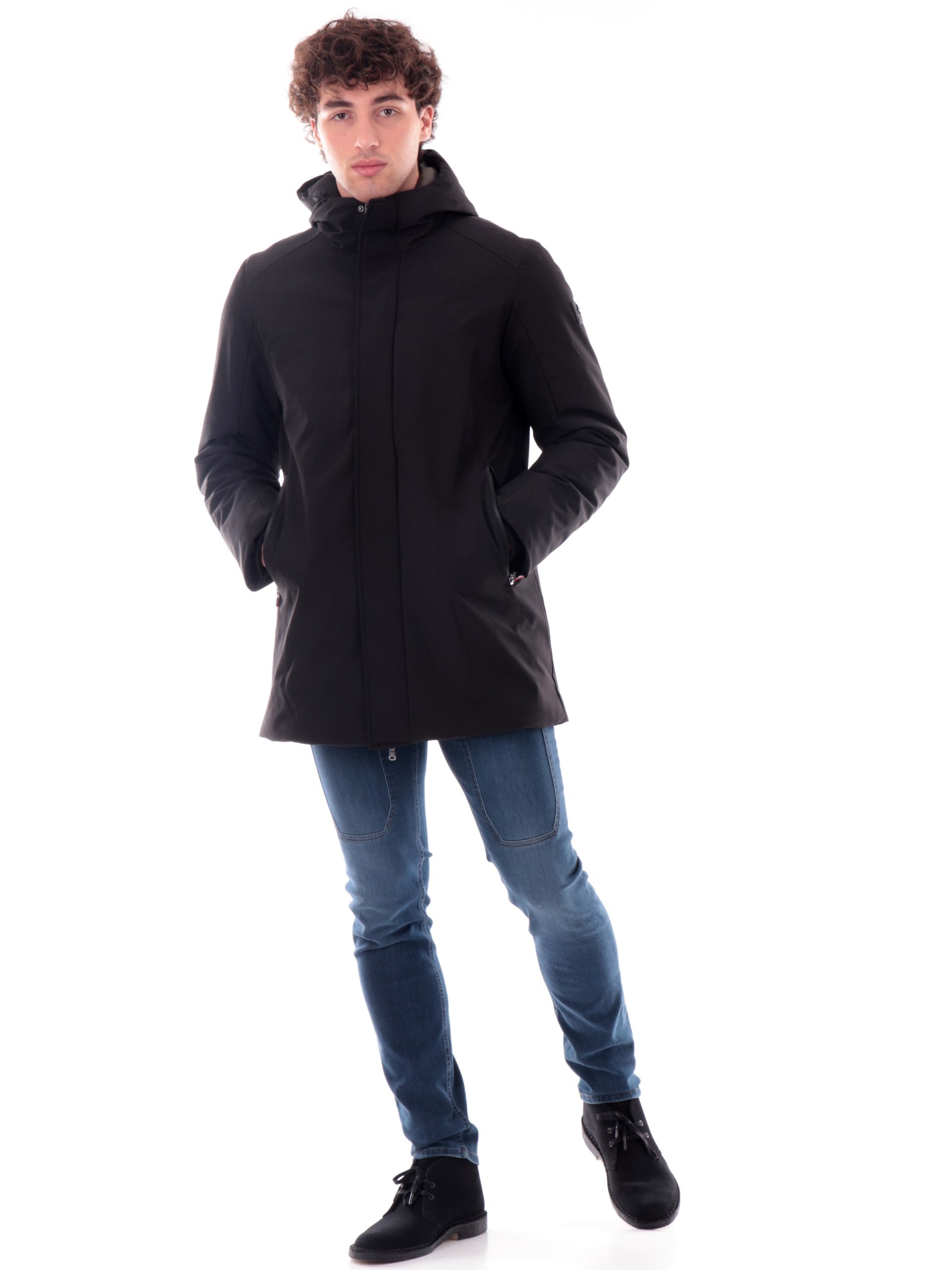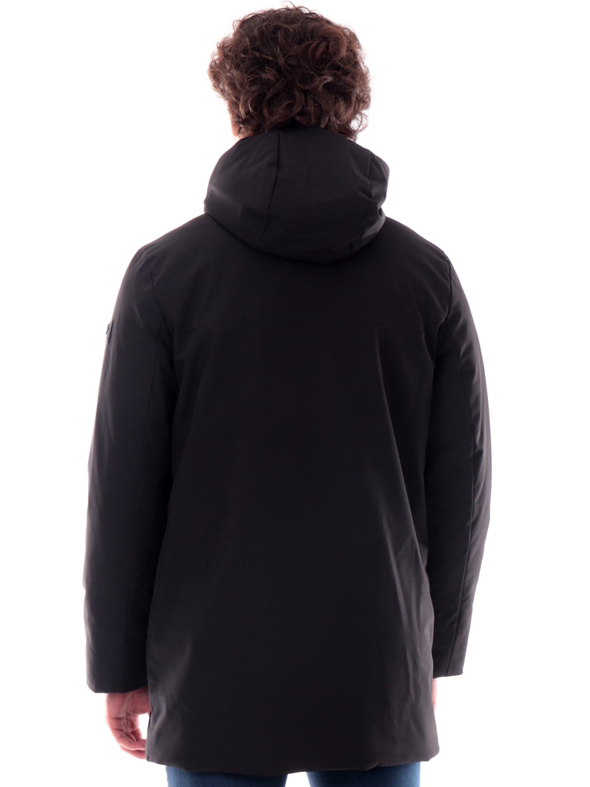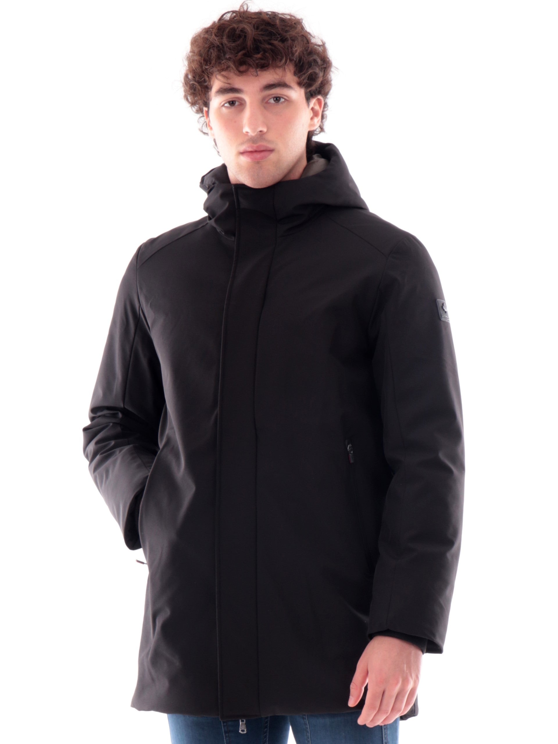 Cappotto Canadian nero Parka City 5 da uomo tessuto tecnico, realizzato con imbottitura eco-friendly. Questa giacca lunga Canadian nera ha il cappuccio fisso, la chiusura full zip centrale nascosta da una patta con bottoni automatici, due tasche laterali e il patch del brand applicato sulla manica sinistra. All'interno di questo giubbino troviamo ance una tasca con la chiusura a zip. Questo cappotto Canadian è caldo ed avvolgente perfetto per la stagione invernale.