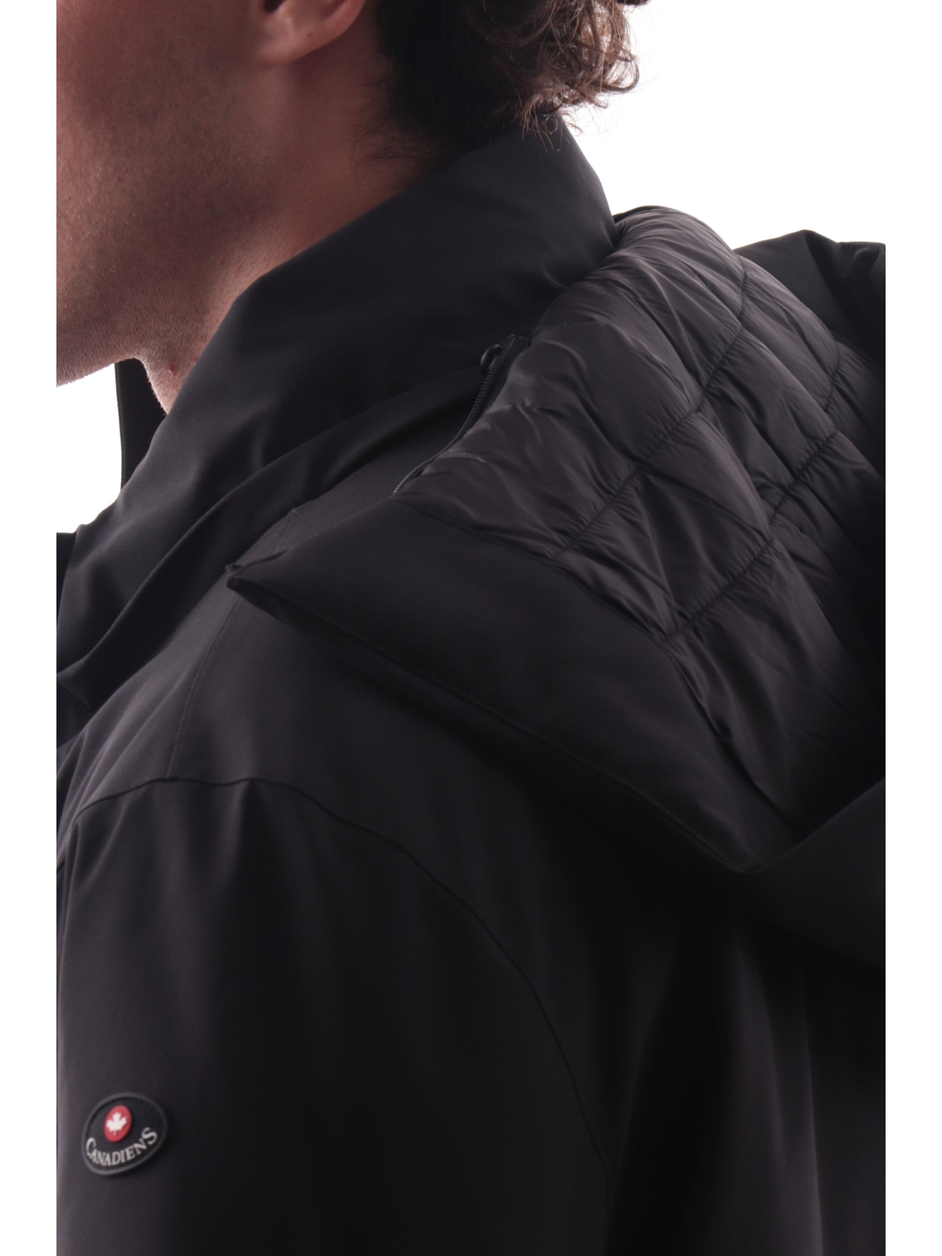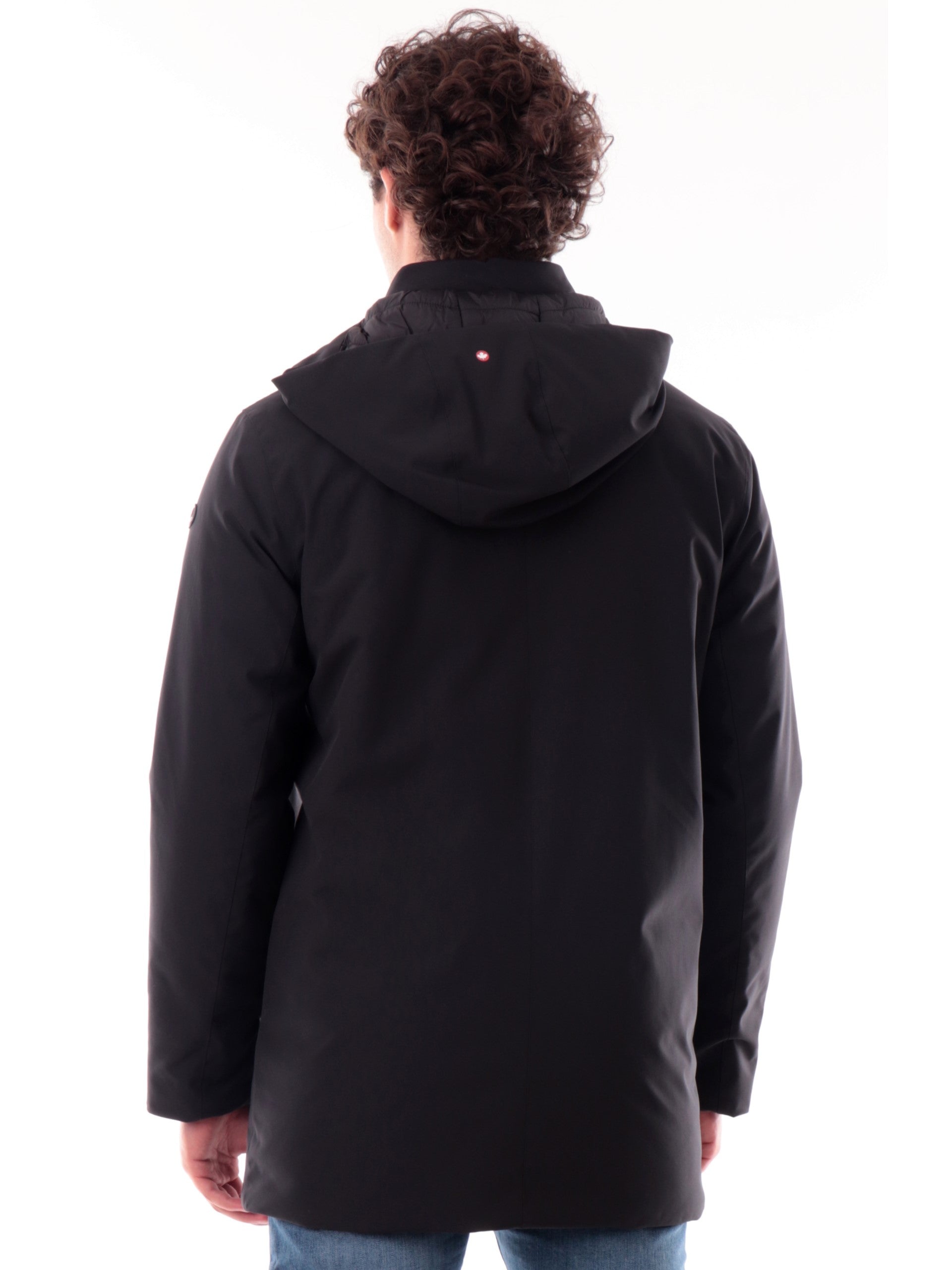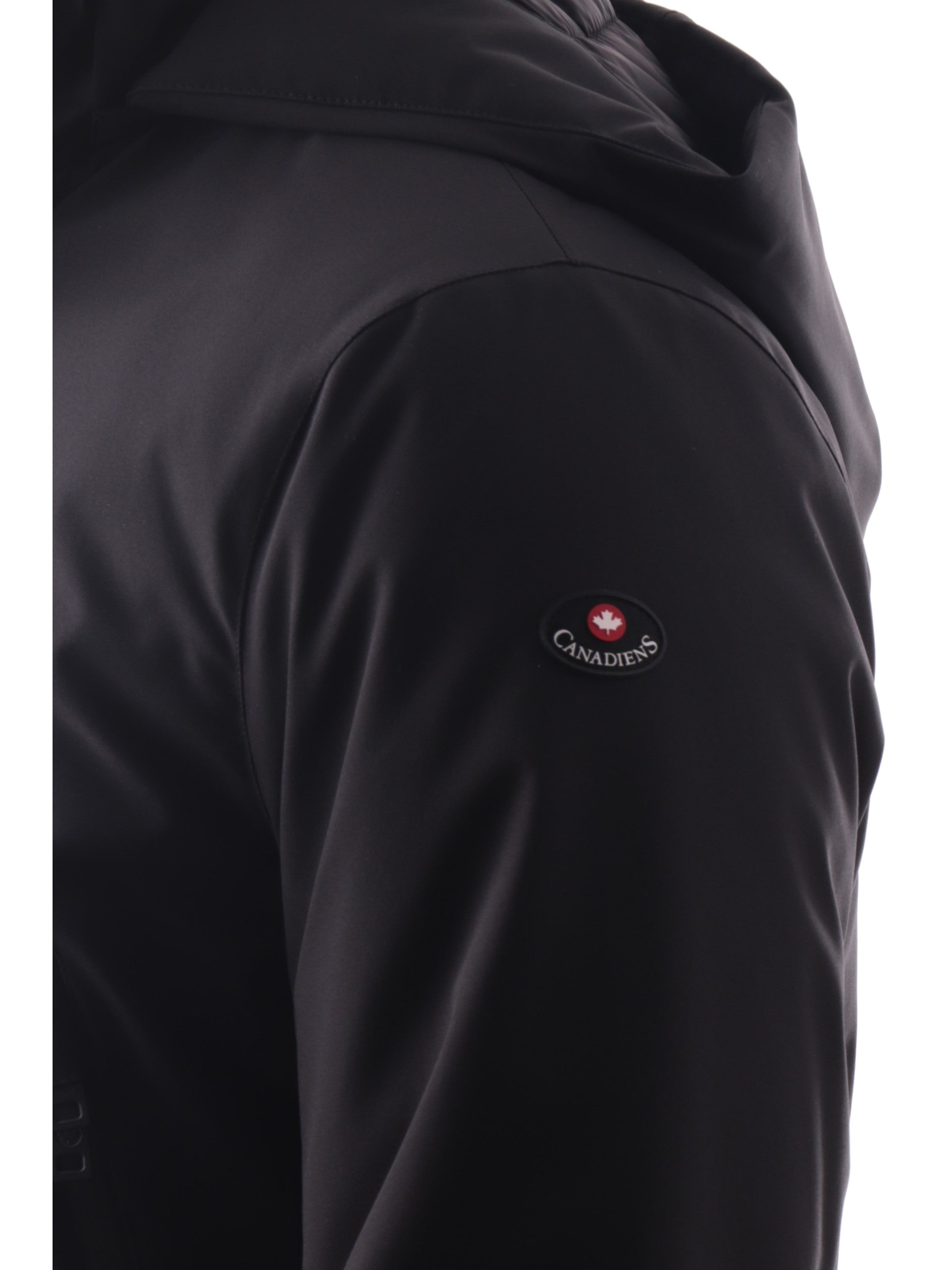 Cappotto Canadiens nero da uomo full zip con cappuccio 0.10 Tech 2.0 CAP05200N9750, realizzato con imbottitura eco-friendly. Questa giacca Canadiens nera ha il cappuccio rimovibile, la chiusura full zip centrale nascosta da una patta con bottoni automatici, due tasconi laterali con zip e il patch gommato applicato sul lato sinistro.