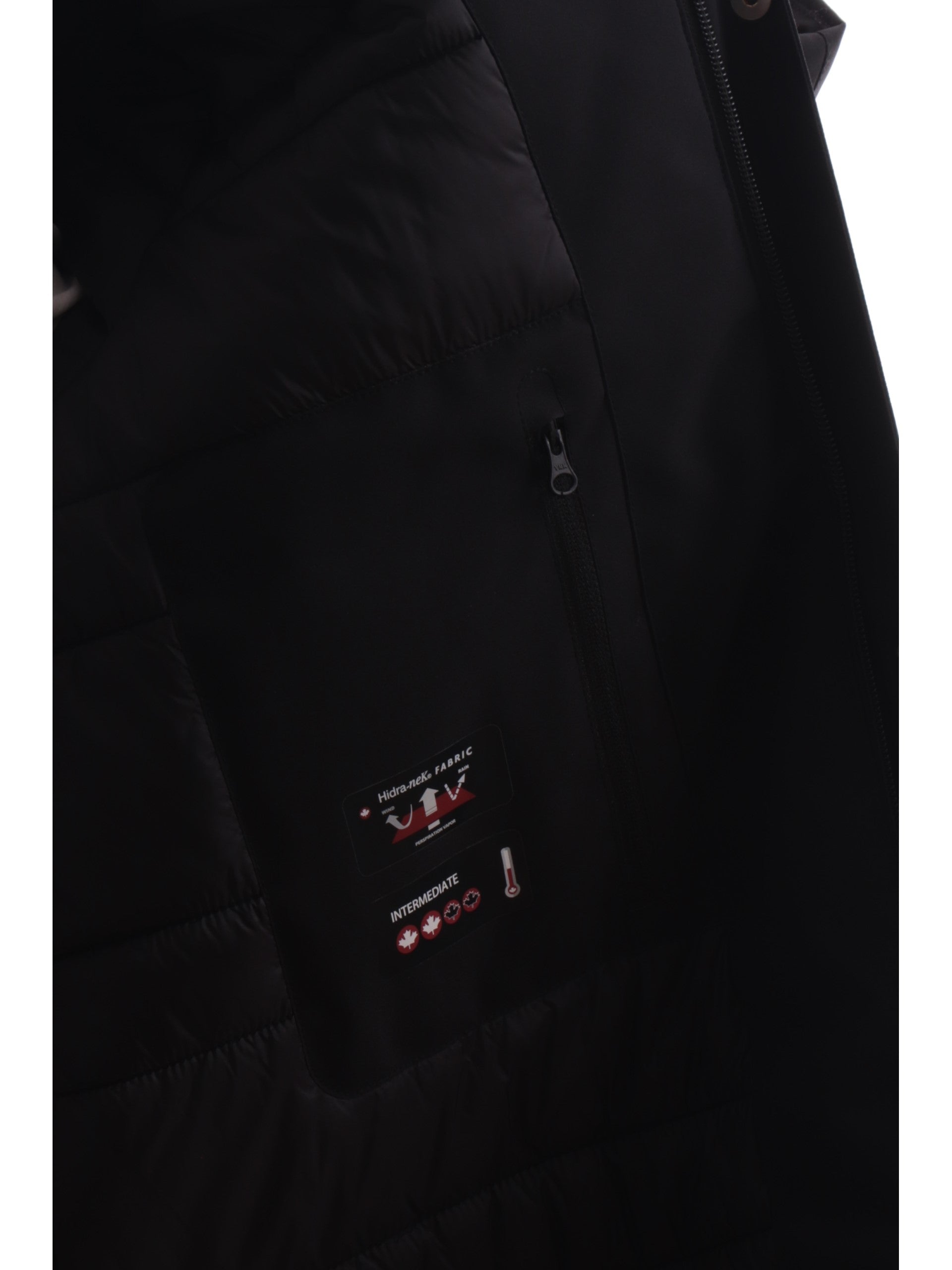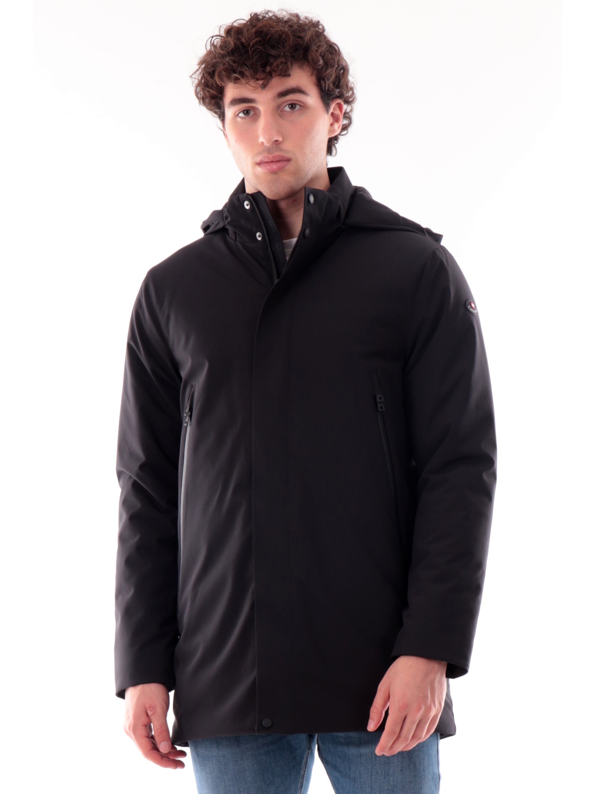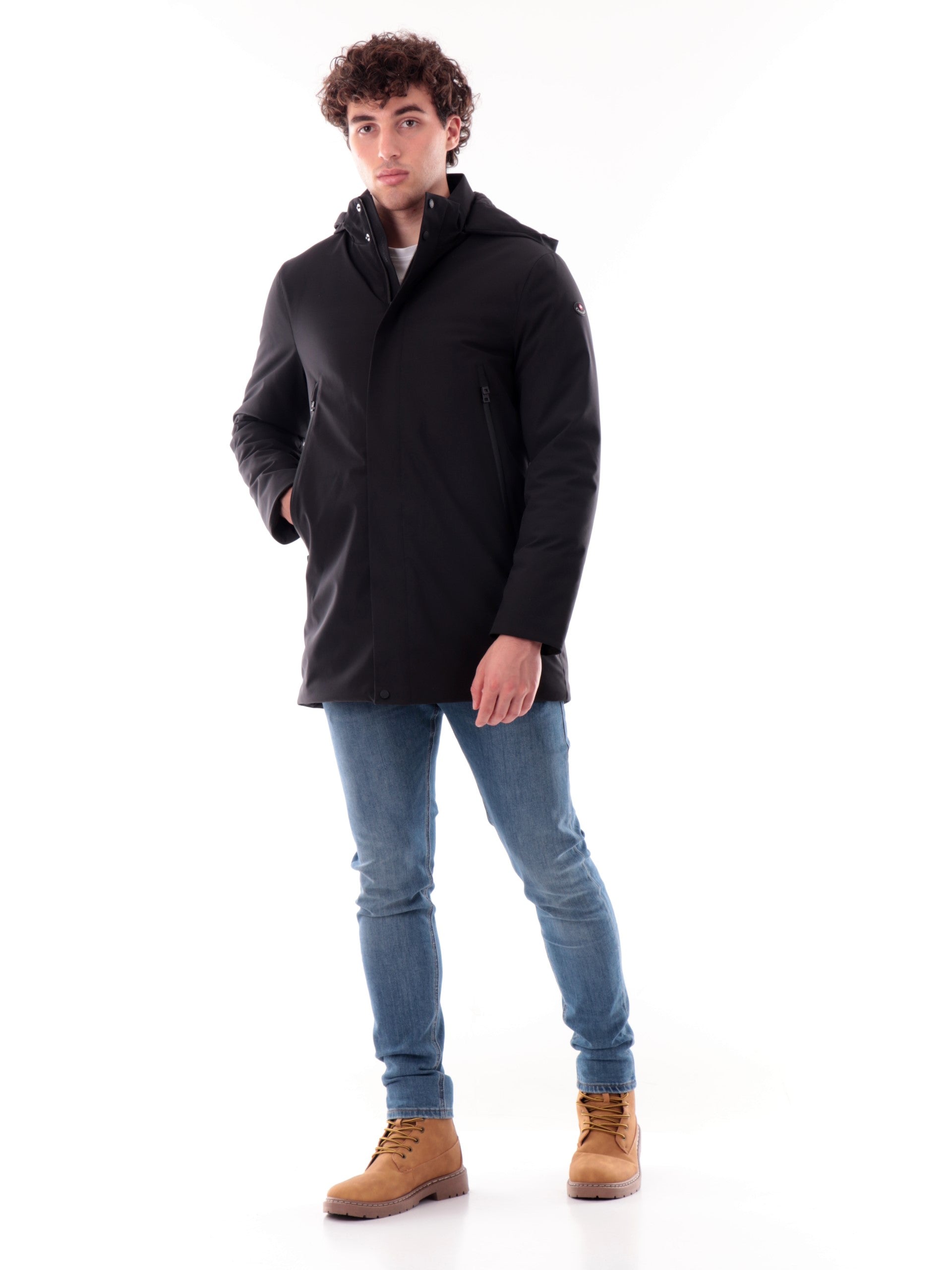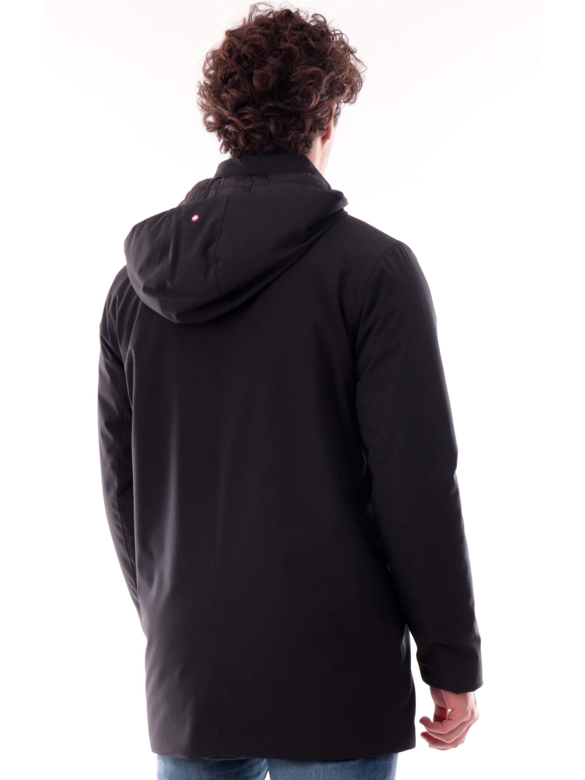 Cappotto Canadiens nero da uomo full zip con cappuccio 0.10 Tech 2.0 CAP05200N9750, realizzato con imbottitura eco-friendly. Questa giacca Canadiens nera ha il cappuccio rimovibile, la chiusura full zip centrale nascosta da una patta con bottoni automatici, due tasconi laterali con zip e il patch gommato applicato sul lato sinistro.