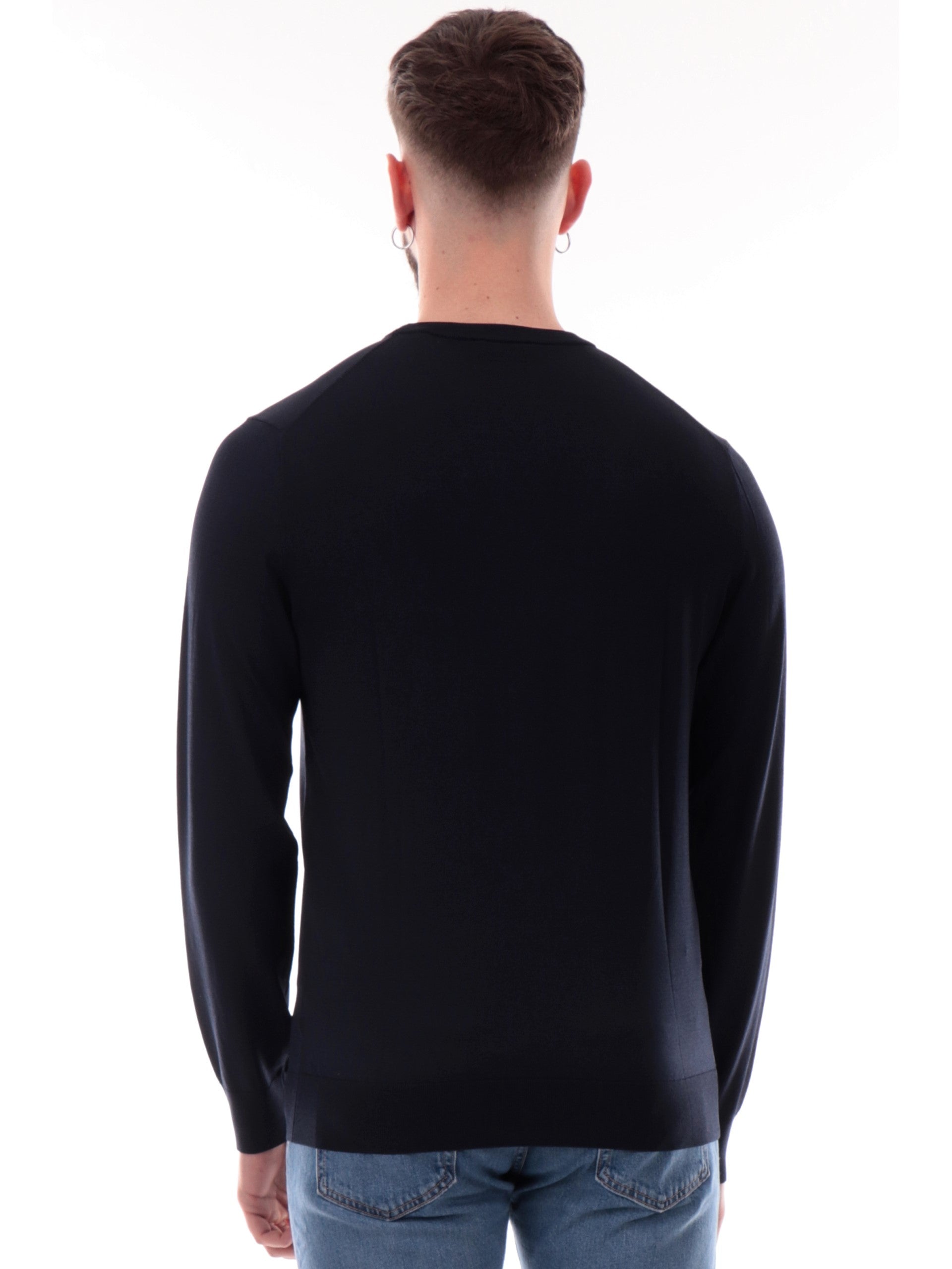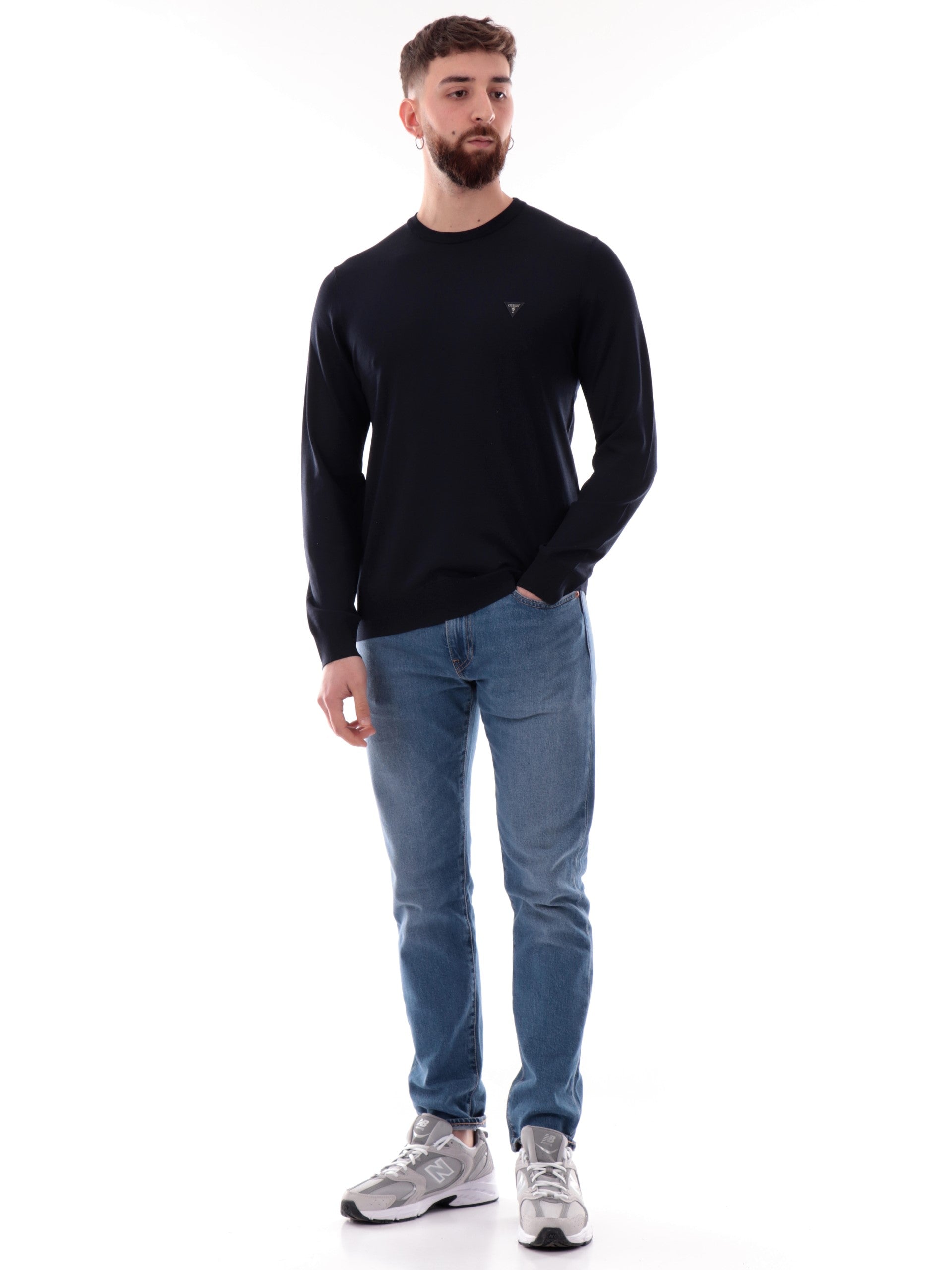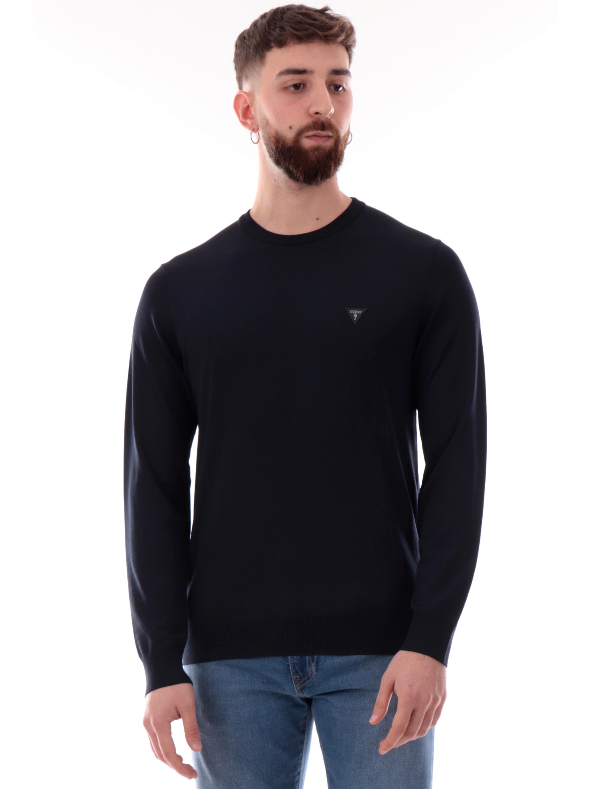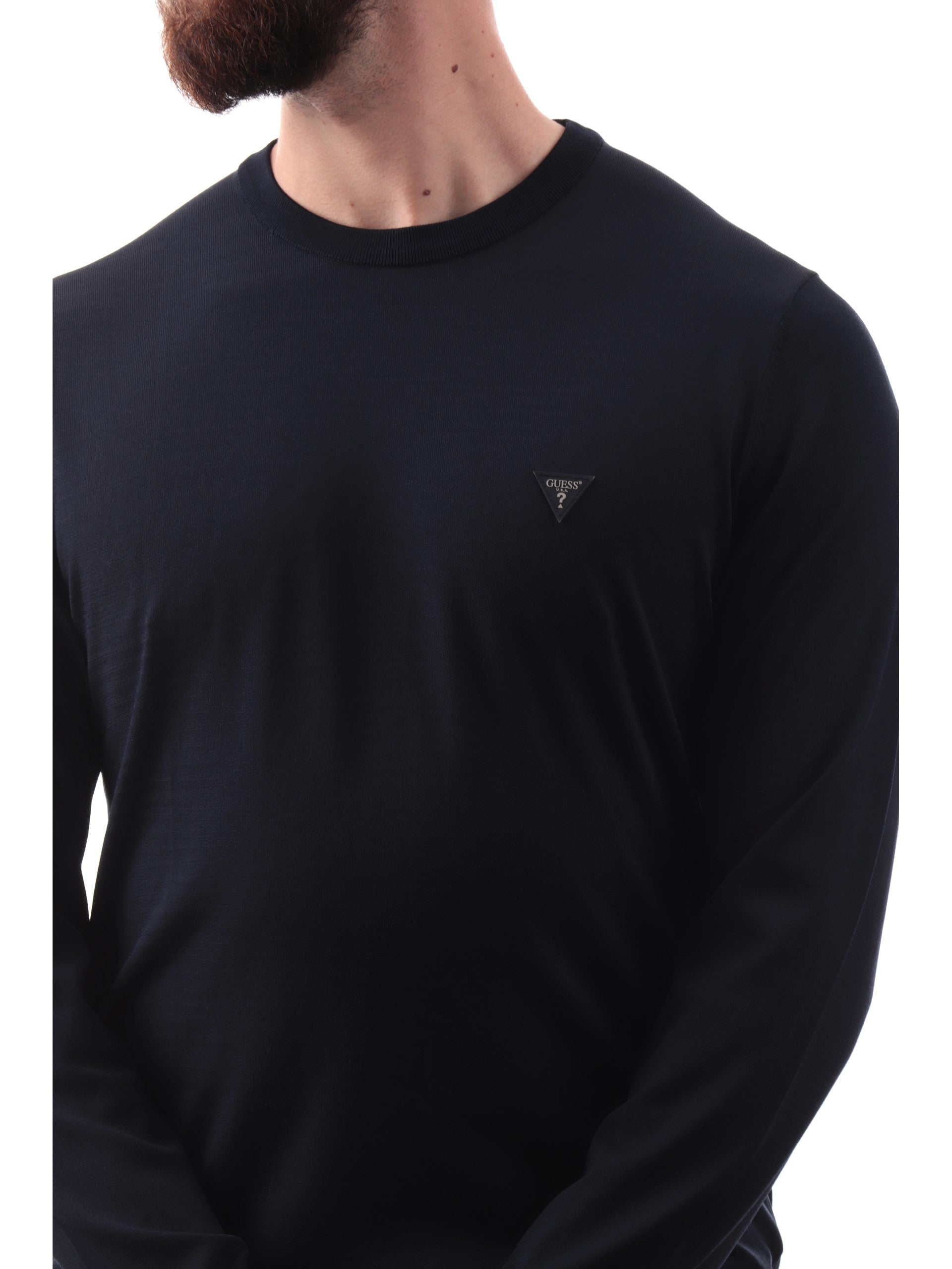 Maglione Guess Dane Tech blu da uomo patch Guess gommato M4YR29Z3DM0, realizzato in viscosa. Questo maglione uomo Guess blu girocollo ha le maniche lunghe, il patch Guess gommato applicato lato cuore, polsini e fondo elasticizzati.