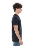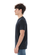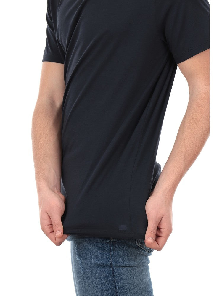 T-shirt da uomo AX tinta unita in morbidissimo cotone Pima di colore blu. Questa maglietta ha lo scollo a coste, le maniche corte e il logo riportato in piccolo, in basso a sinistra.