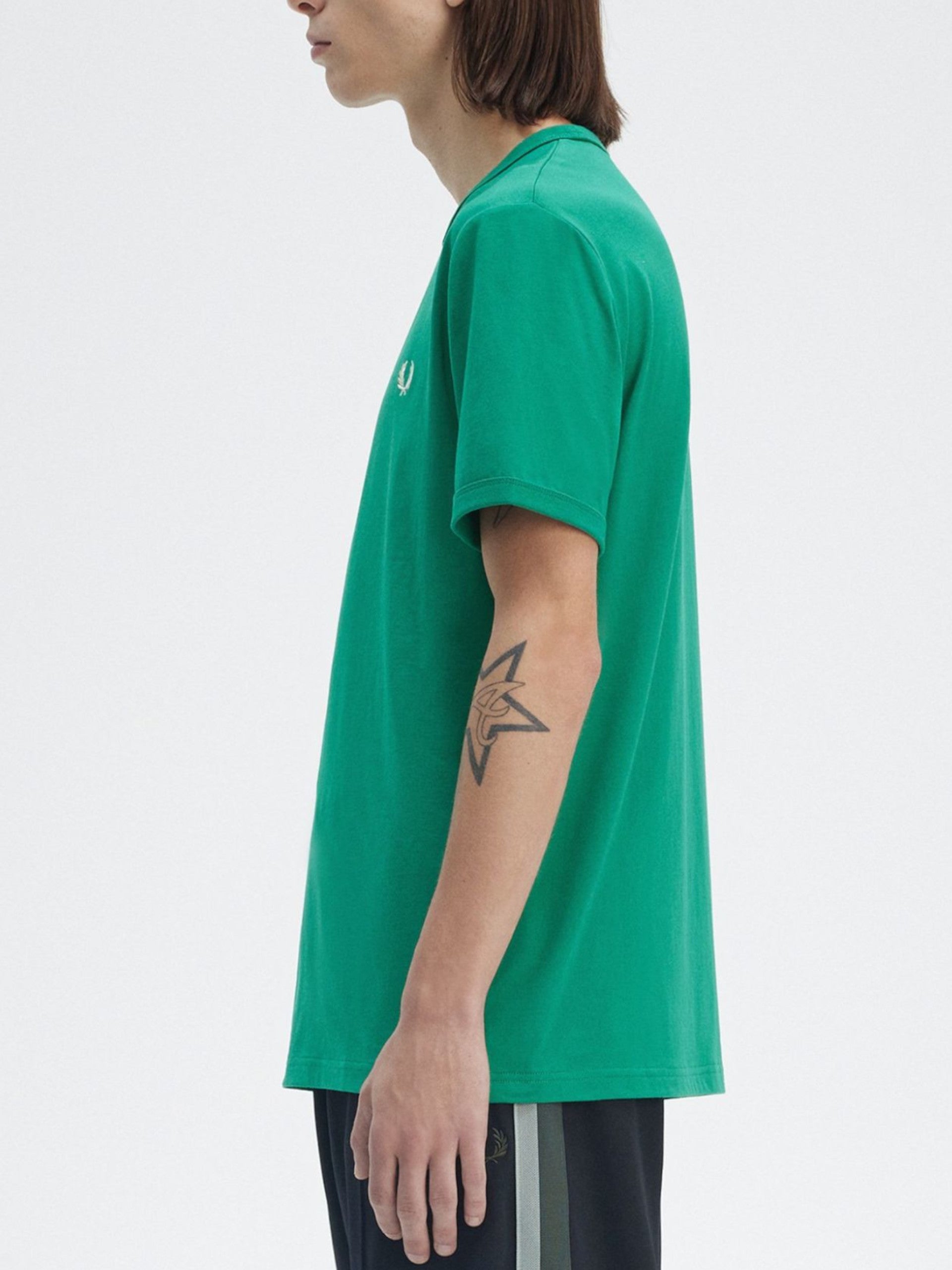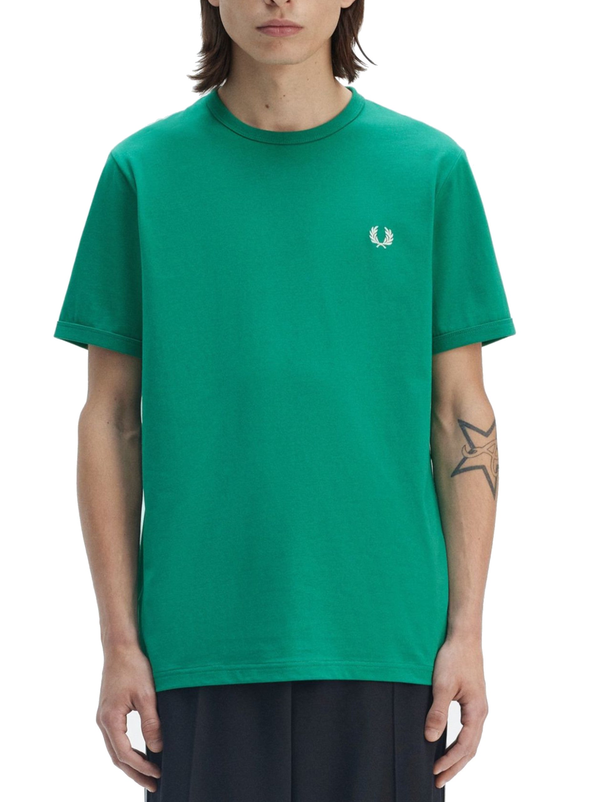 T-shirt Fred Perry verde da uomo in jersey di cotone a manica corta. Questa maglietta Fred Perry da uomo grazie alla morbidezza e alla traspirabilità che la caratterizza è la maglia essenziale in ogni guardaroba. Questa T-Shirt Ringer della Fred Perry, ha un design pulito e lineare, con rifiniture a coste sul colletto e nel bordo manica. Il logo con la corona d'alloro su questa maglietta Fred Perry da uomo è ricamato a contrasto sul lato sinistro all'altezza del petto.